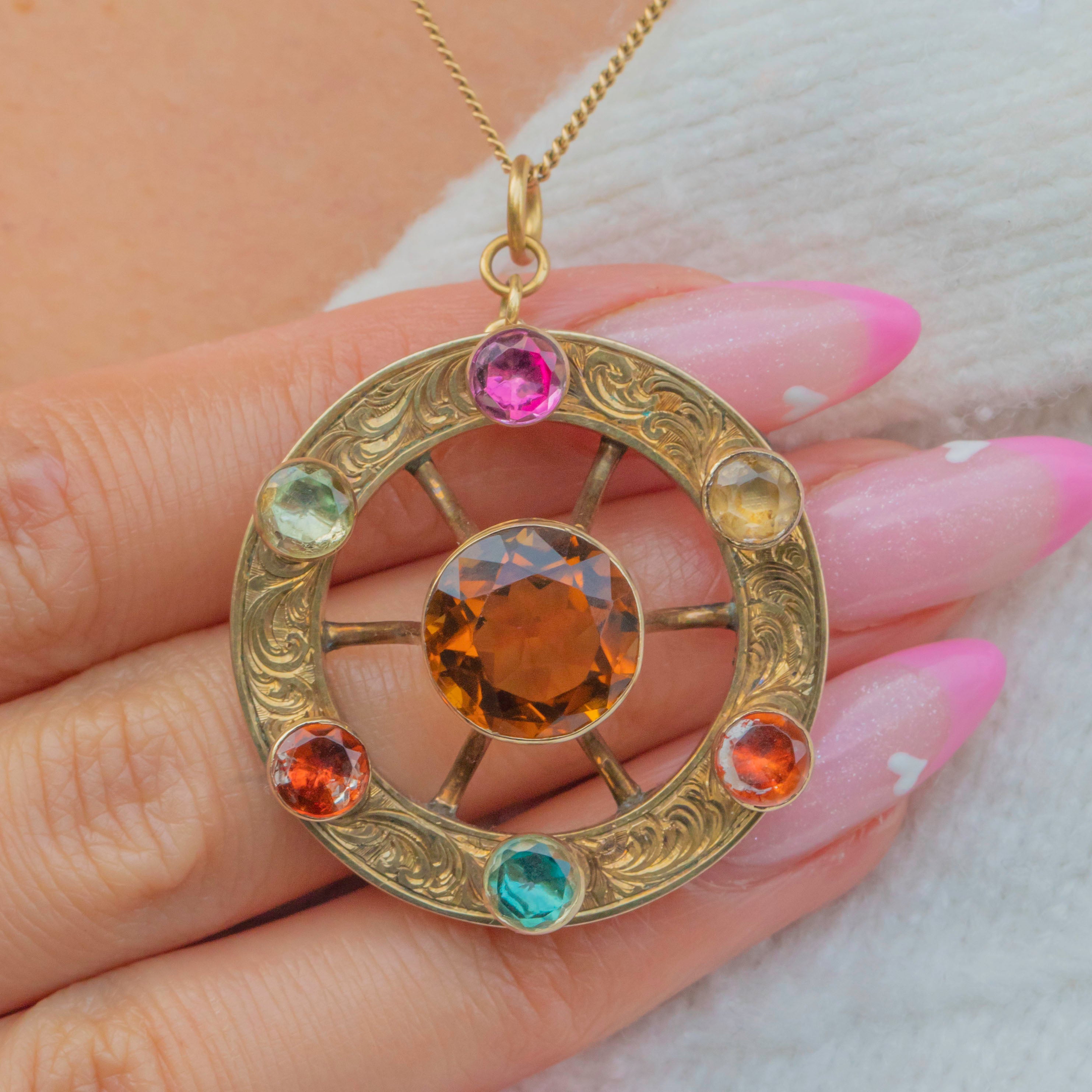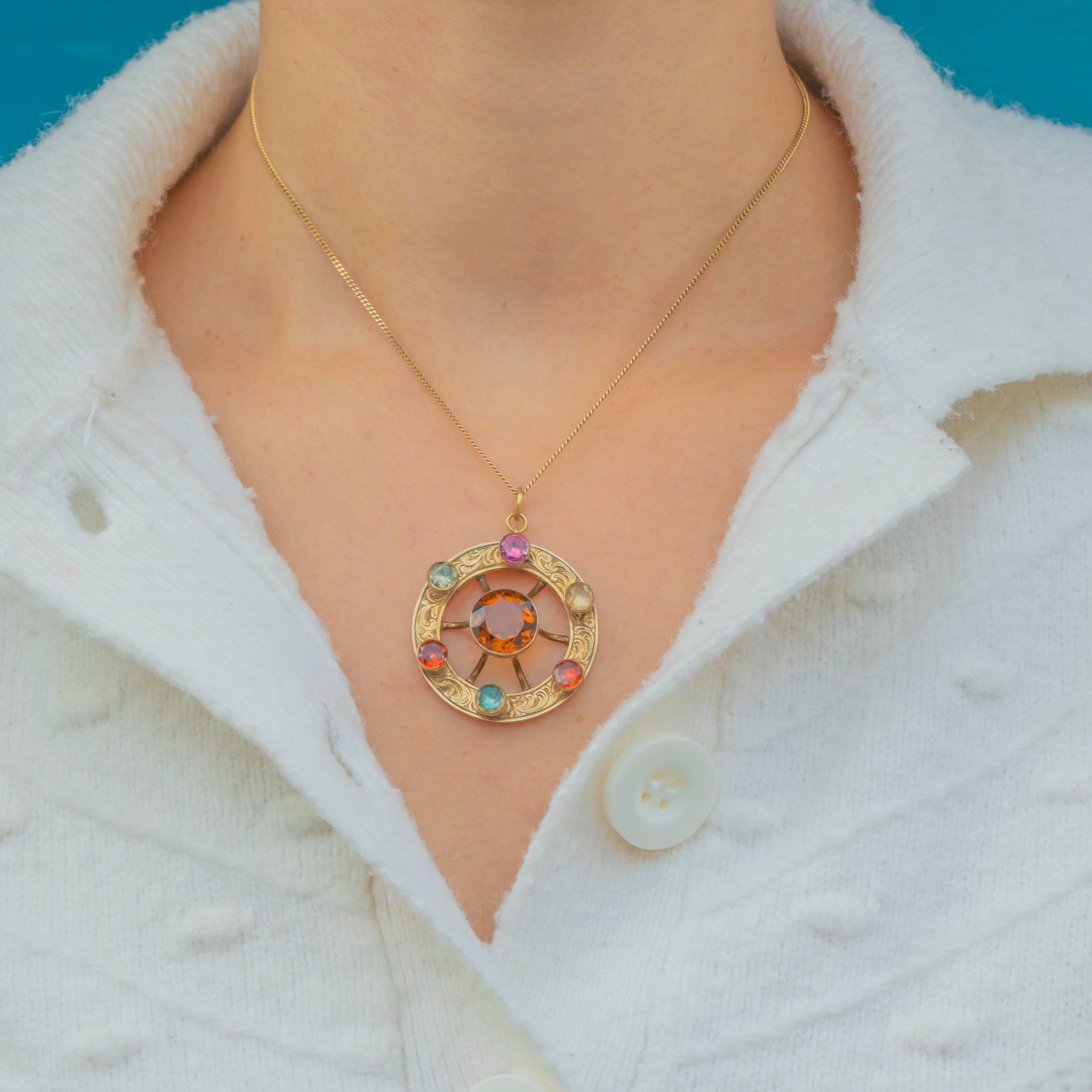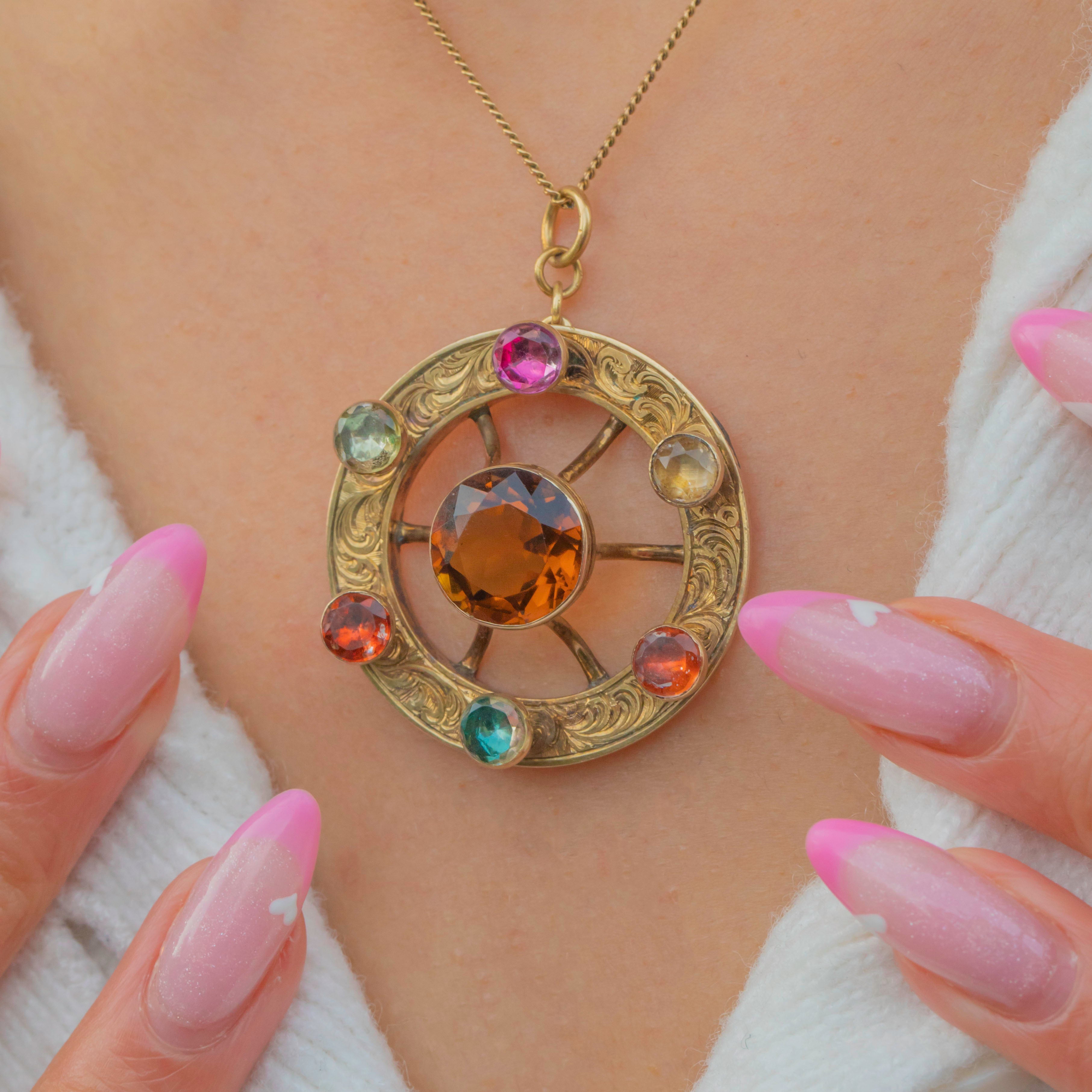 The central Citrine has a delicious marmalade hue, and the Paste gemstones add a playful pop of colour. With an engraved border finishing this antique Gold pendant off, you can't help but adore this Victorian masterpiece!
