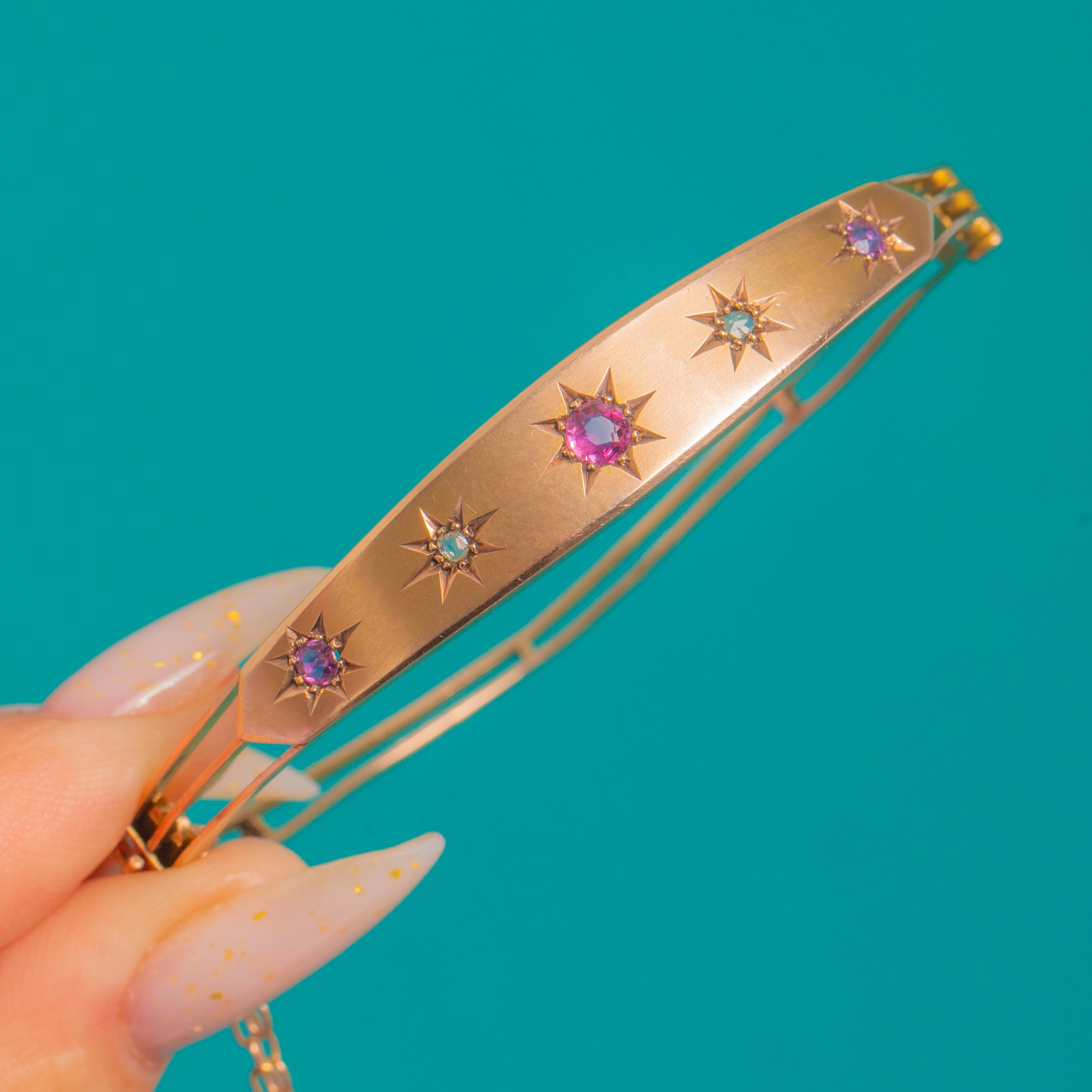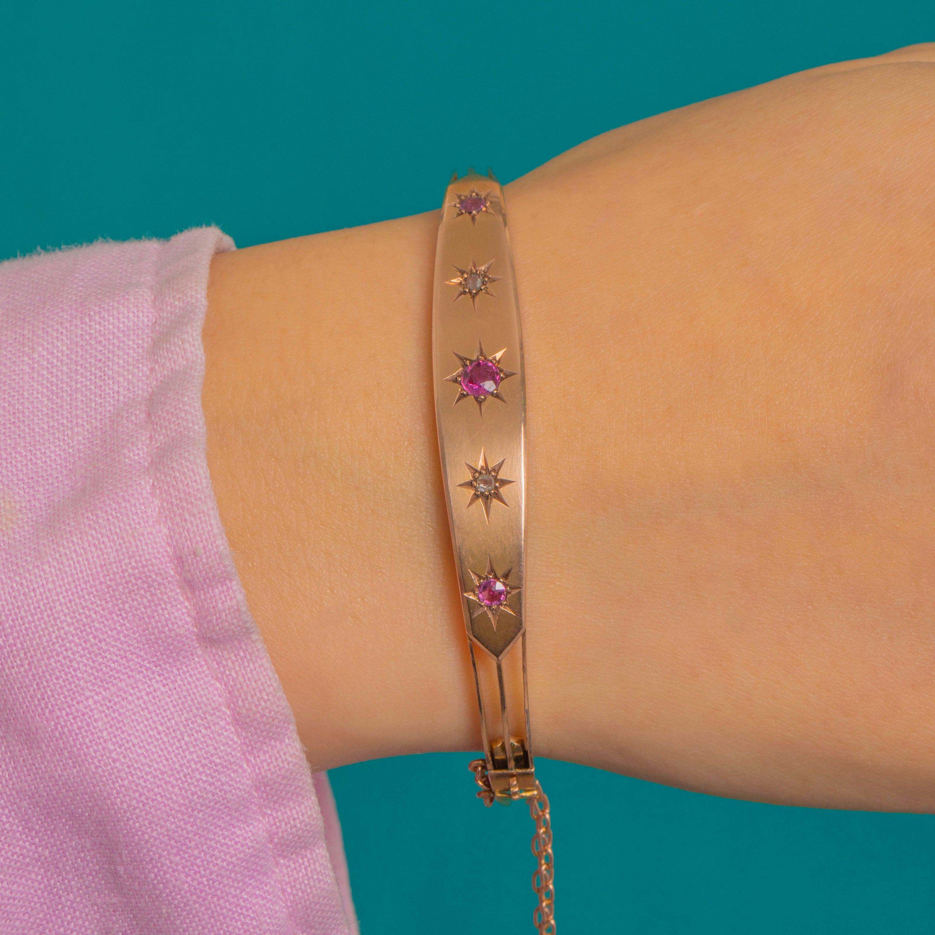 A refined Victorian hinged bangle in glowing 9ct Gold, its central plaque kissed with a linear constellation of gypsy-set Rubies and Diamonds. Each round gemstone sits within an engraved eight-point star, creating that quintessential celestial sparkle against a sleek, polished ground.