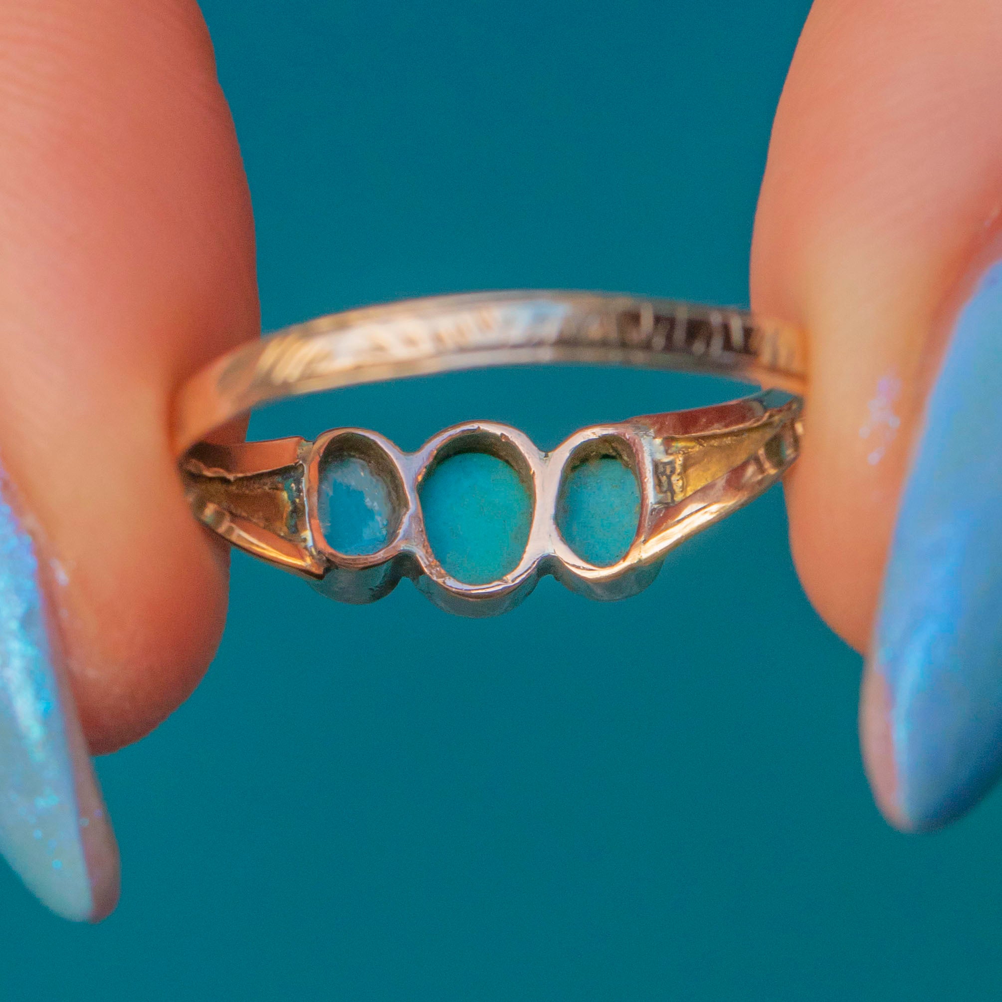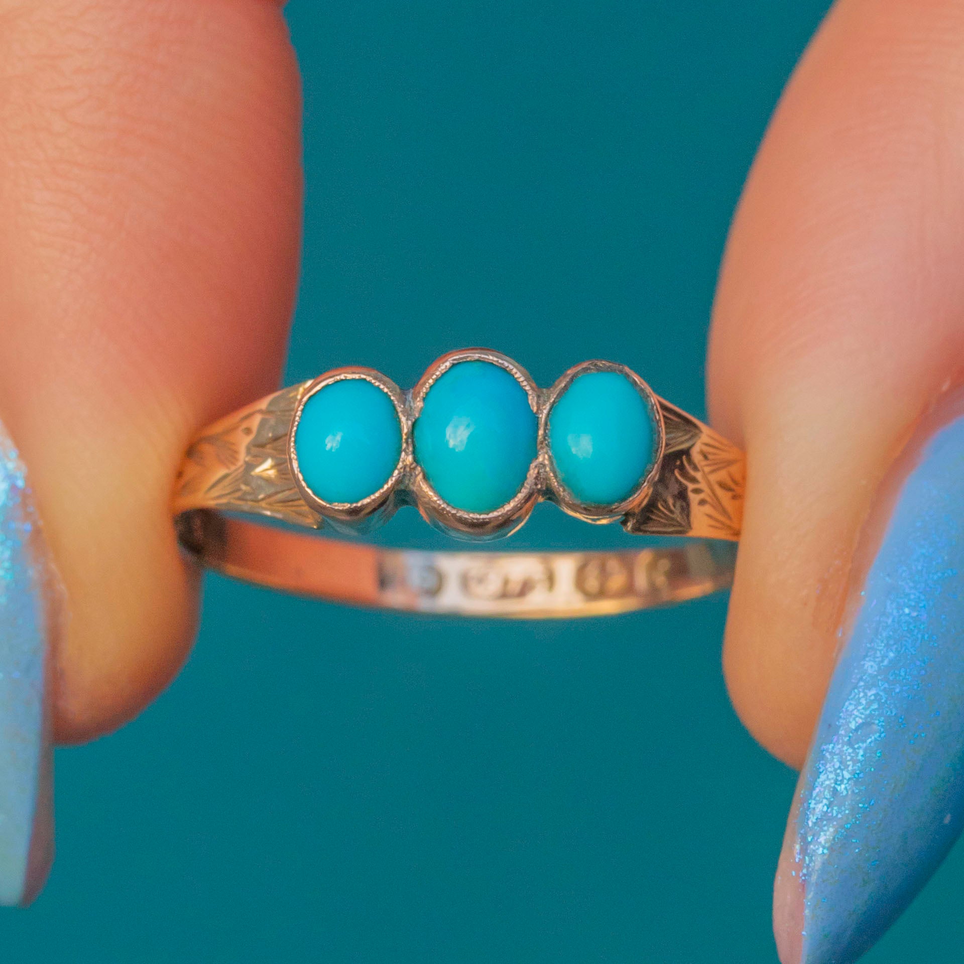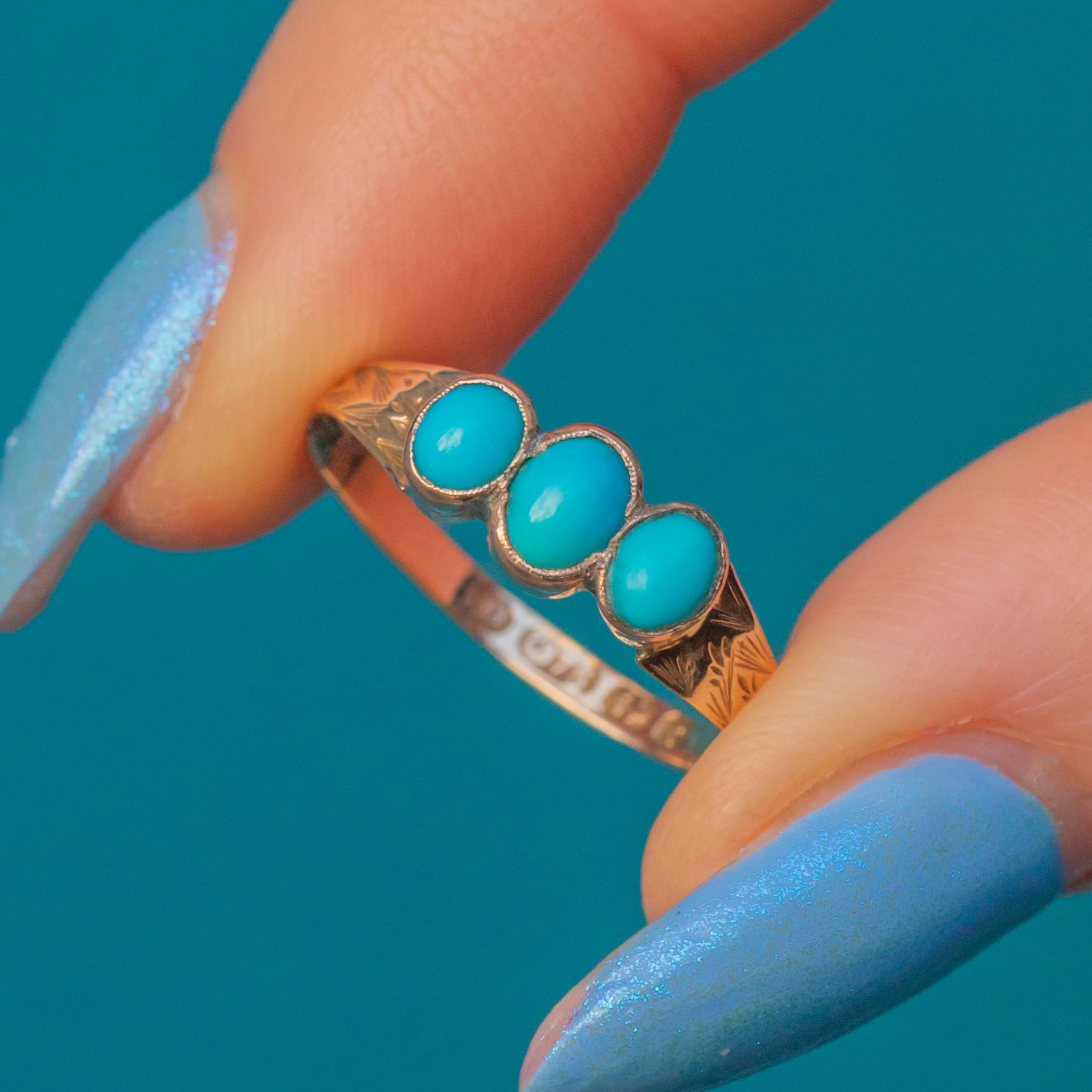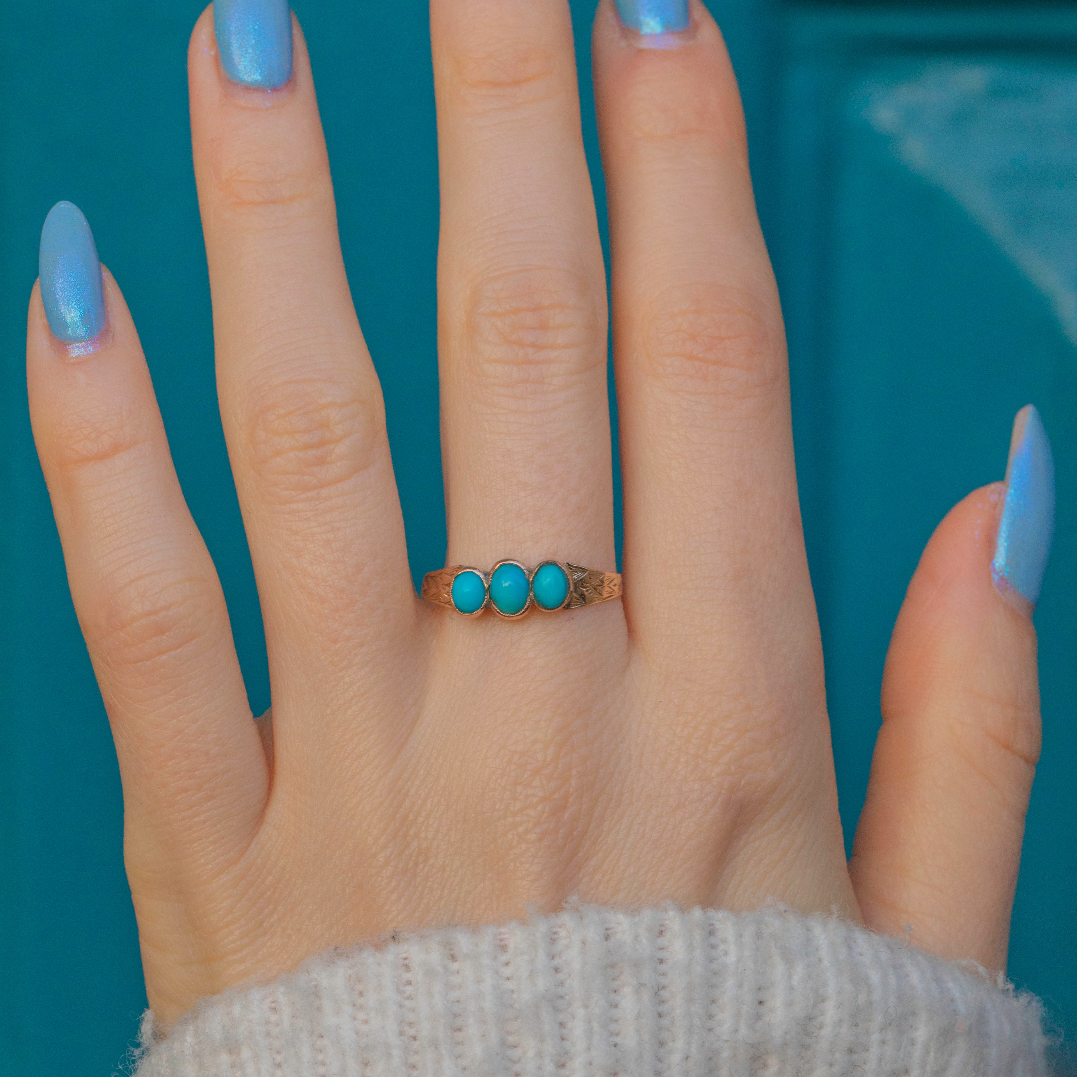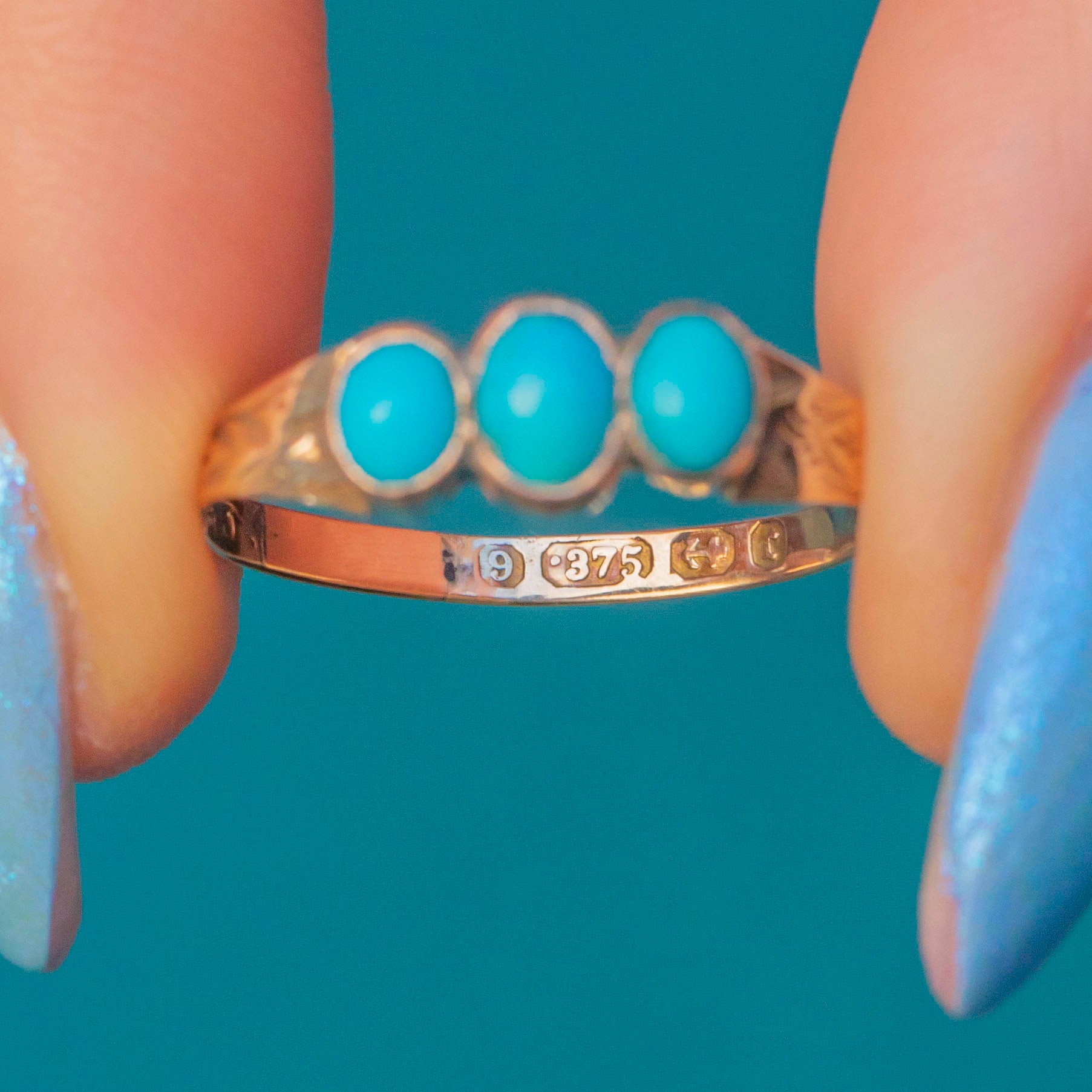 EXCELLENT. This Victorian 9ct Gold Turquoise three stone ring is in wonderful condition. Each Turquoise stone is free from scuffs or scratches and sits securely within its bezel. Her engravings are crisp and intact and with little else to note, she is in excellent condition.