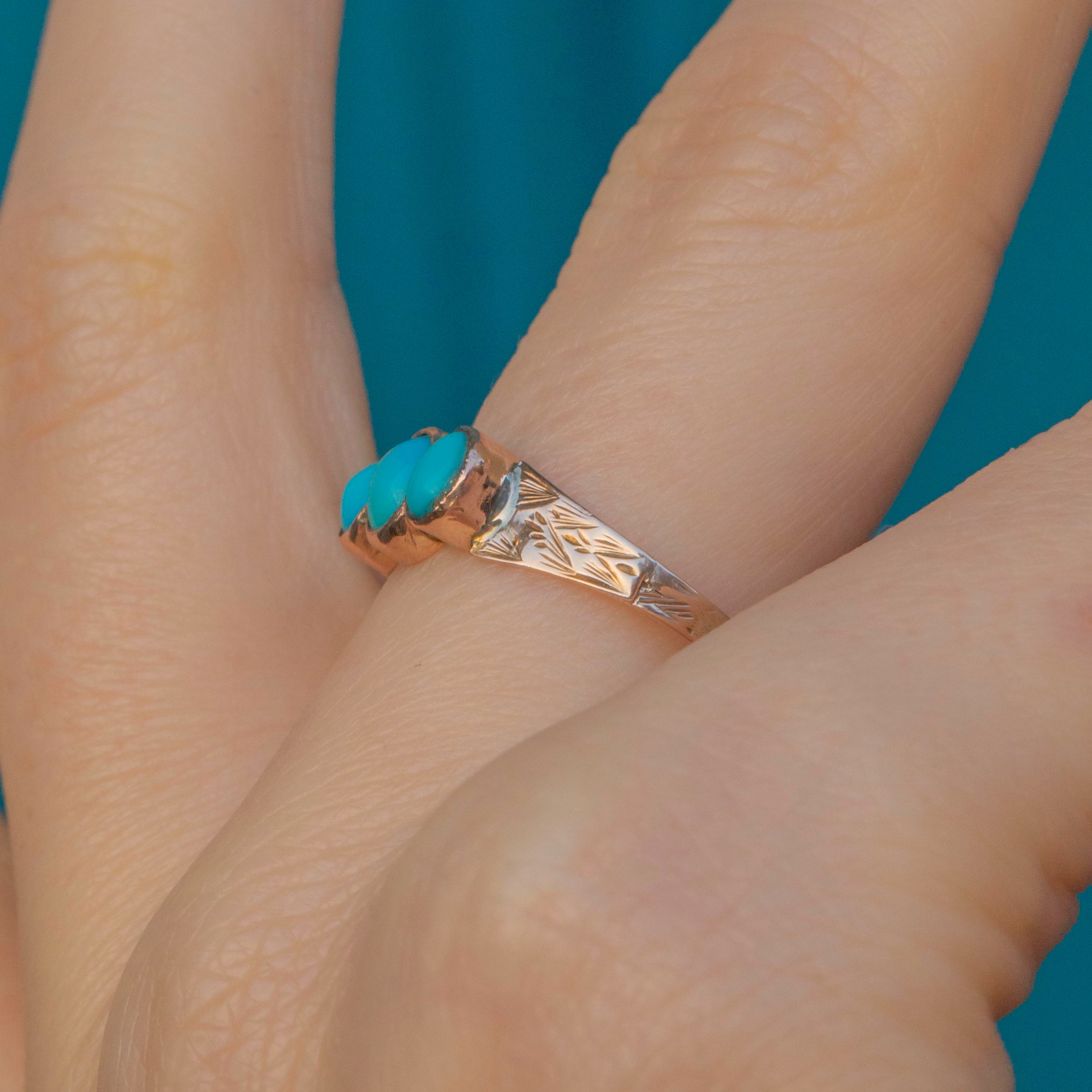 Victorian 9ct Gold Turquoise Three Stone Ring c.1891, Engraved Band