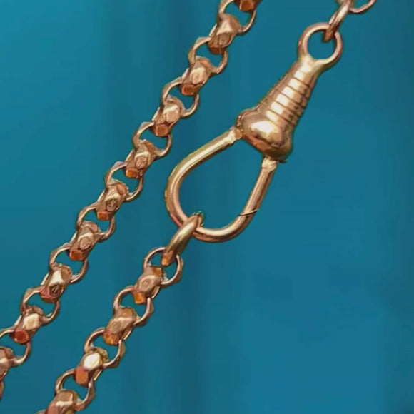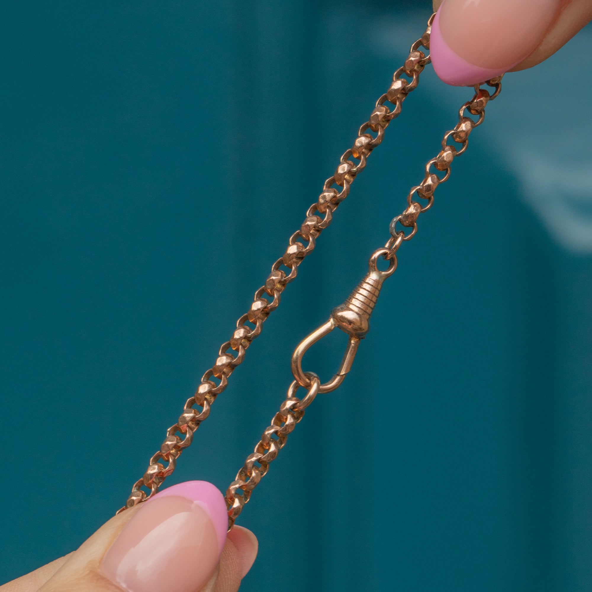 VERY GOOD. This Victorian 9ct rose-Gold cased longuard chain is in very good condition. The chain is perfectly formed, with a saturated rosy tone running throughout. There is some excess solder to the link connecting the dog-clip, and an open jump-ring in place of a link, however these things will only be spotted with a keen eye and do not affect the beauty of functionality of the piece. With a working dog-clip, this Victorian chain is ready to wear straight from your pink Lillicoco box!