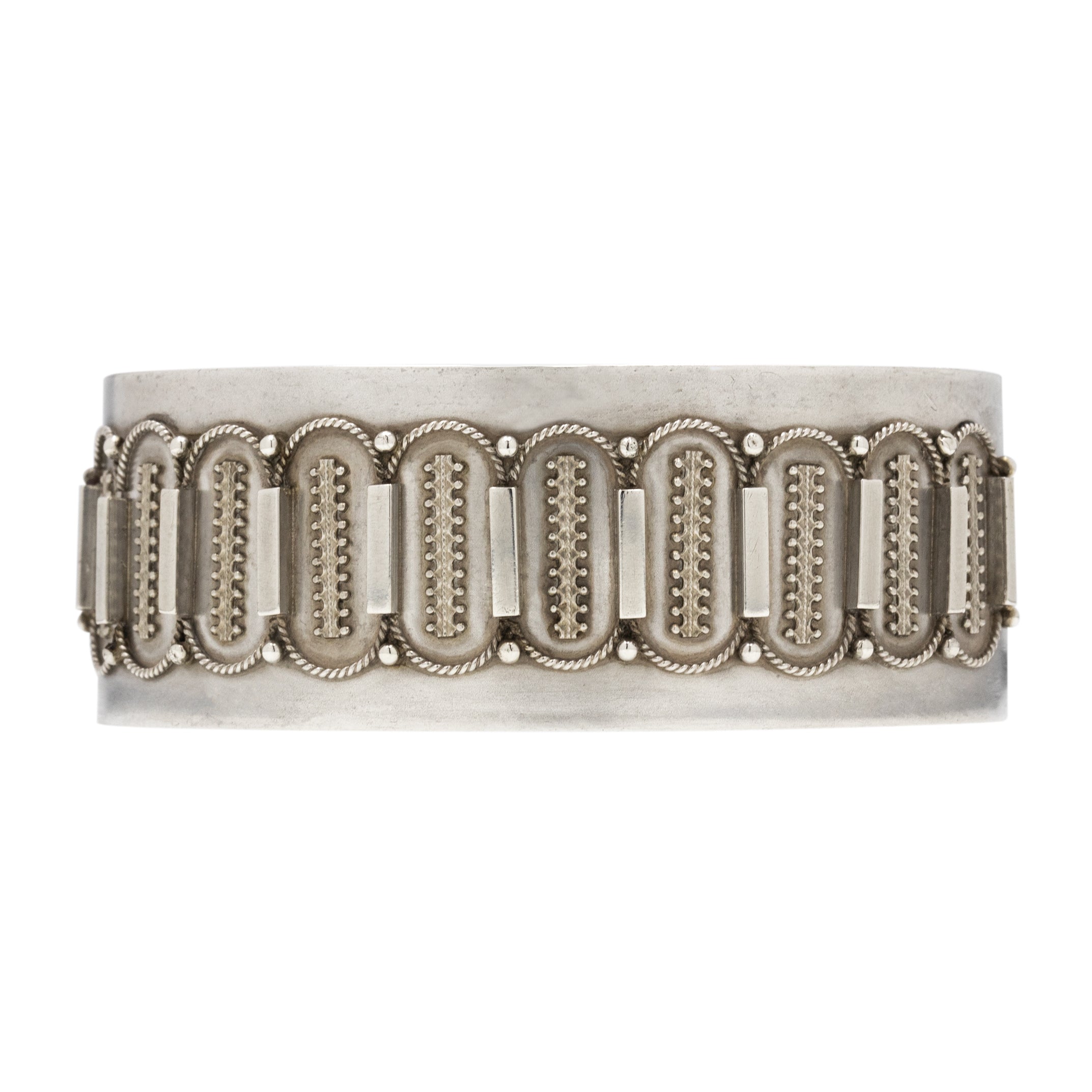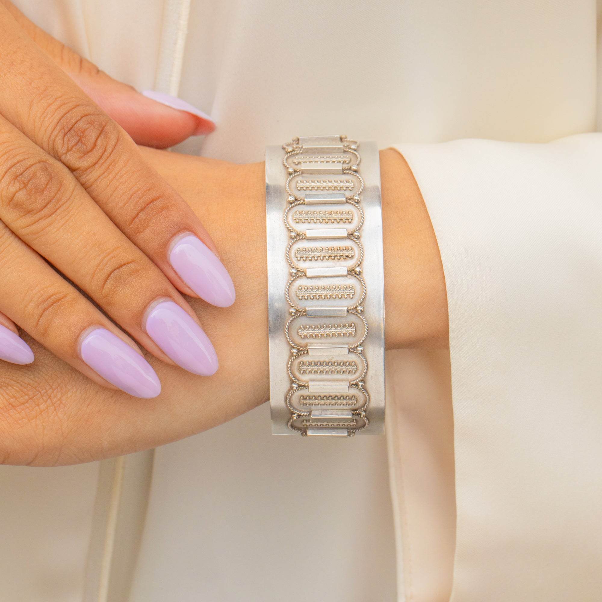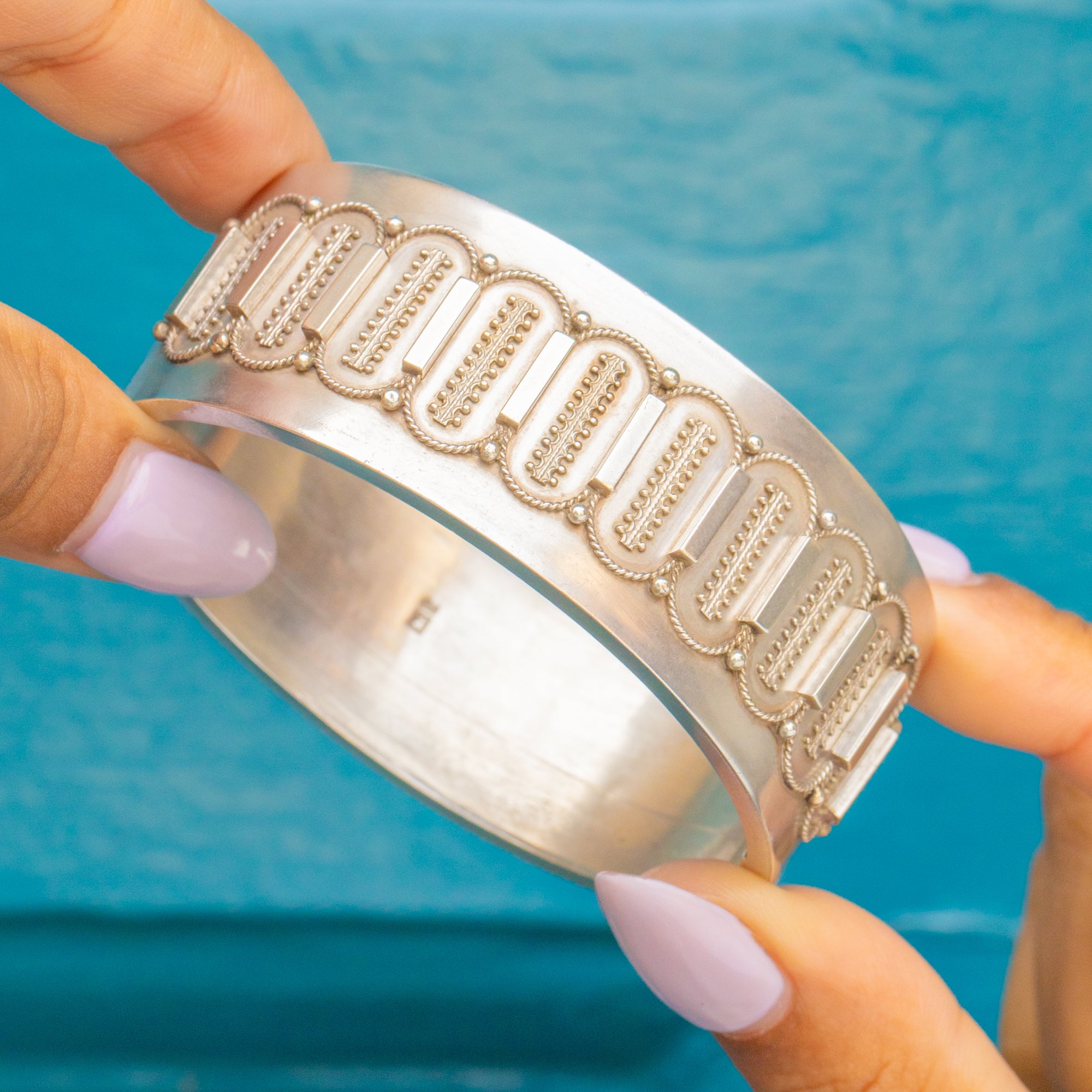 Feast your eyes on this Victorian aesthetic Sterling Silver bangle! Her bangle front is adorned with a traditional Victorian design featuring scallop edges formed from Silver rope met by beaded detailing in every groove.