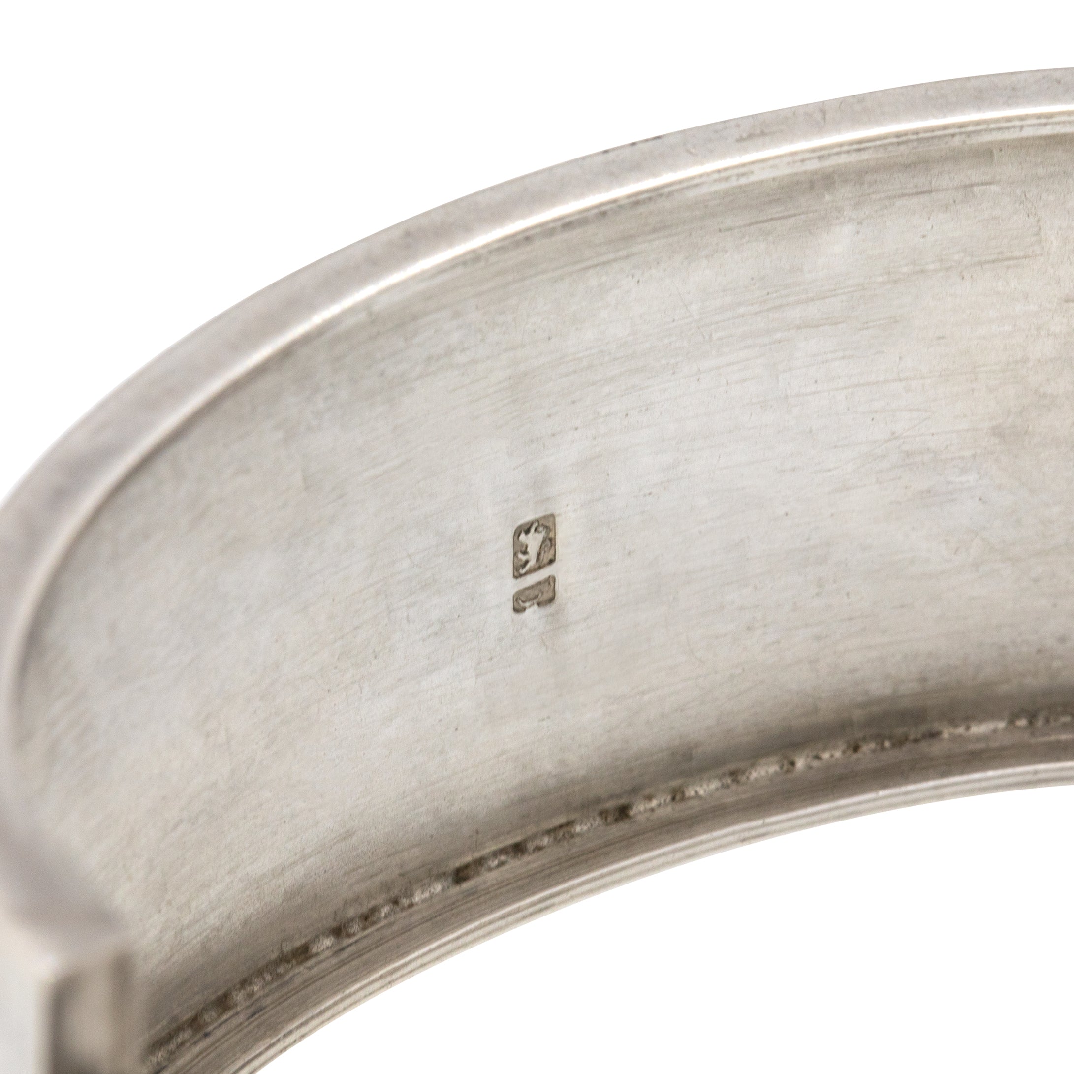 VERY GOOD-EXCELLENT. This Victorian aesthetic Sterling Silver bangle is in fab condition. The front detailing is crisp with every component securely soldered into place. The Sterling Silver itself has a lovely lustre met with a soft patina adding to her antique charm. There is a small hairline crack next to the tongue clasp but this does not affect her functionality and she still shuts securely. With a full set of English hallmarks, we can accurately date her back to 1882!