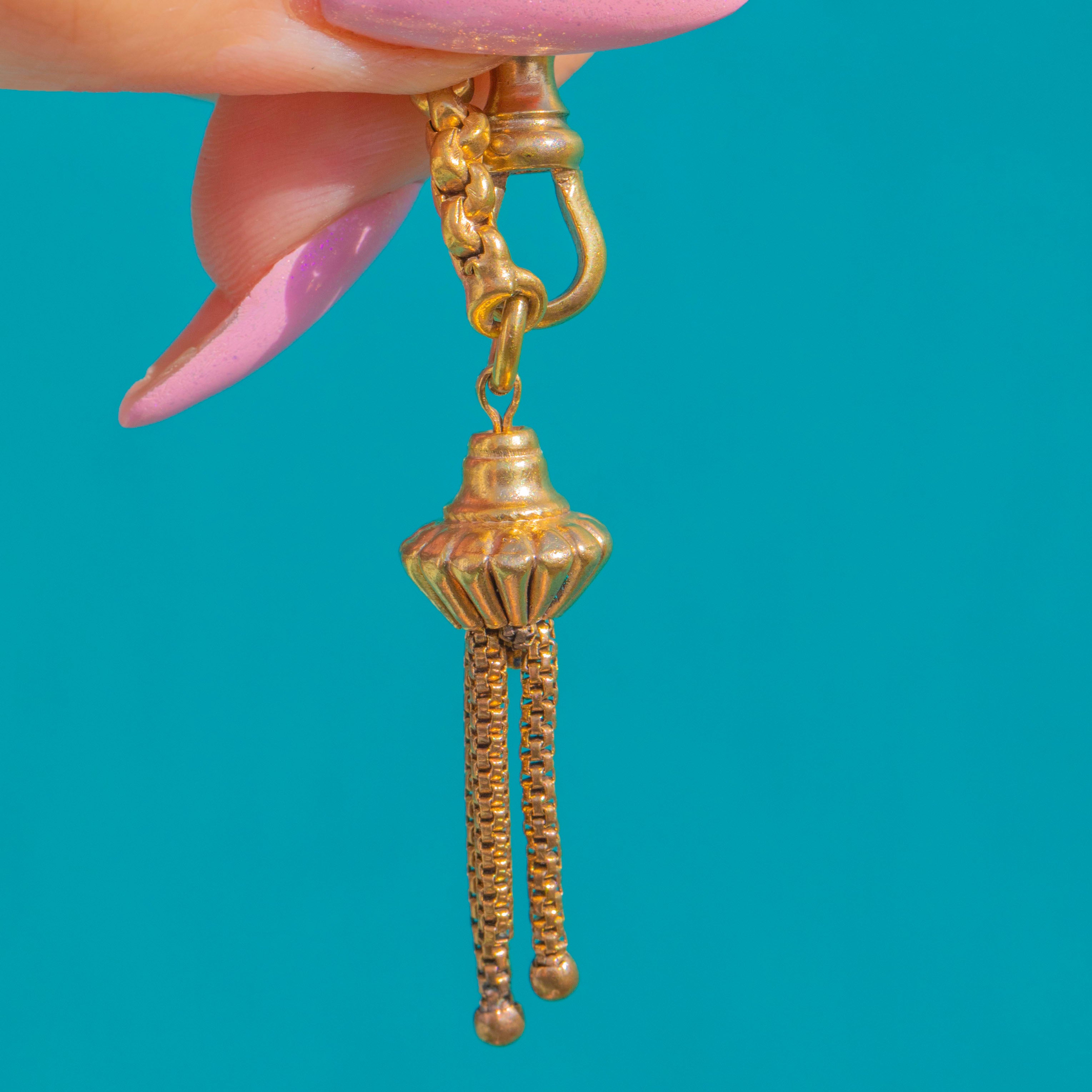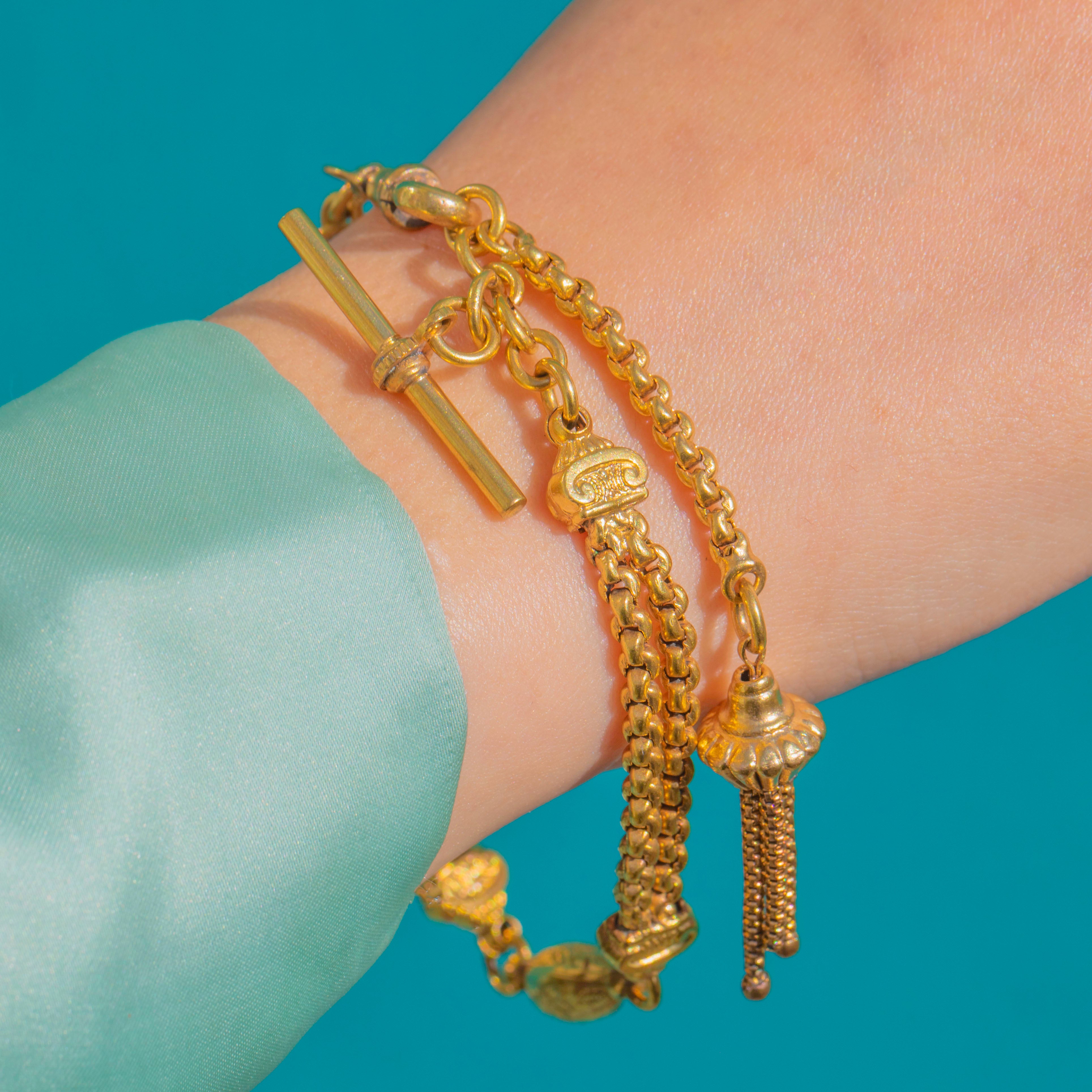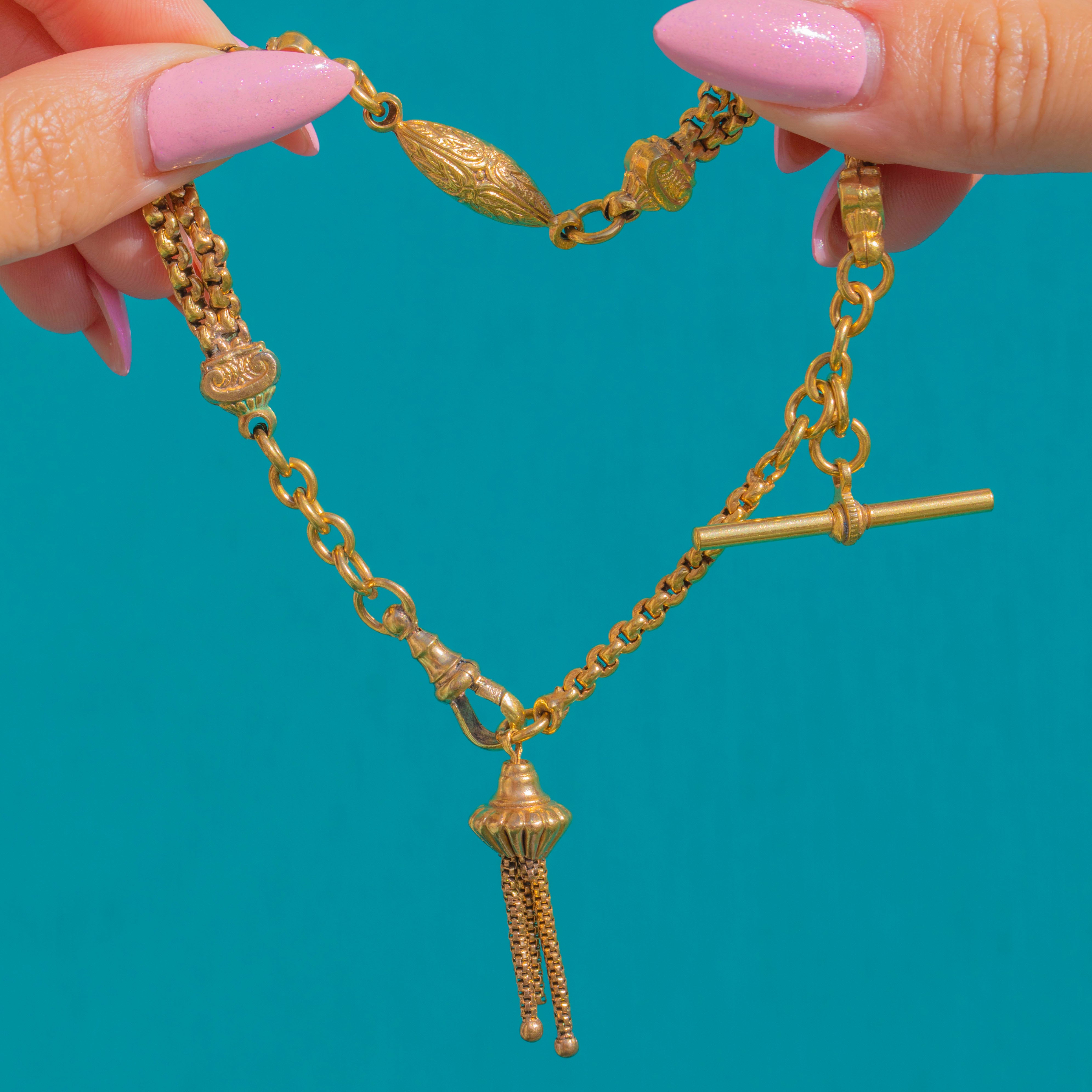 A richly detailed Victorian Albertina bracelet, this golden beauty brings together multiple ornate chain sections with classical engraving and a silken tassel for that quintessential 19th-century flourish. The warm Gold gilding highlights chased foliate scrollwork and fluted accents, while the sculpted terminals flow into a tactile urn-acorn finial topped with a delicate tassel.