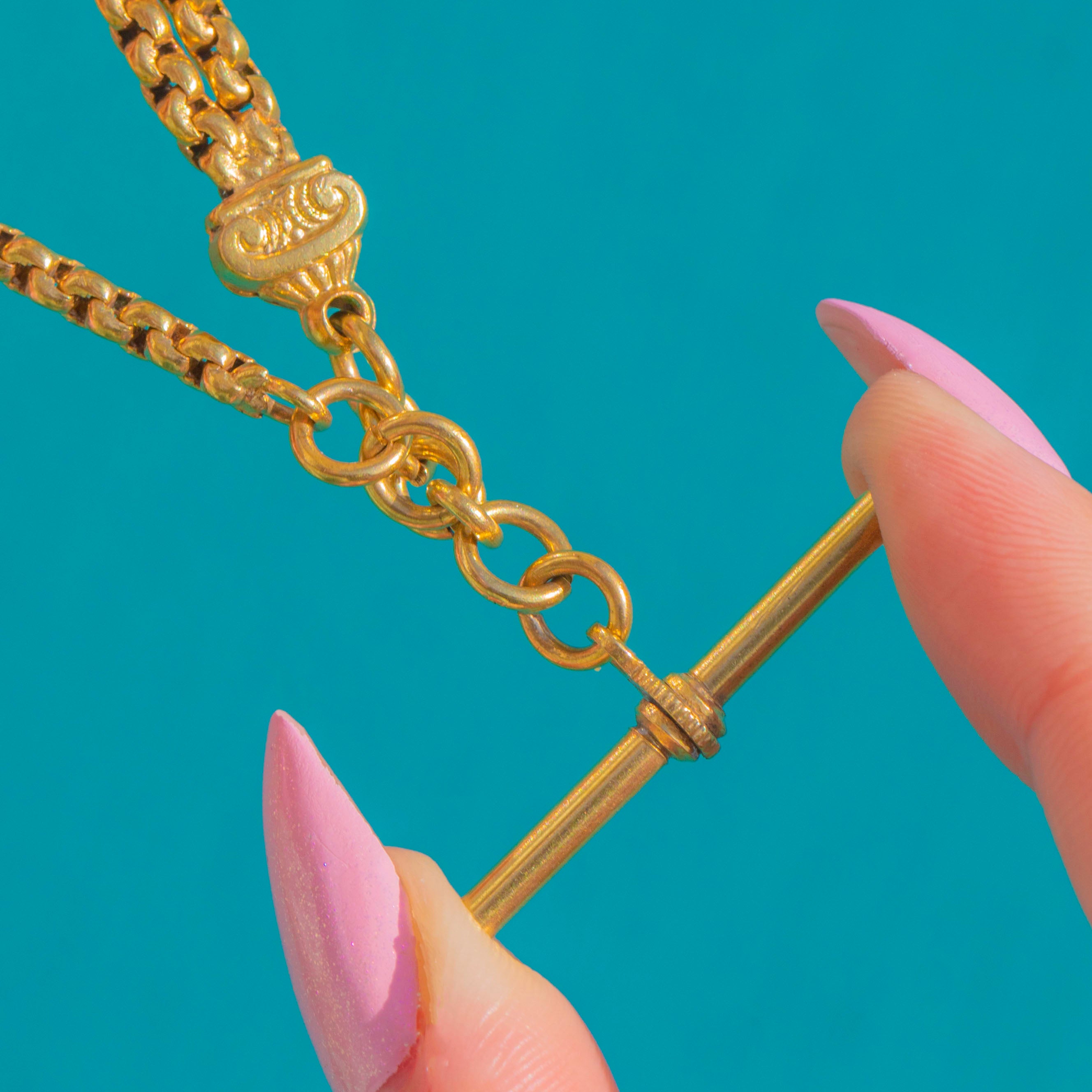VERY GOOD: Light surface wear and softening to high points with some thinning to the Gold gilding in places, consistent with age. Links, T-bar and dog-clip are secure and function well, with natural patina at joins enhancing the antique character.