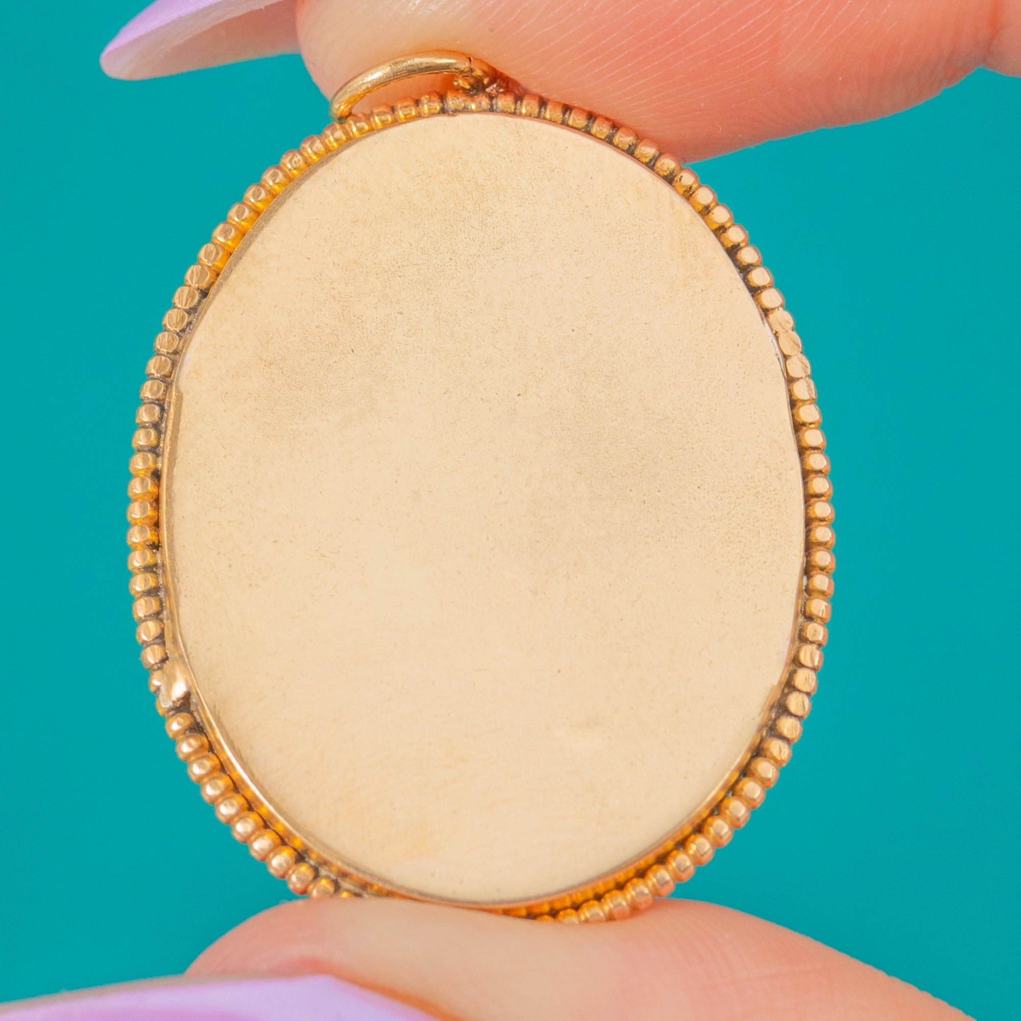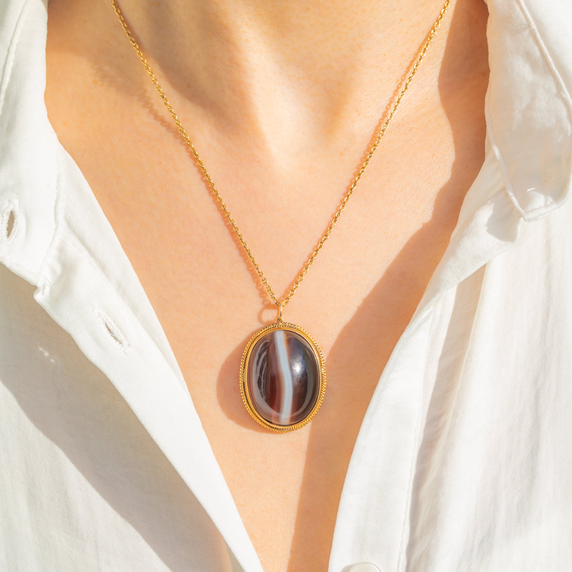 This Victorian pendant showcases a striking high-domed Banded Agate, its natural ribbons of deep red and warm brown flowing through inky black to a soft cream-grey. The stone is framed in a closed-back gilded Sterling Silver mount with an elegant twisted-rope surround and fine beaded edge, finished with a simple jump ring for effortless styling.