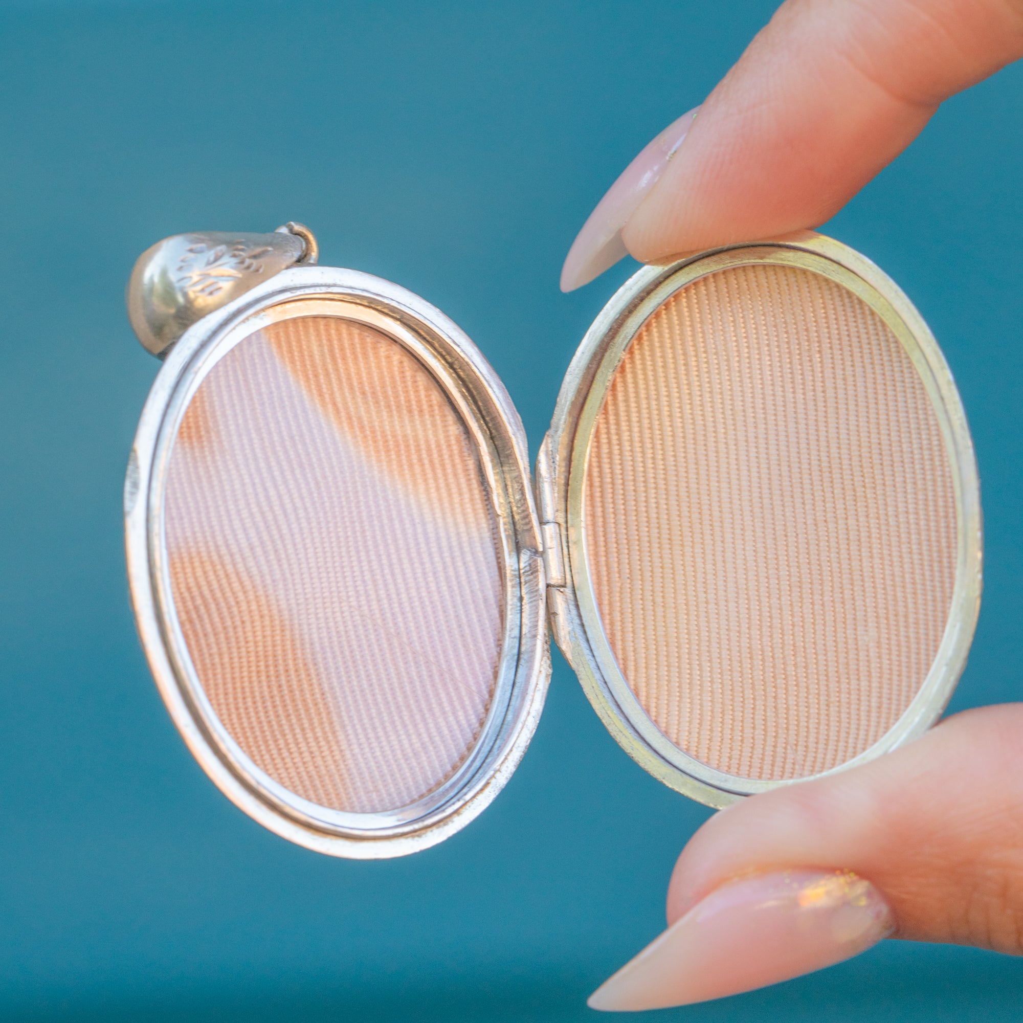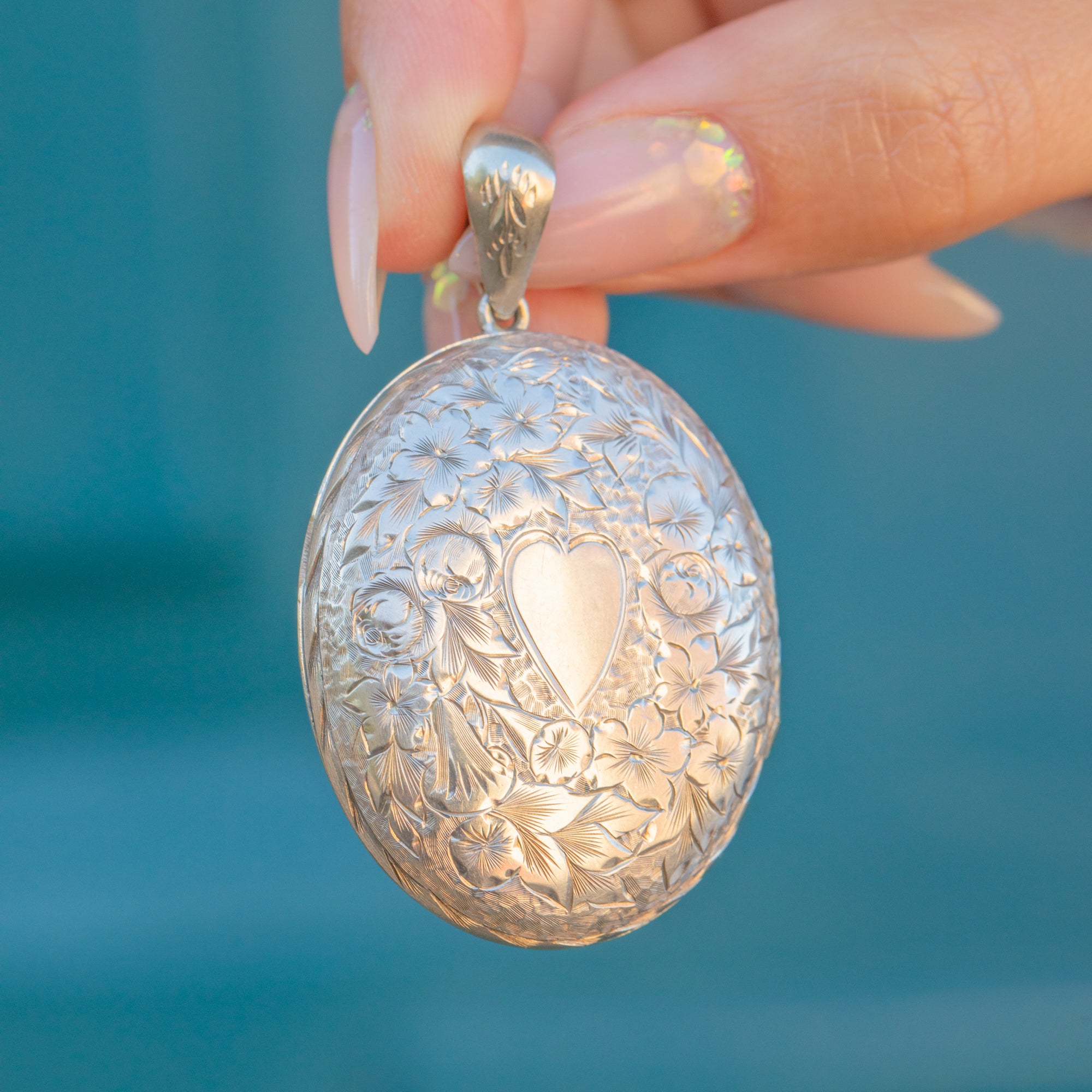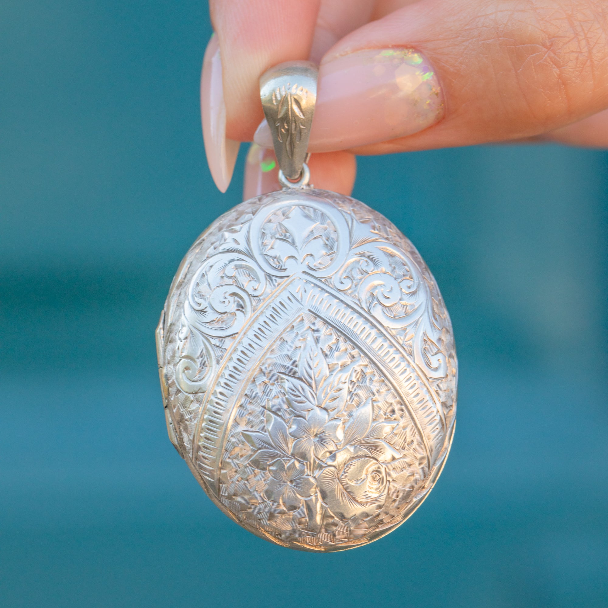 This impressive Victorian Silver locket is a true statement piece, brimming with character and charm. Crafted in the late 19th century, its generous oval body is decorated with ornate engraving, from scrolling flourishes at the top to a romantic bouquet of roses and foliage below. The design is wonderfully crisp, with fine detailing that catches the light beautifully.