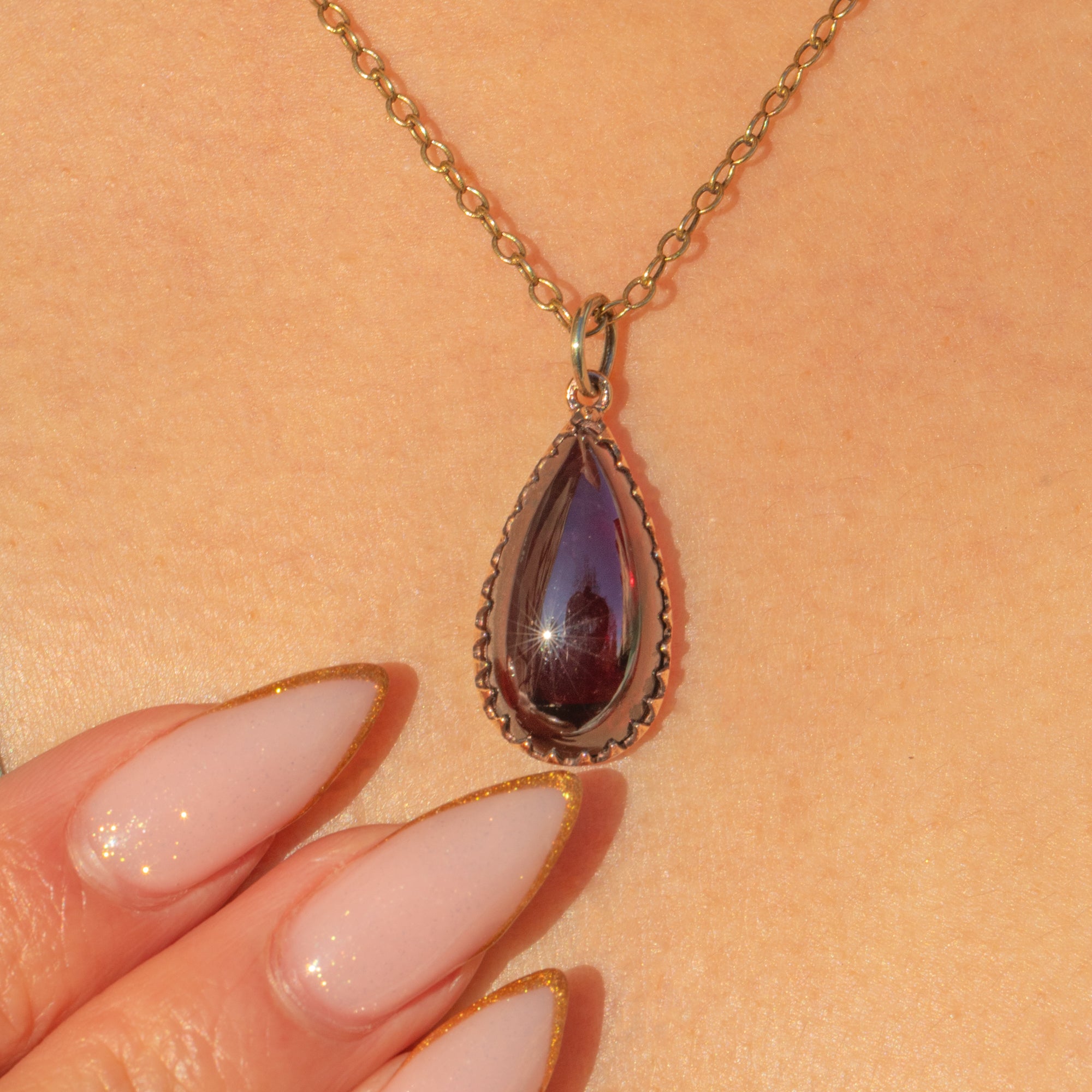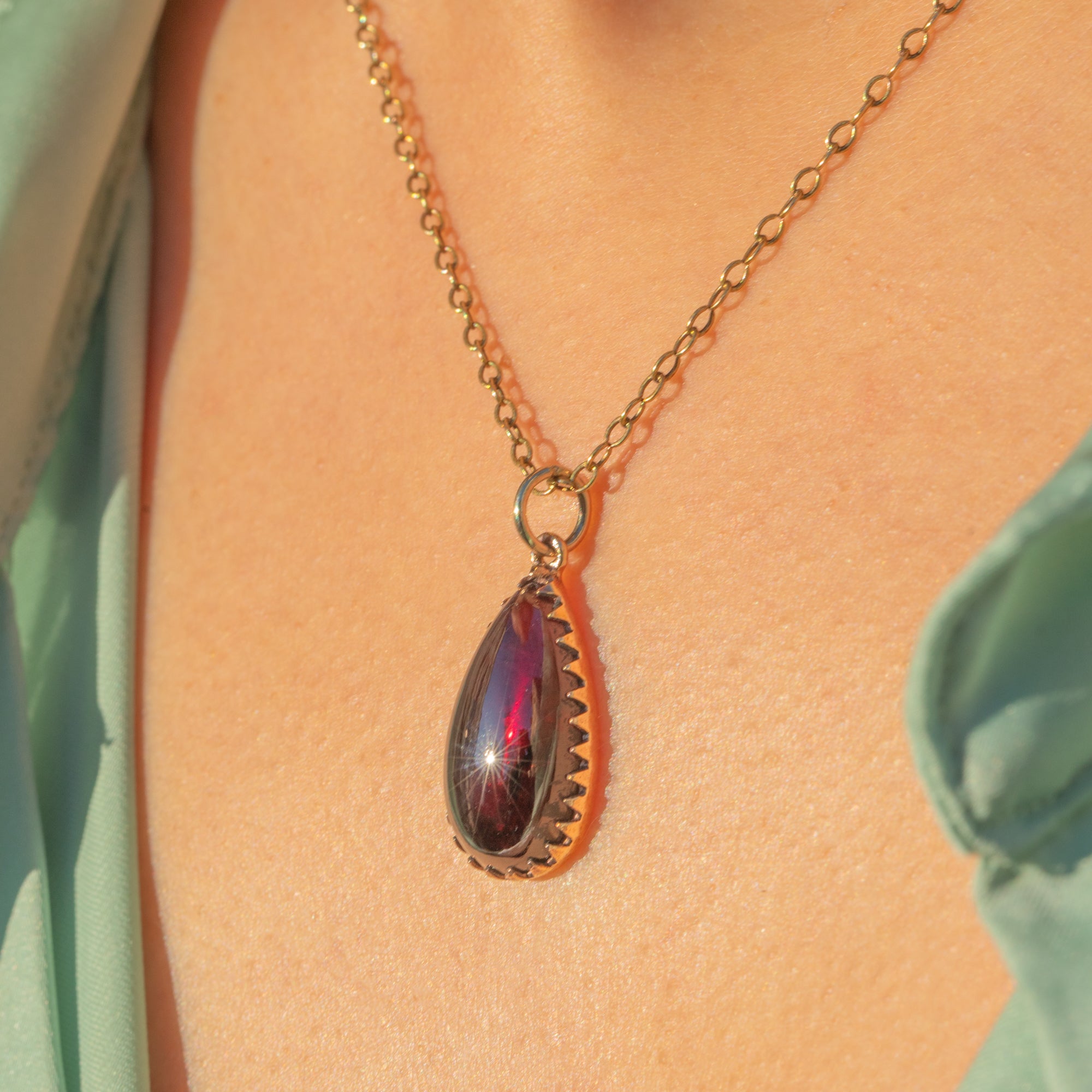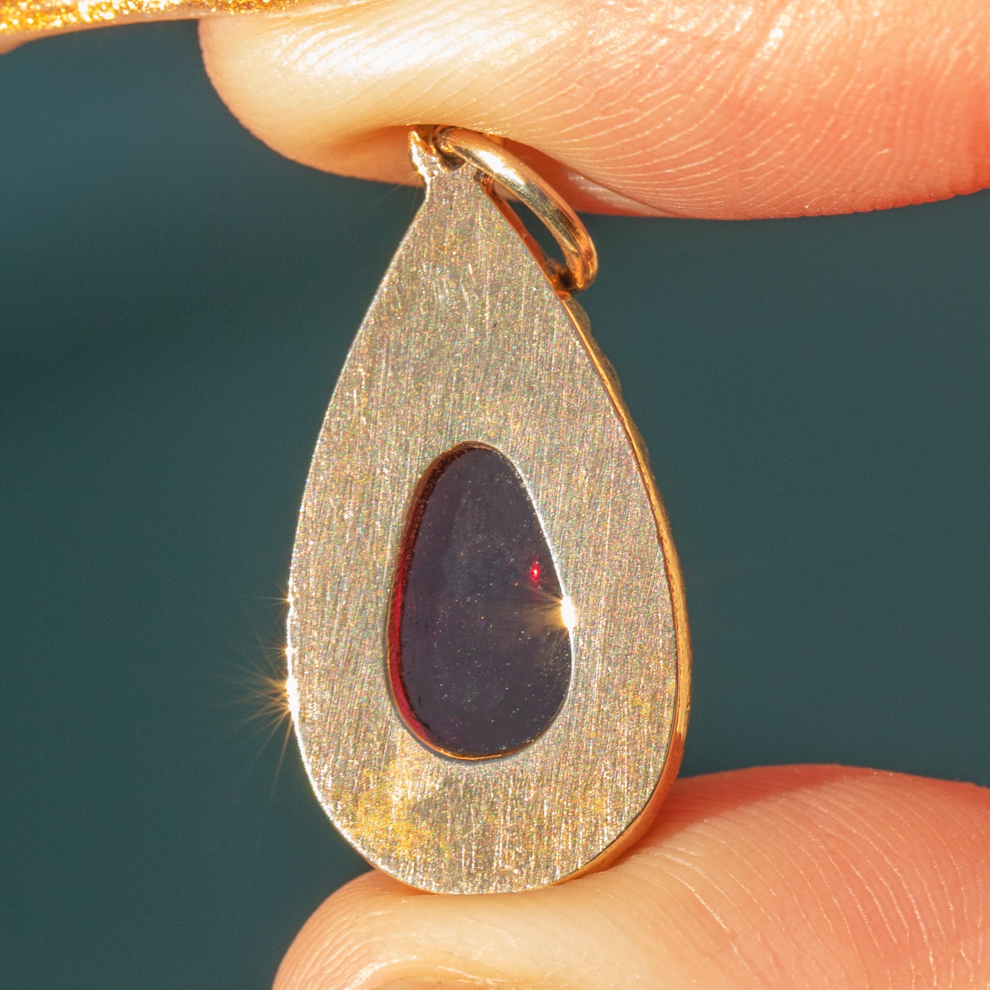 This Victorian Garnet teardrop charm is a richly coloured little treasure, set with a glossy cabochon Garnet in warm Garnet Gold and finished with a 9ct Gold jump ring, so it’s ready to wear. The elongated pear-shaped stone has beautiful presence for its size, with a deep red hue and smooth domed surface that glows in the light.