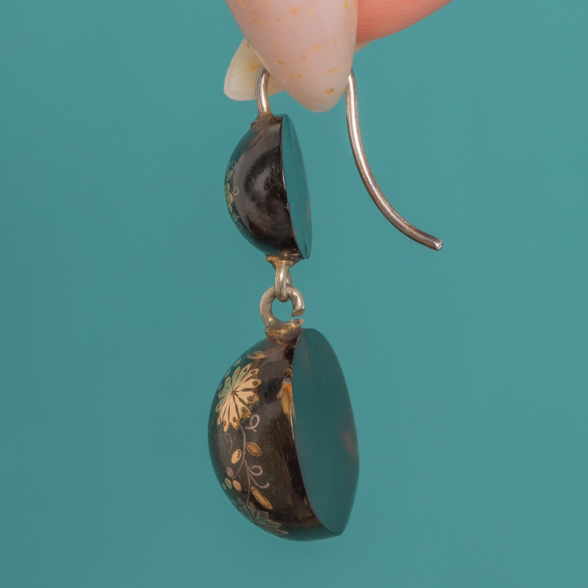 These Victorian Piqué double-drop earrings are a beautifully balanced study in contrast and craft. Each glossy dark “lentil” is enriched with fine 9ct Gold foliate sprays, rosettes and dotted scrollwork, the larger drop encircled by a delicate garland motif for an elegant Aesthetic/Japonisme flourish. The graduated, articulated construction gives a subtle sway that catches the light on every detail.