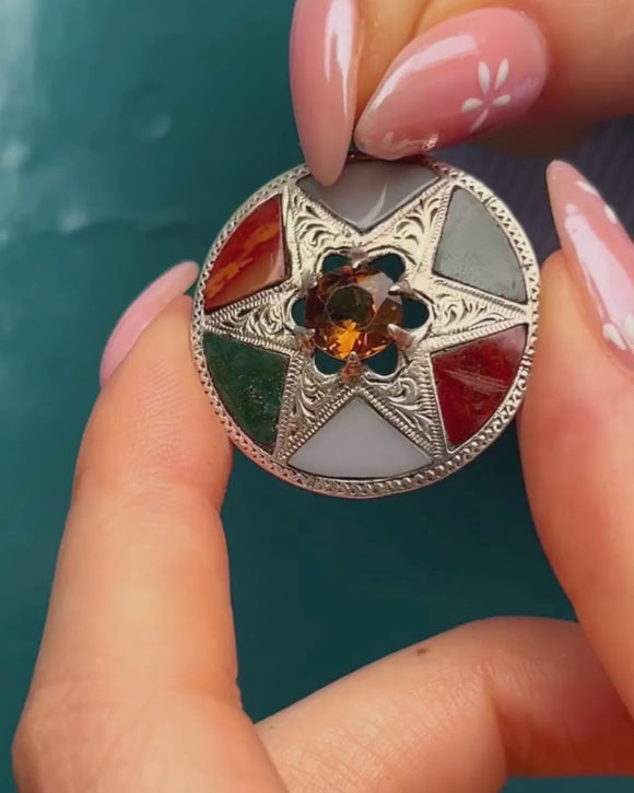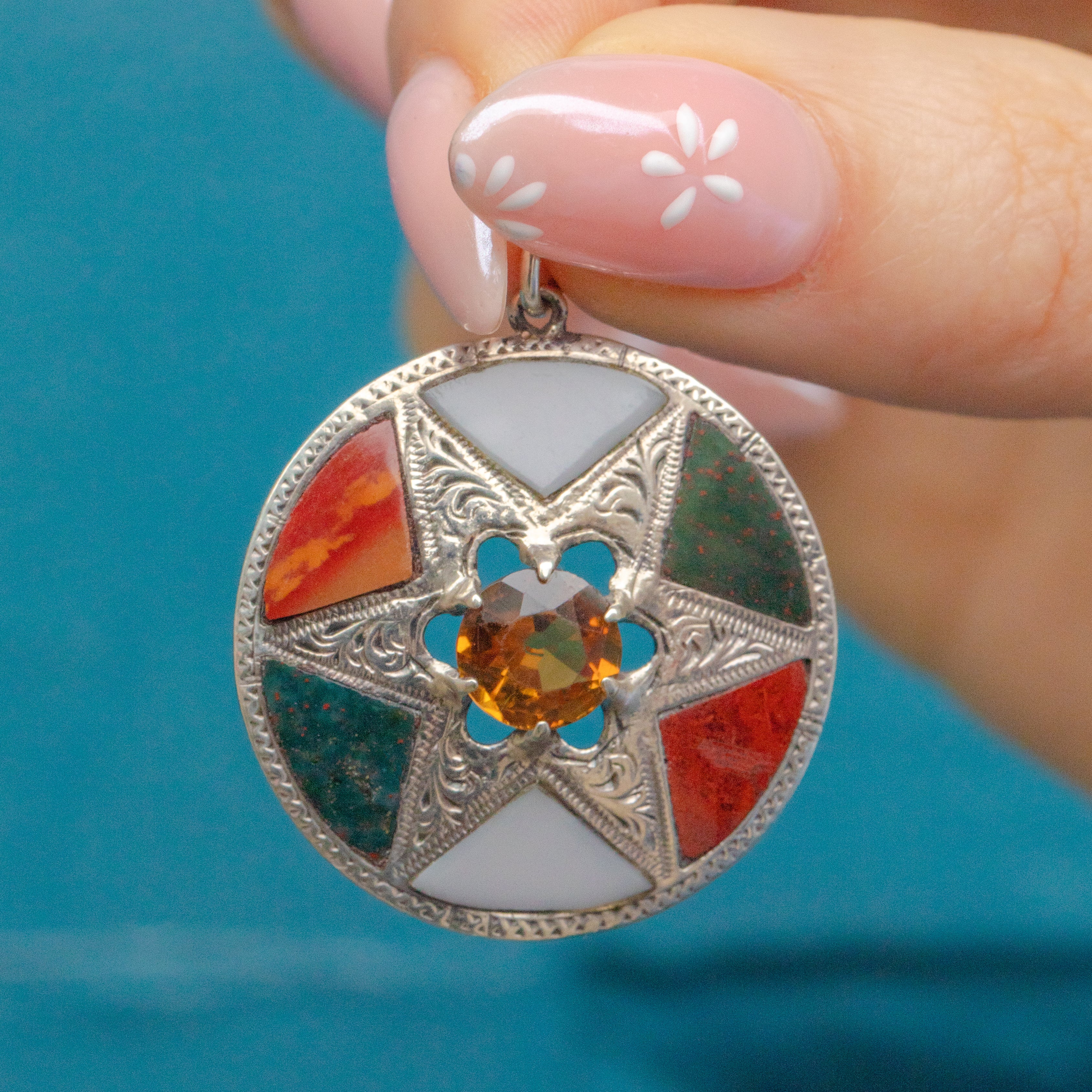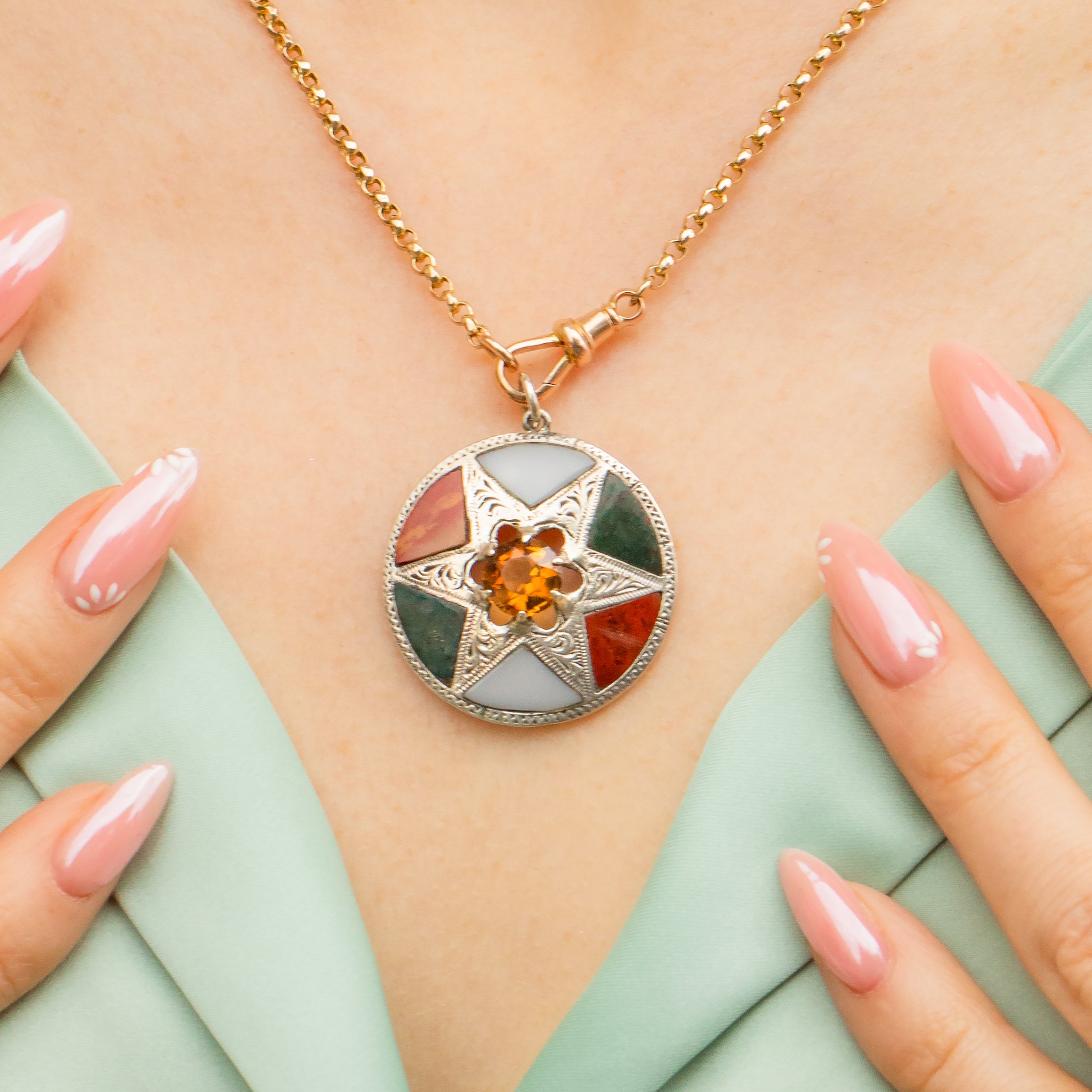 Akin to a stained glass window, she is inlaid with Scottish Agate boasting a kaleidoscope of colour, from terracotta to cloudy grey contrasting beautifully against the glisten of her zesty 1.00ct Citrine. Highly prized by the Celts, Scottish Agate was used for luck and protection, so why not make this Victorian Silver pendant your newest talisman? You will never tire of her antique charm!