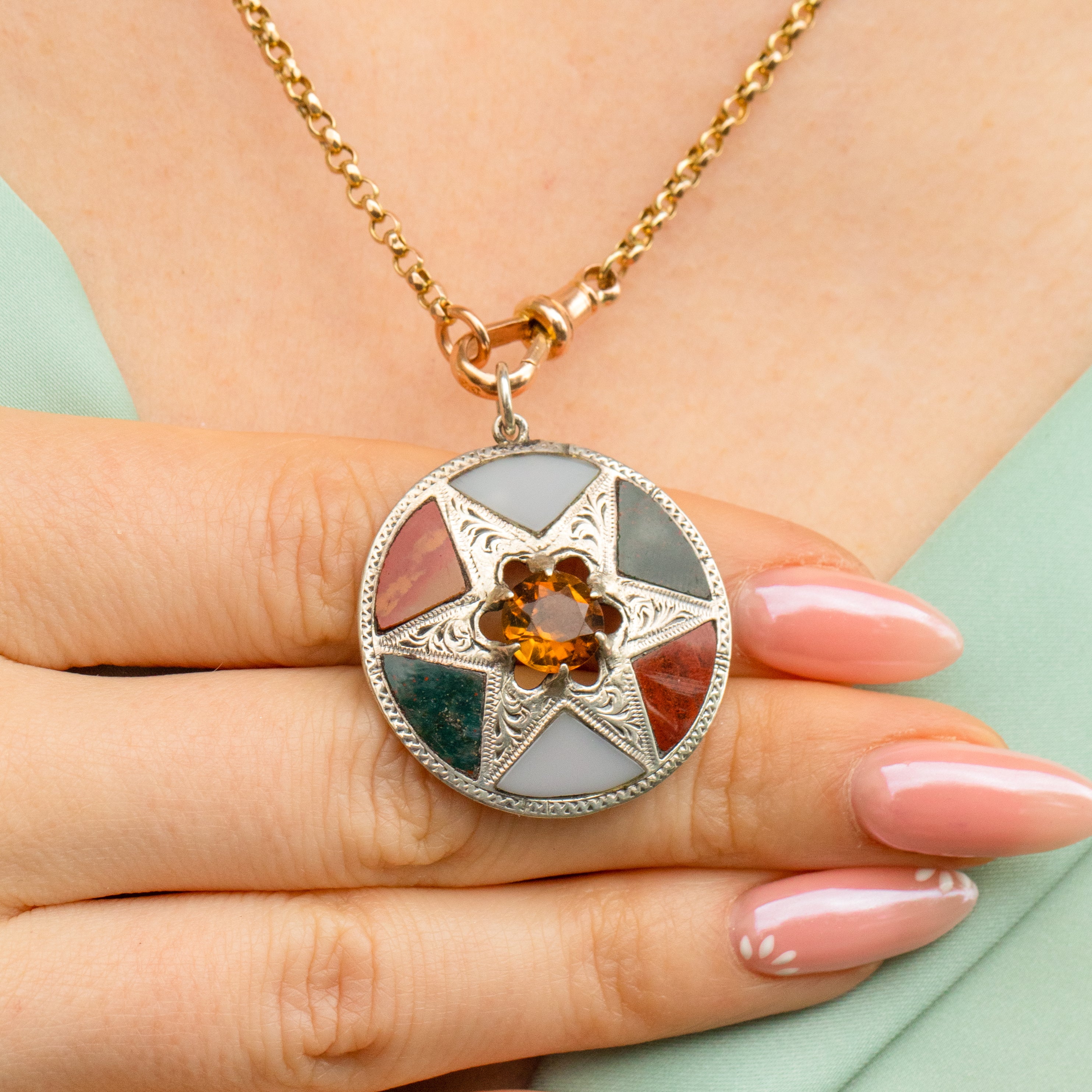 Incorporate a slice of history into your antique jewellery collection with this Victorian Scottish Agate Citrine round pendant! An undeniably eye-catching piece, she is perfect for adding an accent of colour to any outfit.