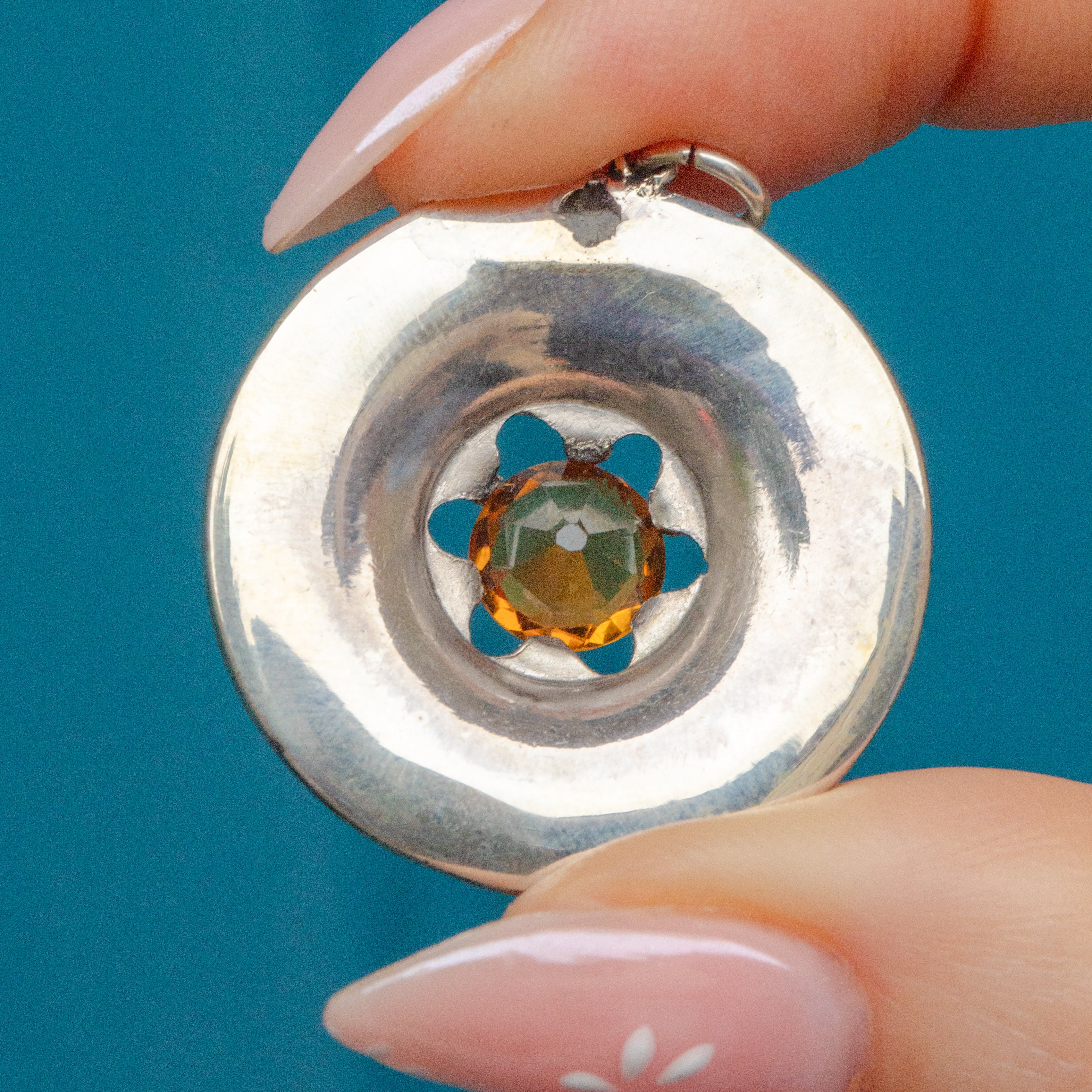 VERY GOOD. Offered in very good condition, this Victorian Scottish Agate Citrine round pendant is delightful! Her Sterling Silver has a lovely luster and securely holds the gemstones. As each of her stones has closed-back settings, it is important to note that you should not get this piece wet, as this can seep behind the stones and damage them. A loving conversion from a brooch, there is some evidence of this on the back near the jump ring, but this cannot be seen when worn. At the centre to the back there is also a slightly darker tone to the Silver, but this does not affect her overall beauty. A feast for the eyes, this Victorian pendant is a real statement piece!