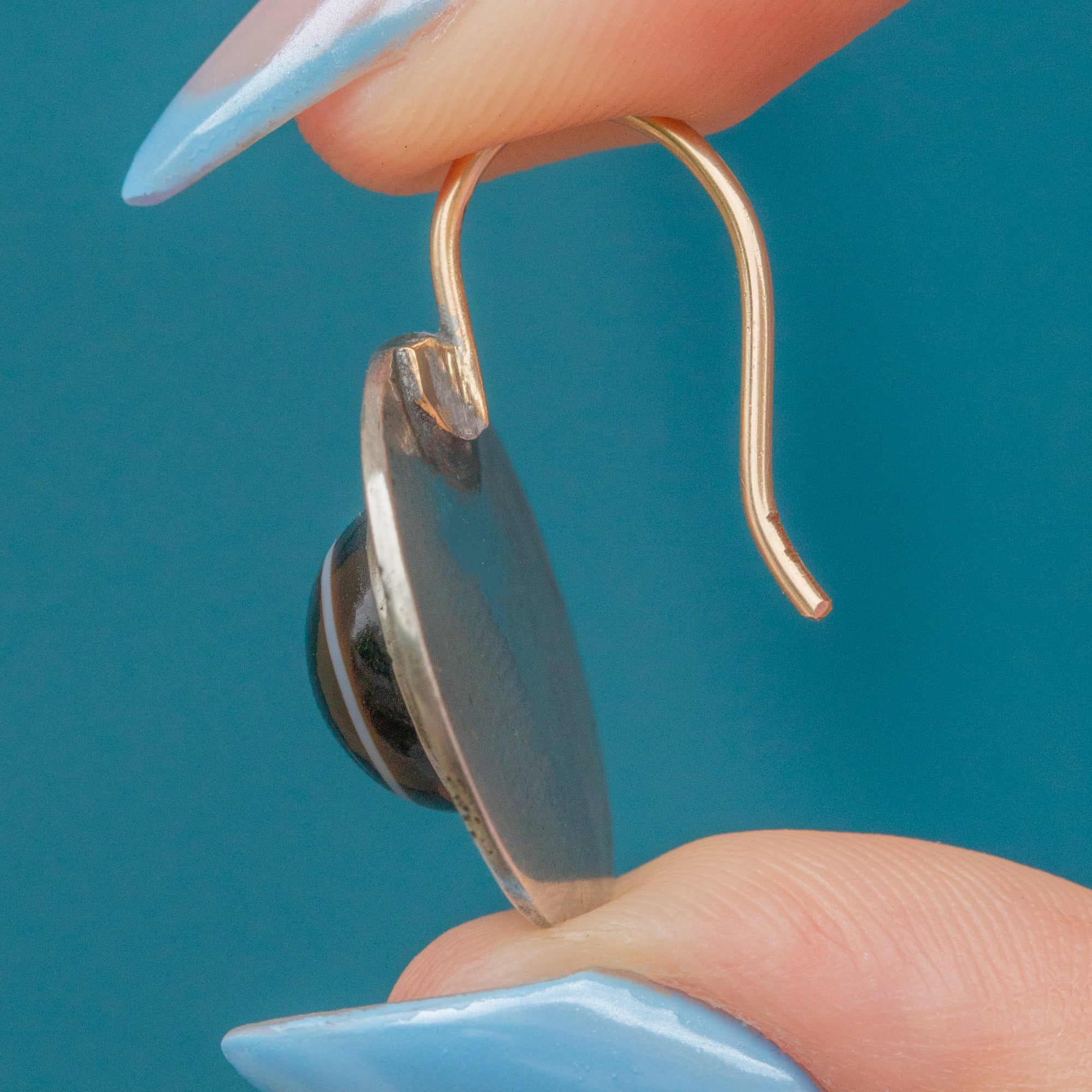 Boasting character and antique charm, this pair of Victorian earrings each presents a plump banded Agate with a white band running the circumference of the stone - akin to a bullseye.