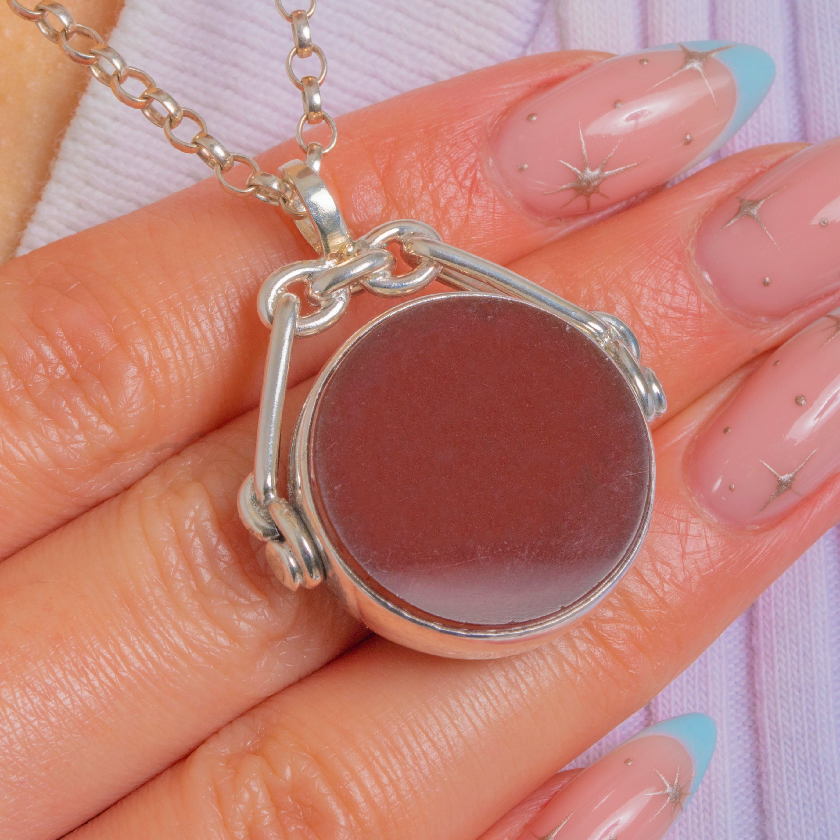 A classic Victorian swivel fob, crafted in bright Sterling Silver and set with a double-sided circular tablet of Carnelian and Bloodstone. The round seal spins within a U-shaped yoke terminating in neat scroll finials, creating a clean, functional silhouette with that unmistakable watch-fob character.