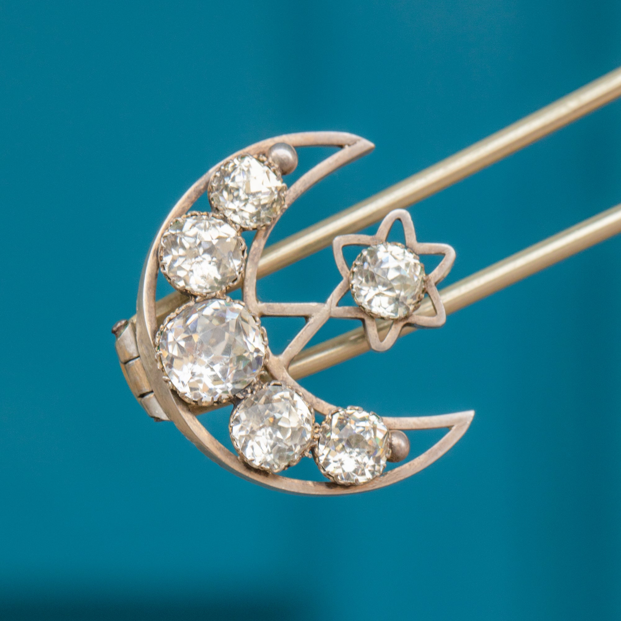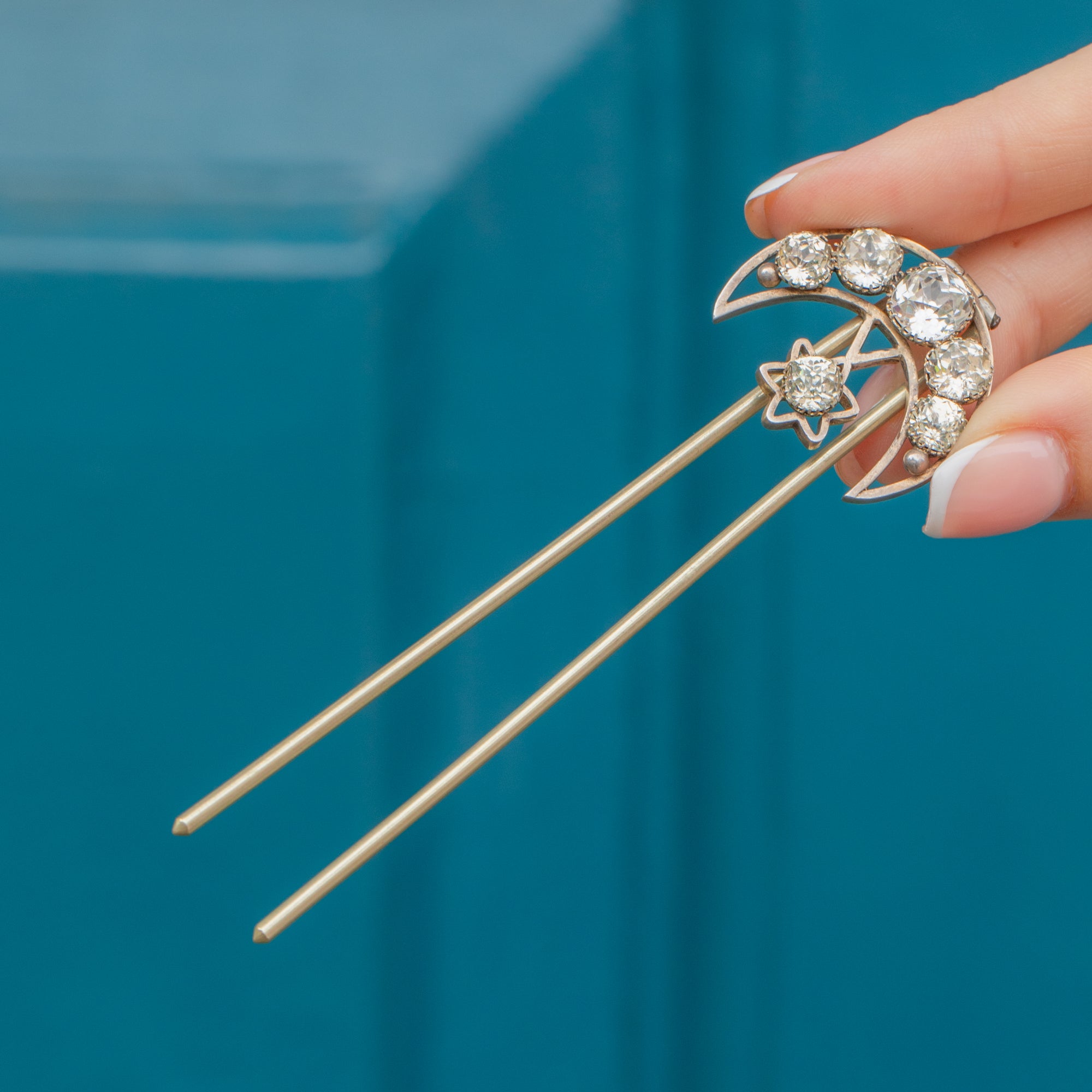 VERY GOOD This Victorian Silver Crescent Moon Hair Pin is in great condition. Her dazzling Paste gemstones are securely set in their Sterling Silver setting and although she has one scuff on one of her stones, this is only visible under close inspection. Her Sterling Silver has accrued a gorgeous patina over the years, rendering her a wonderful addition to your antique collection.