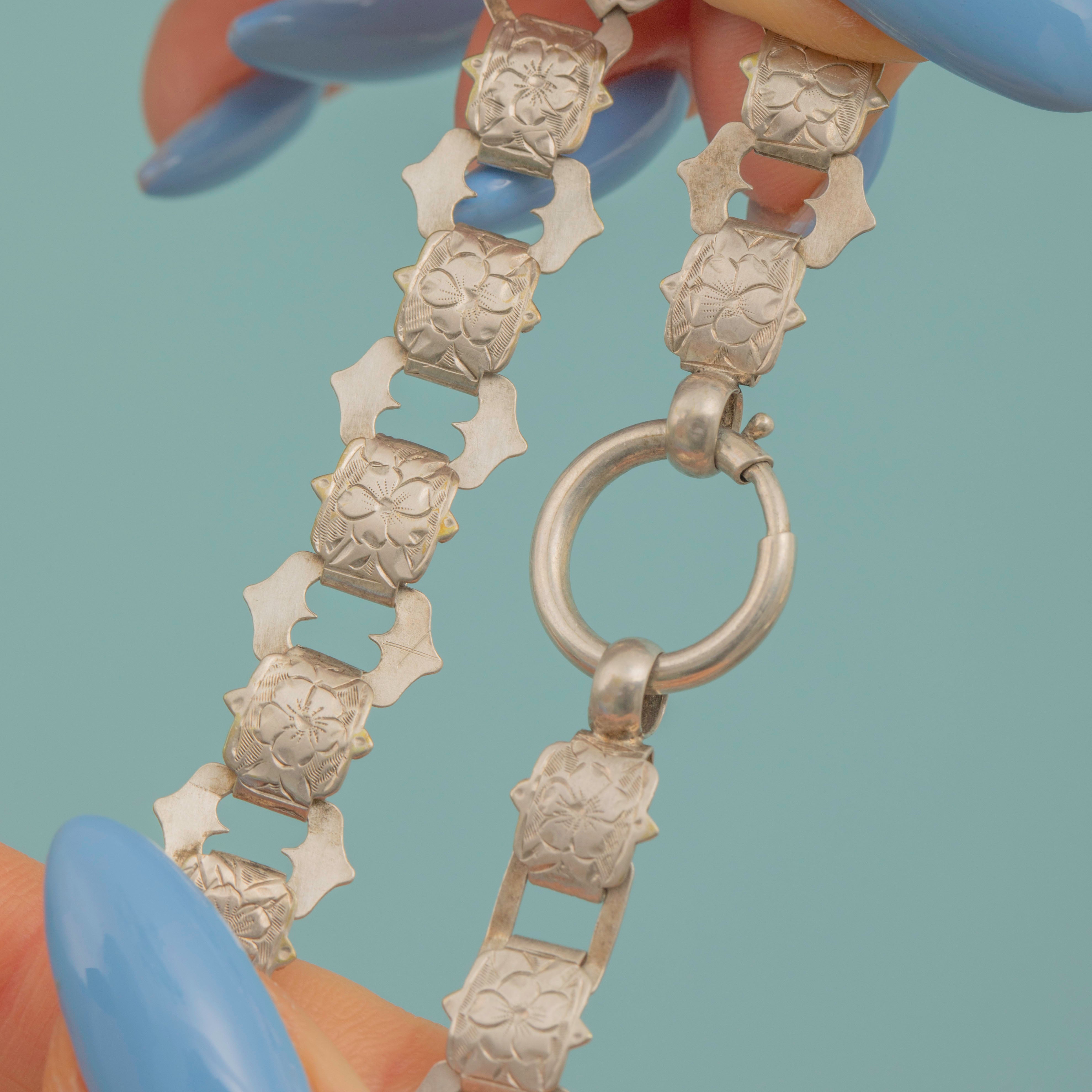 This Victorian Silver engraved forget-me-not book chain is mesmerising! Identical forget-me-not details have been intricately engraved on each link, a traditional symbol of remembrance, and the necklace is secured by a large bolt ring with an additional jump ring at the centre, perfect for adding an antique charm or pendant!