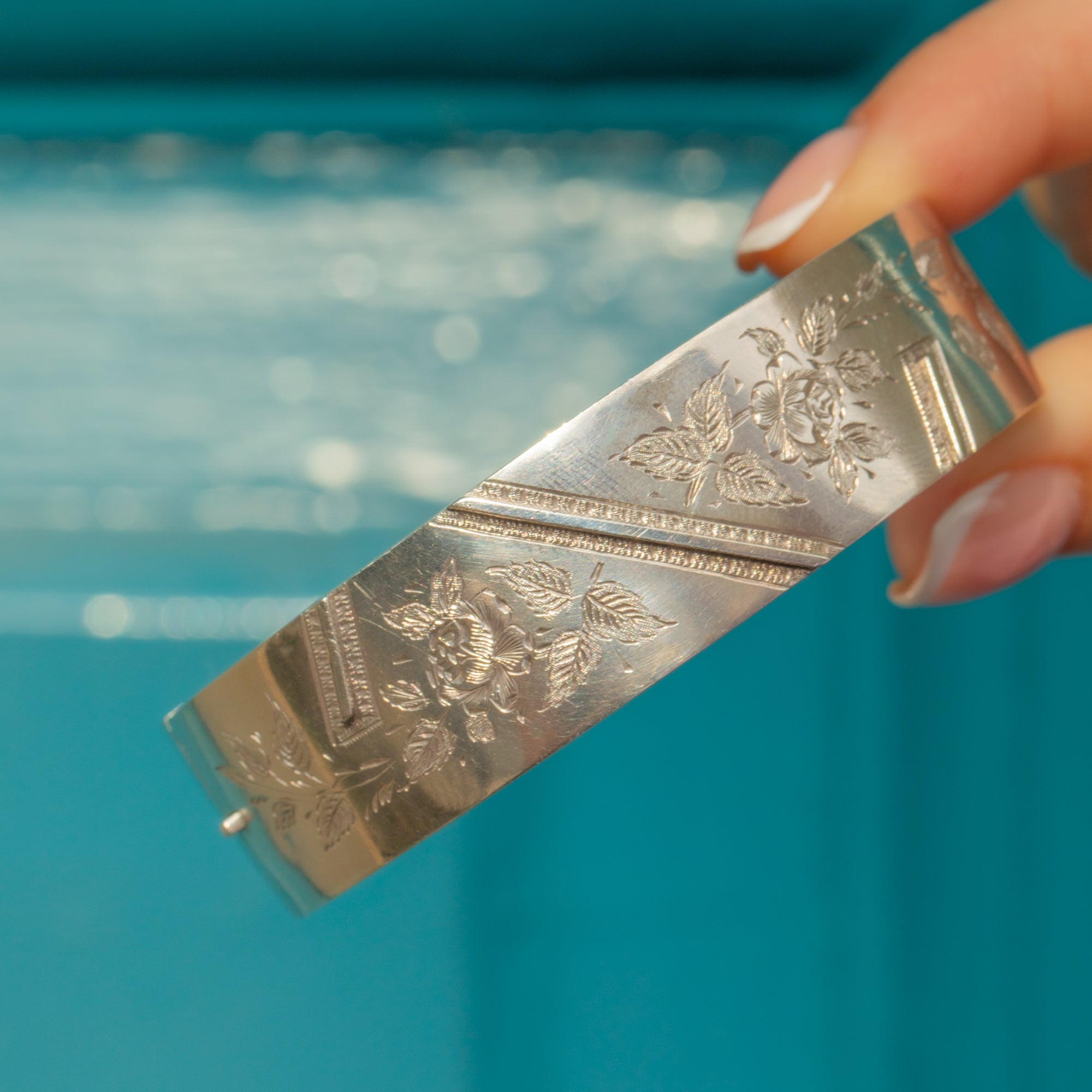 VERY GOOD. This Victorian Aesthetic Silver engraved wild roses bangle is in very good condition. The Silver is lustrous and the details have all remained crisp, with a light patina accrued within the engravings creating more depth. There is some surface wear on the back of the bangle, including a ding, but this does not impact the integrity of the piece. There is a slightly wobble once opened from where the hinge has slightly loosened, however when closed she is secure with a satisfying 'click'. Wear this antique bangle in both confidence and style!