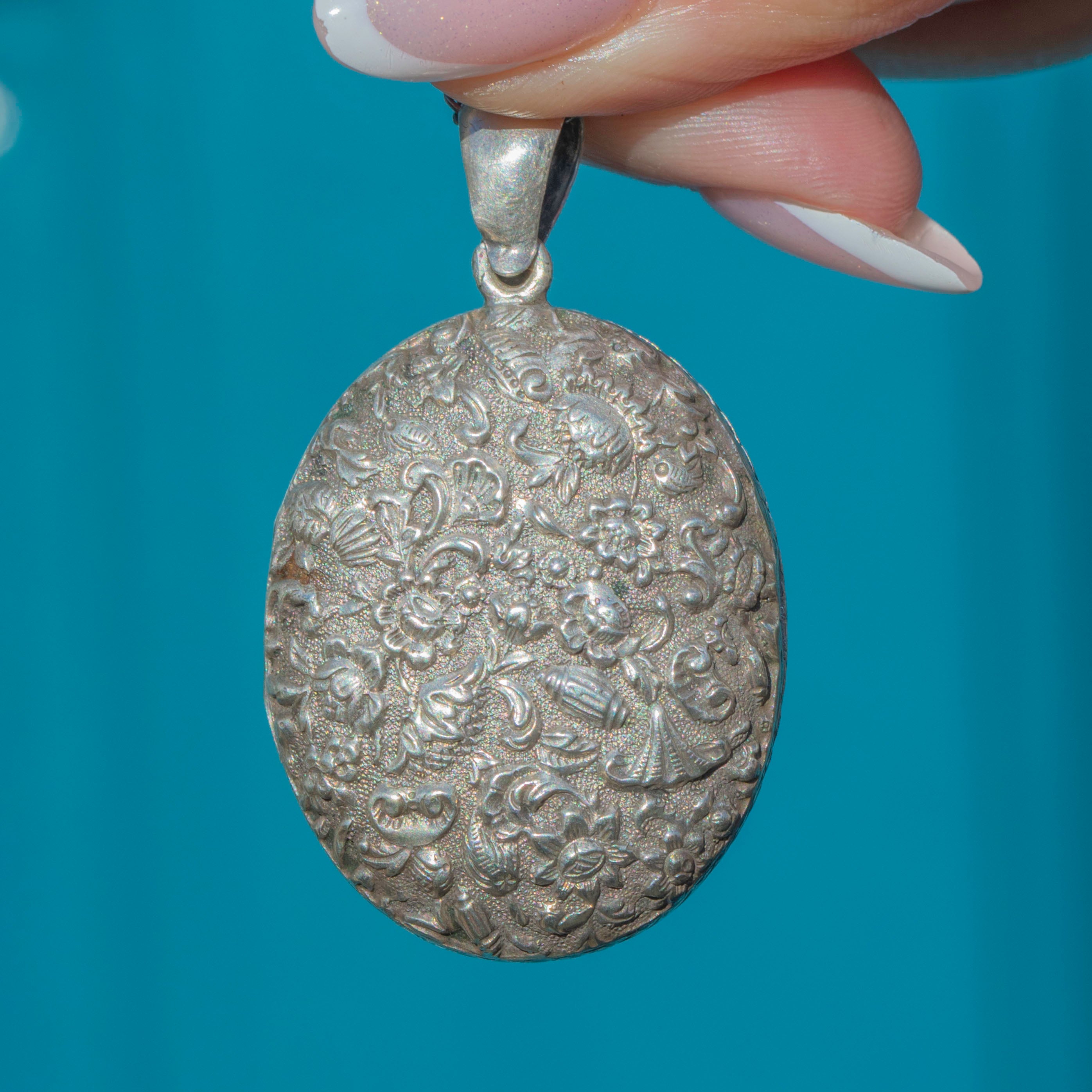 We adore this Victorian Silver repoussé shell & flower locket! With sweet repoussé details covering both sides, you can appreciate the intricate craftsmanship of this antique locket from every angle.
