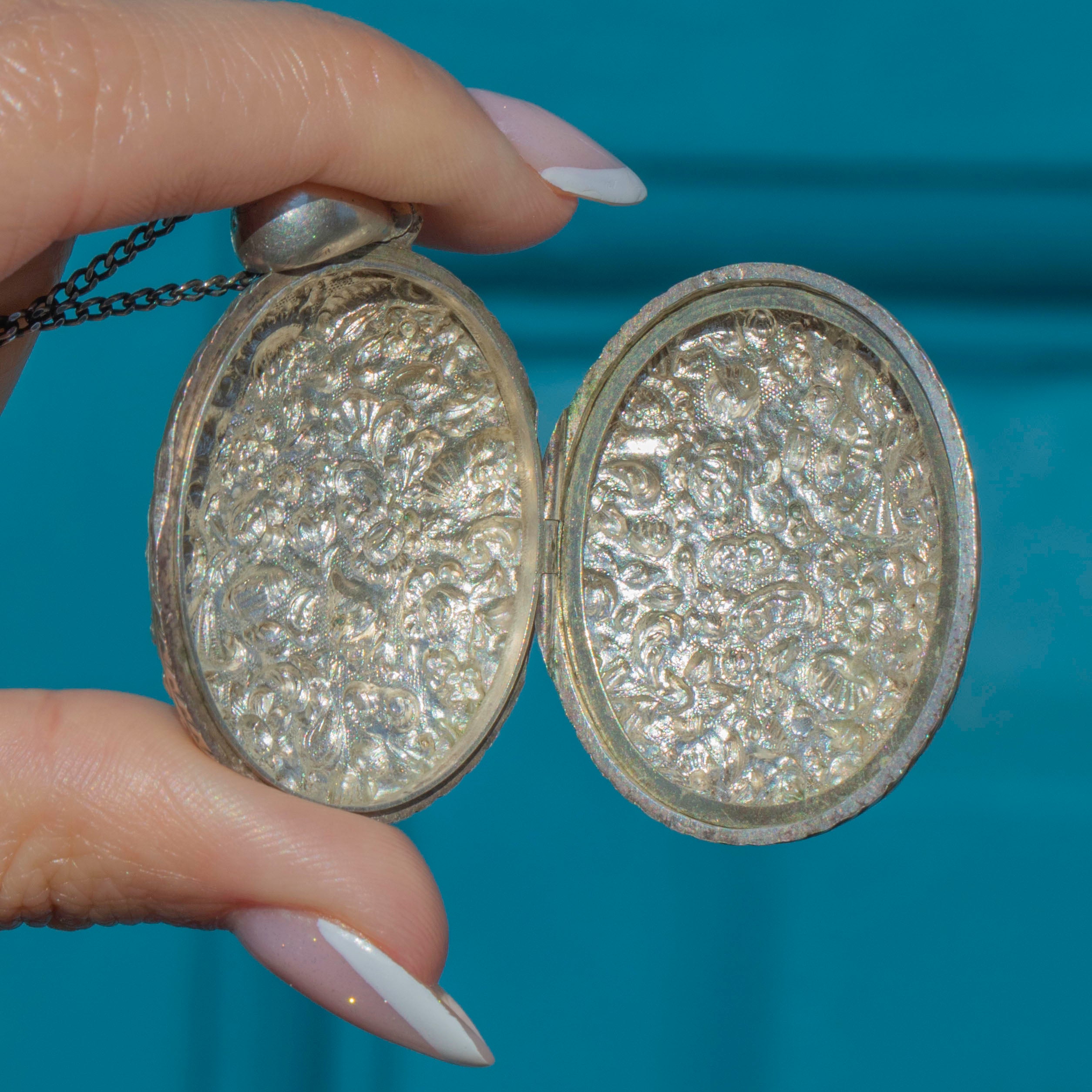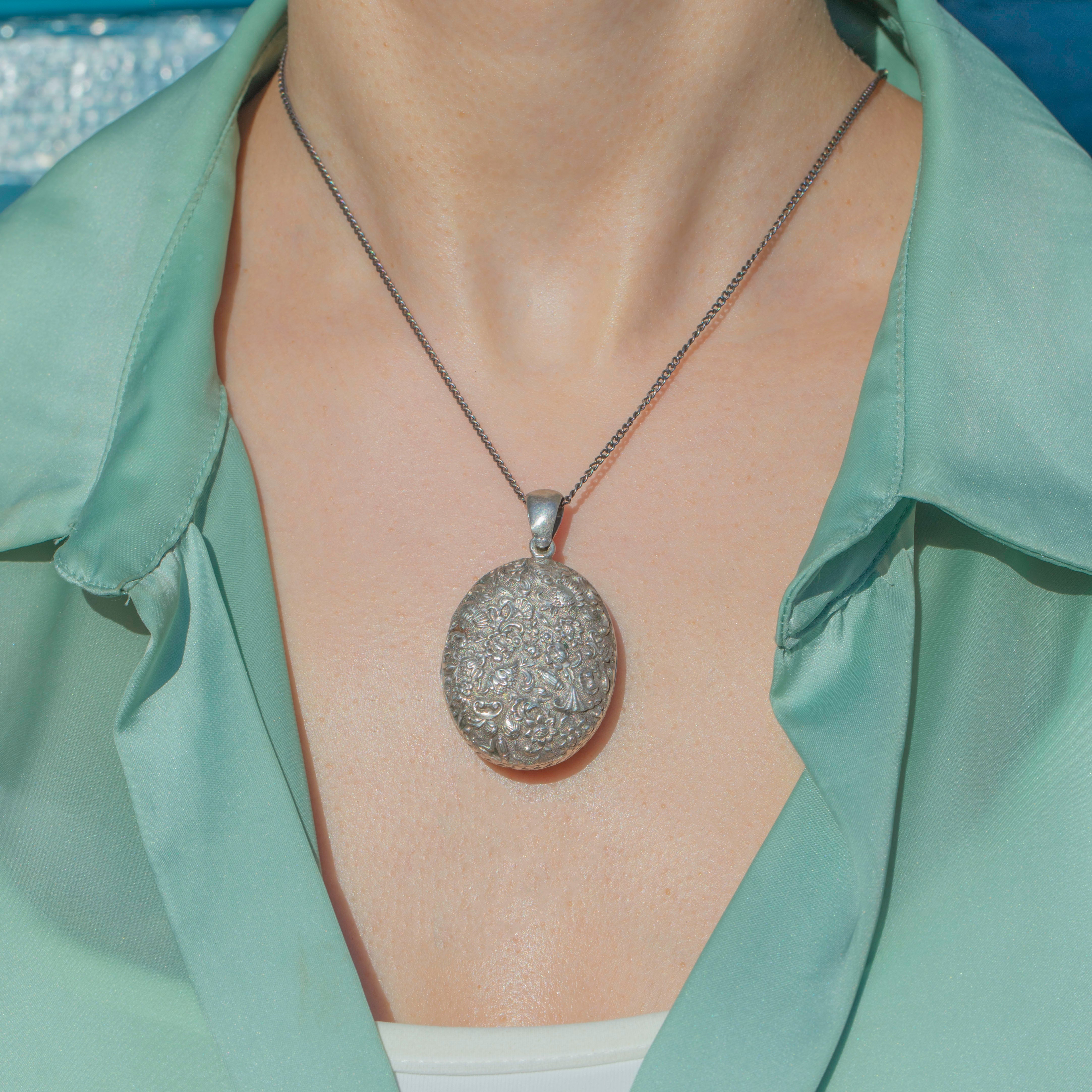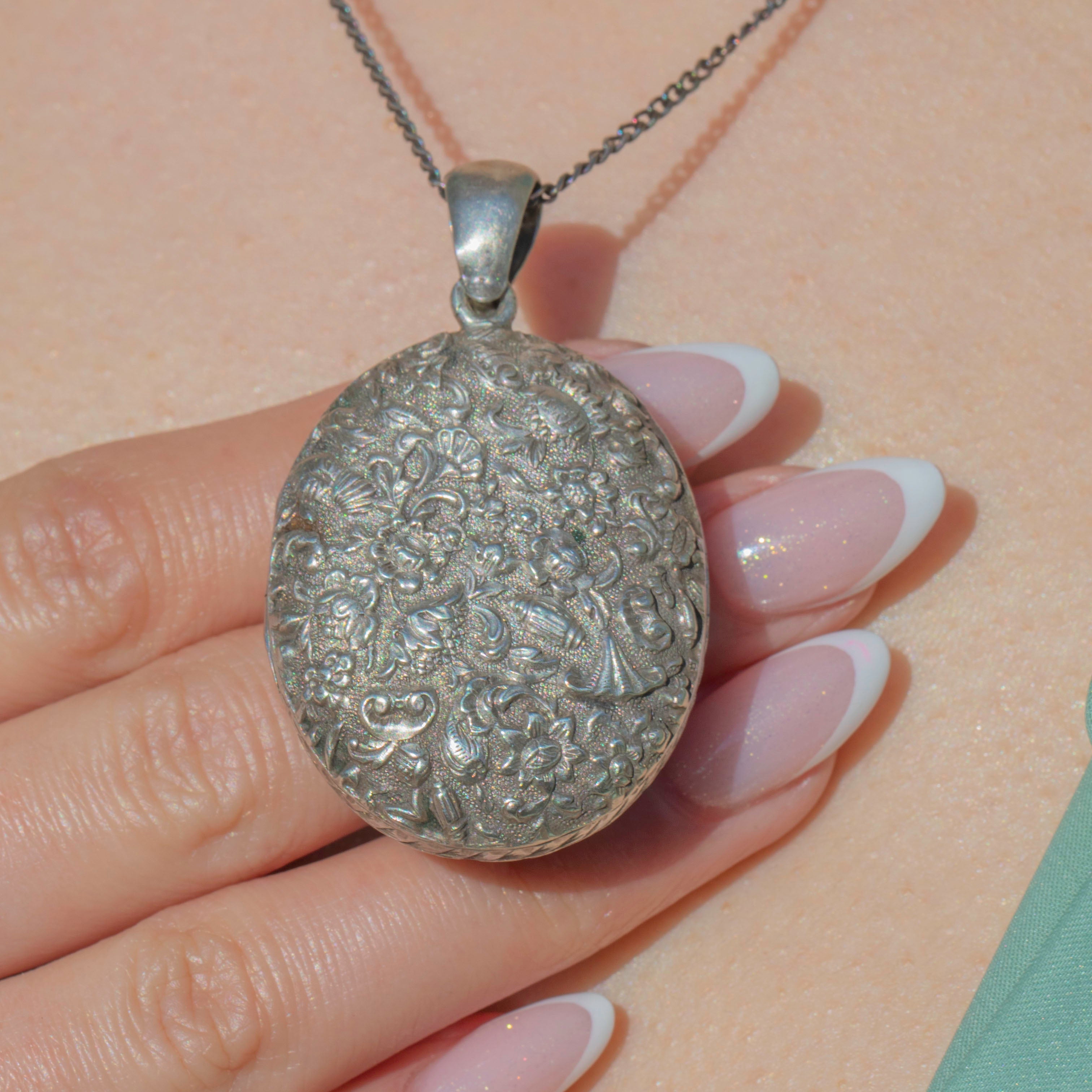 From thistles to forget-me-nots and dainty shells, this Victorian Silver locket is steeped in romantic sentiment! The impressive size of this repoussé locket makes it the ultimate statement piece, and with space for you to place a cherished photograph inside, she will make a sentimental addition to your collection.