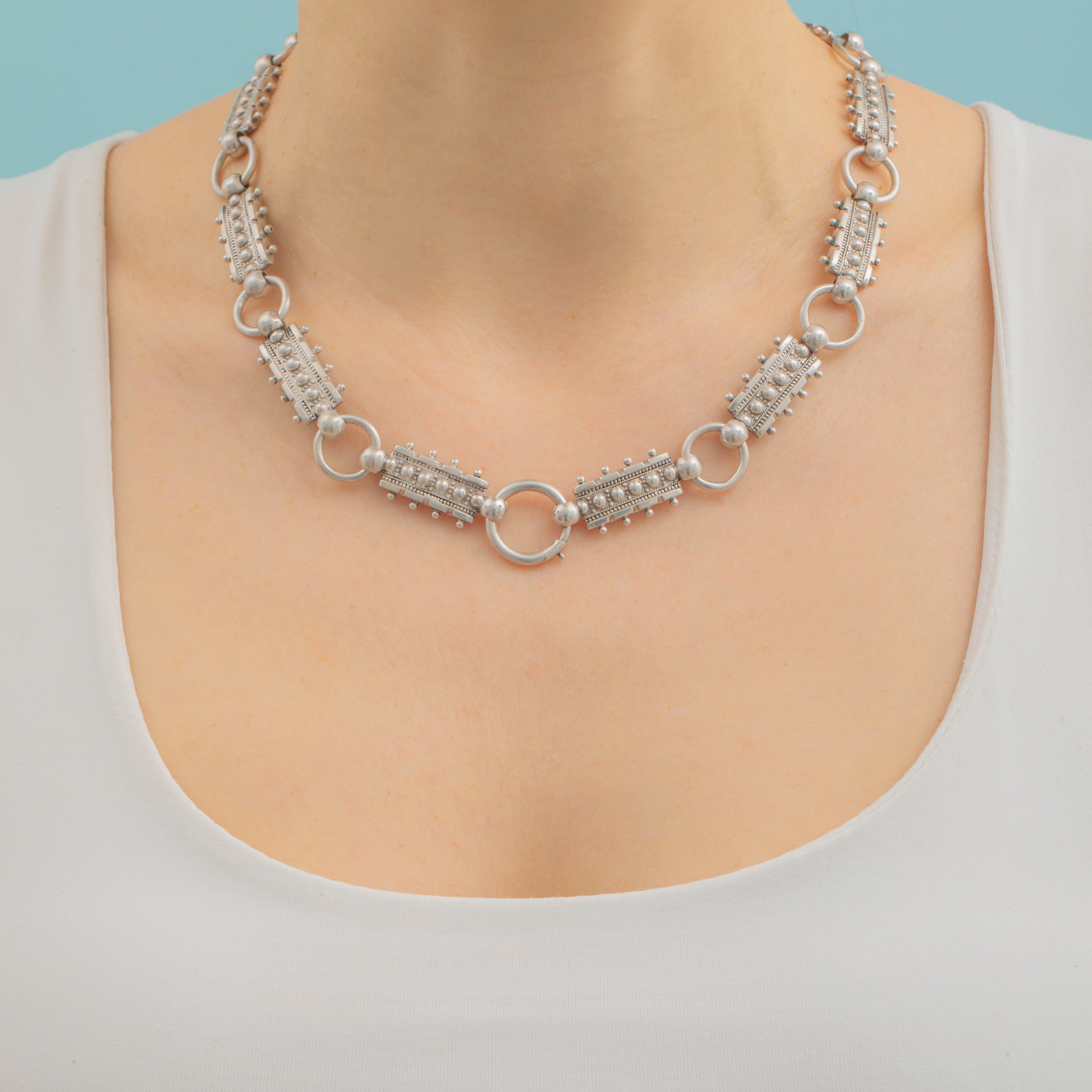 Composed of twelve rectangular links, each connected by large highly polished rings, she boasts bold studded details throughout. Quintessentially Victorian, this collar necklace is bursting with attitude!