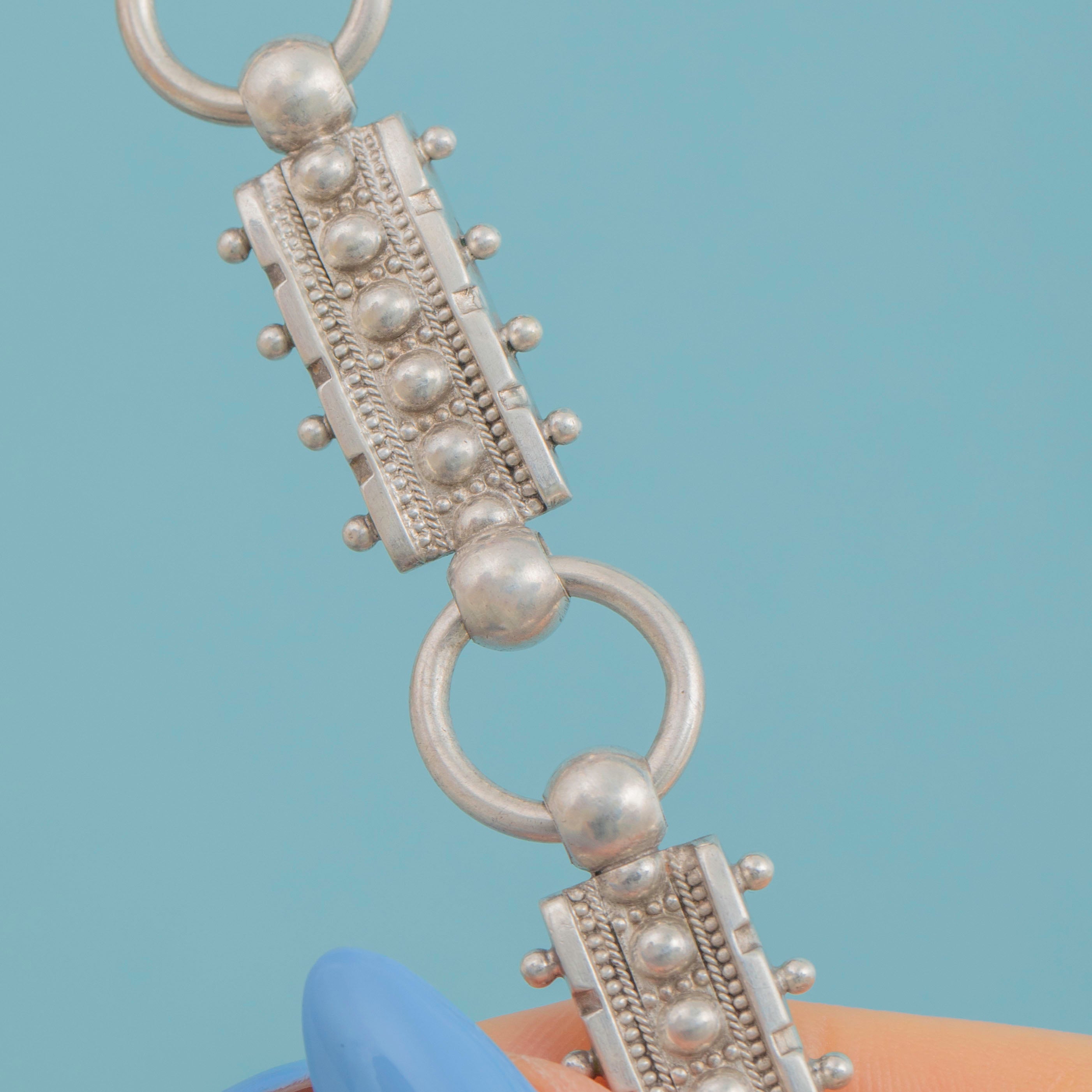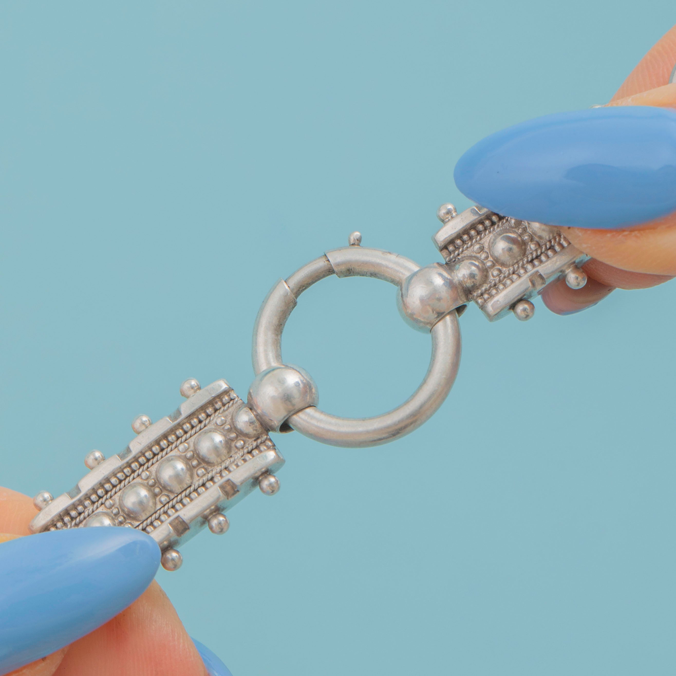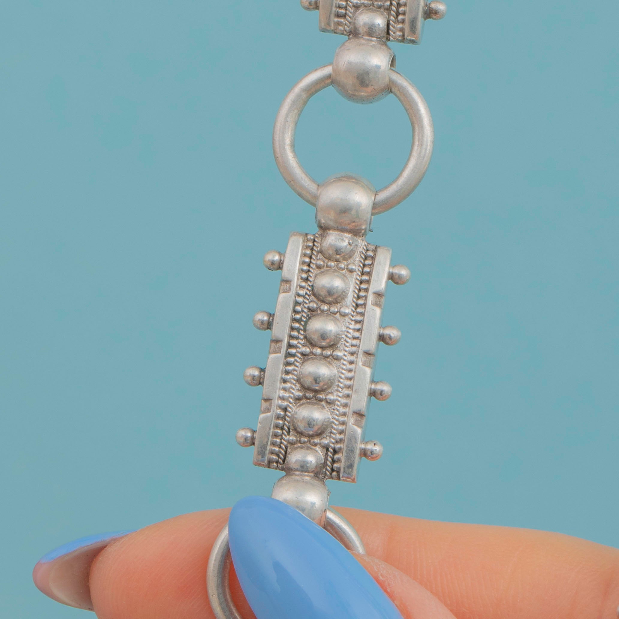 EXCELLENT. This Victorian Silver studded book-chain necklace is in very good antique condition. All the links are securely connected with crisp engravings. There is some light wear to the Silver throughout, commensurate with age, but this is to be expected from an item of this age.