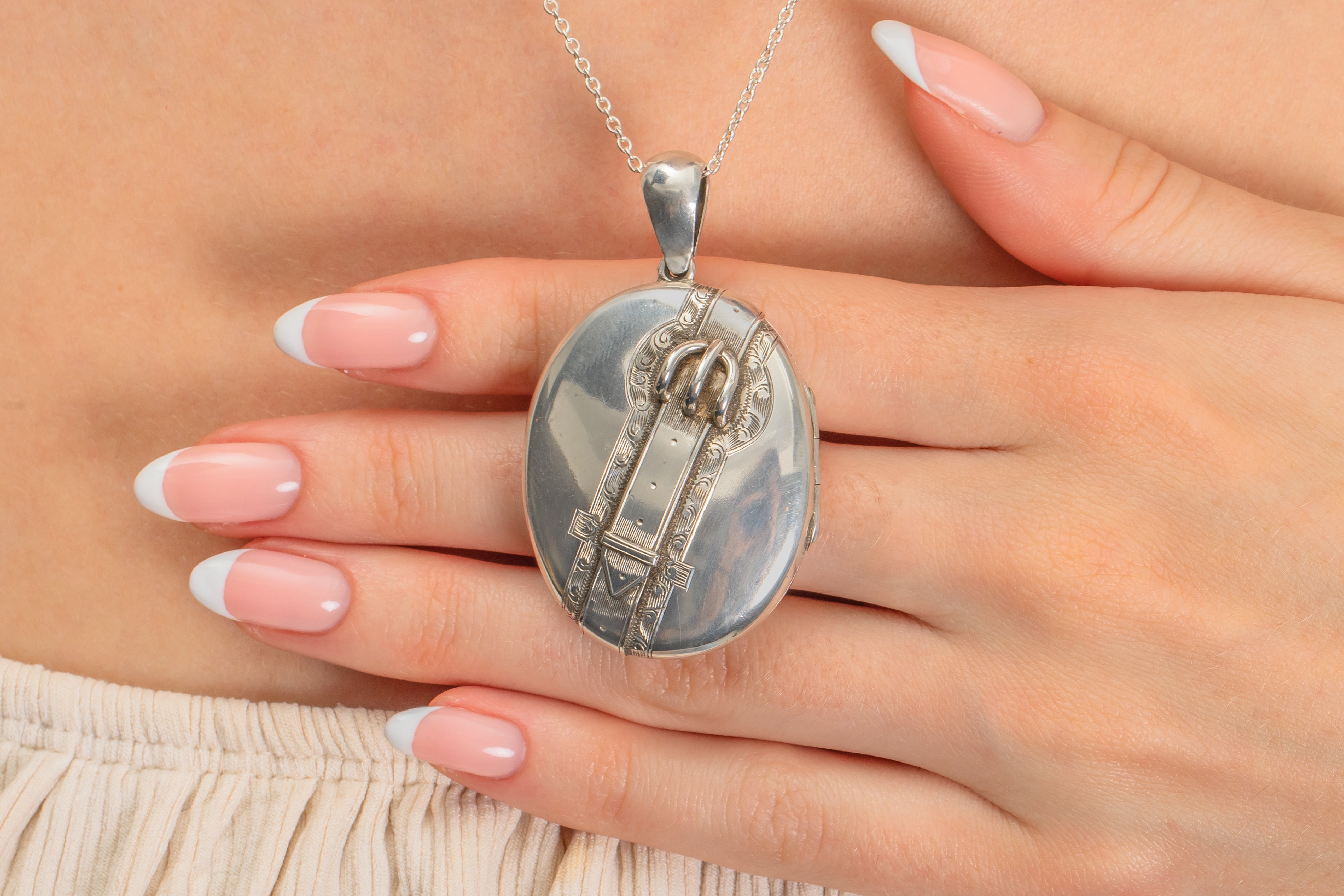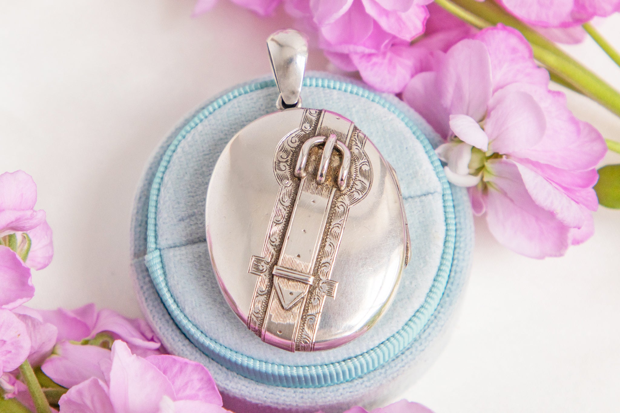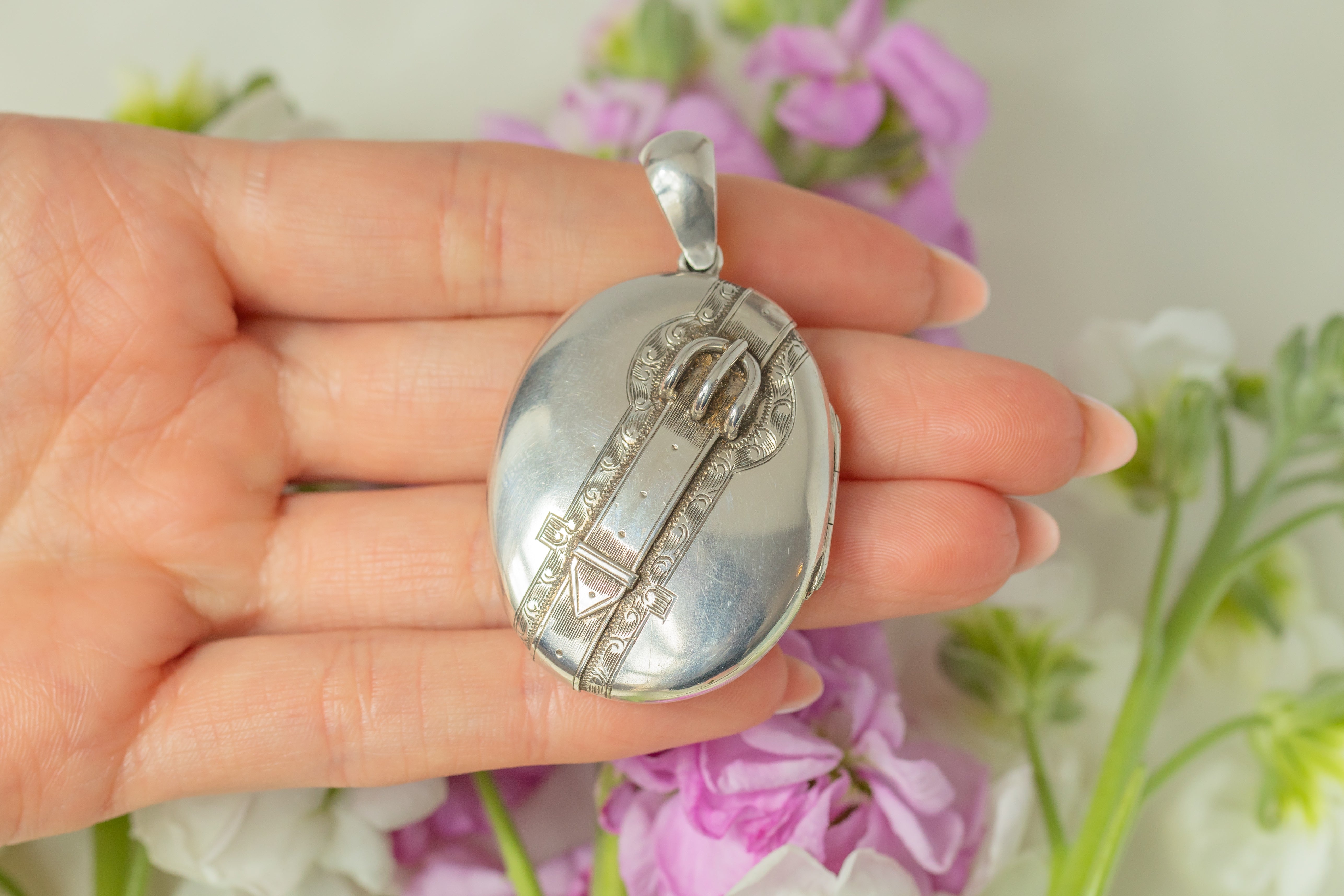 This impressive Victorian Sterling Silver buckle locket is as beautiful as it is large. The locket itself features an intricately textured belt design, symbolic of eternity and strength, giving this Victorian treasure a smart exterior imbued with poignant meaning.