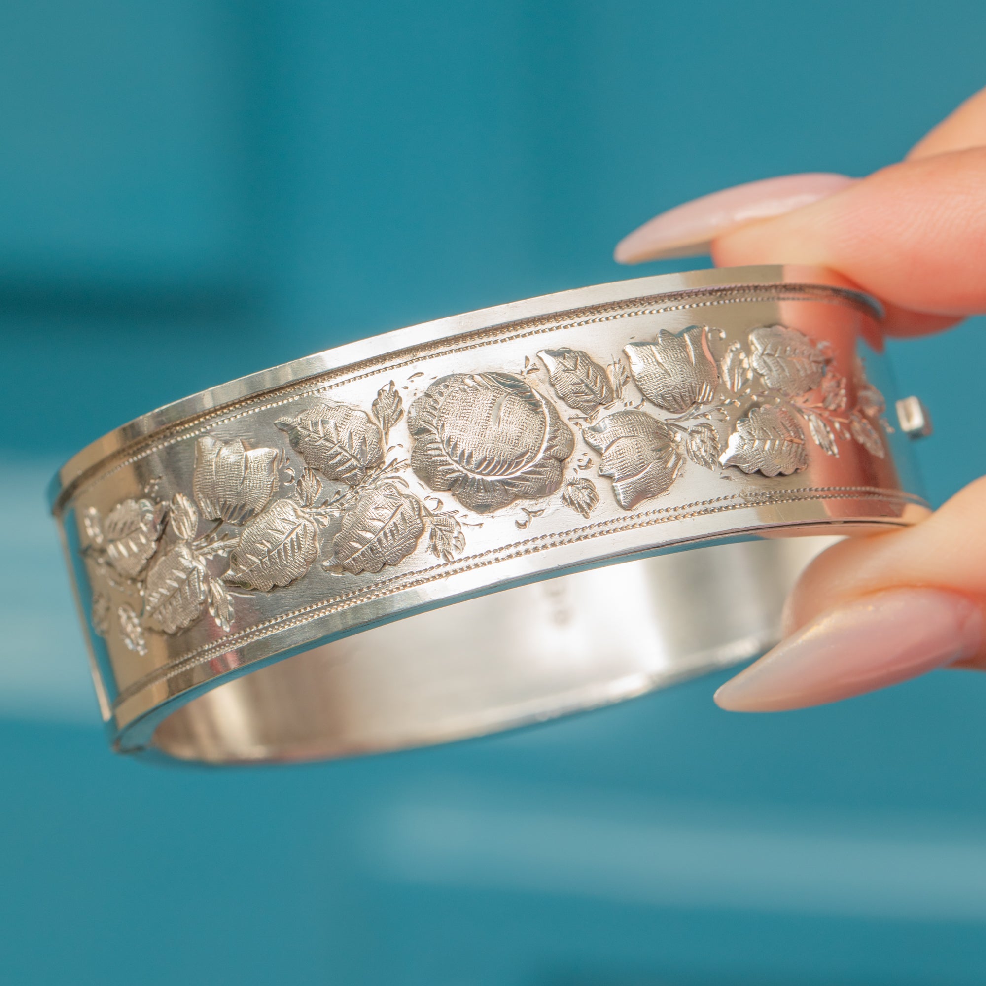 This Victorian Sterling Silver bangle is a beautiful example of the Aesthetic Movement, decorated with repoussé rose and leaf motifs across the front. The finely detailed flowers are framed by neat beaded edging, giving the piece both texture and elegance.