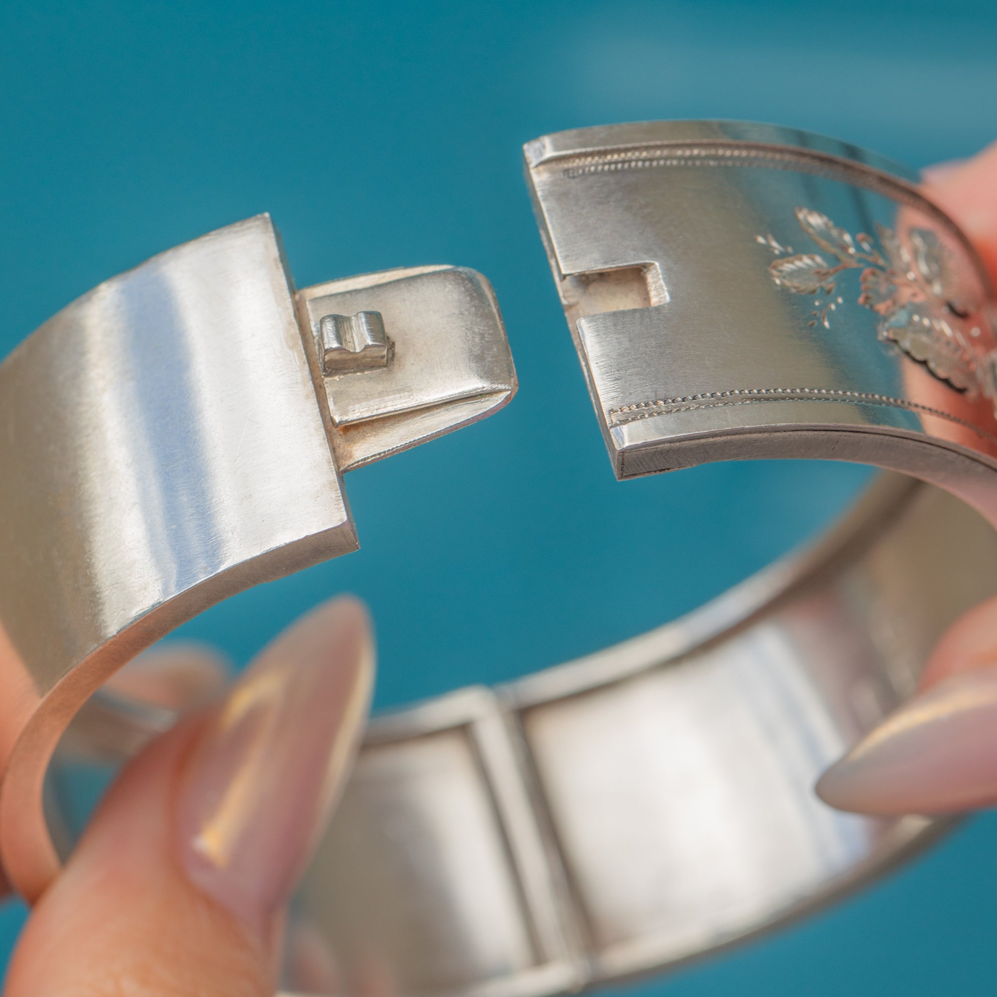 Fully hallmarked for Birmingham 1884 with the maker’s mark “S.Bros”, this hinged bangle combines artistry and craftsmanship in equal measure. At 27.6g and 20mm wide, it has a bold presence while remaining timelessly feminine and easy to style.