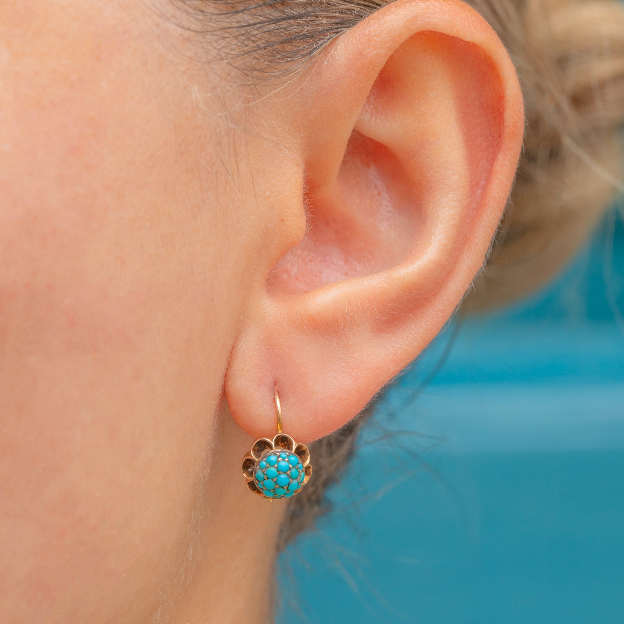 EXCELLENT: The earrings are in superb condition, with all turquoise stones present and undamaged. Gold settings remain bright and well-preserved, showcasing the quality of Victorian craftsmanship.