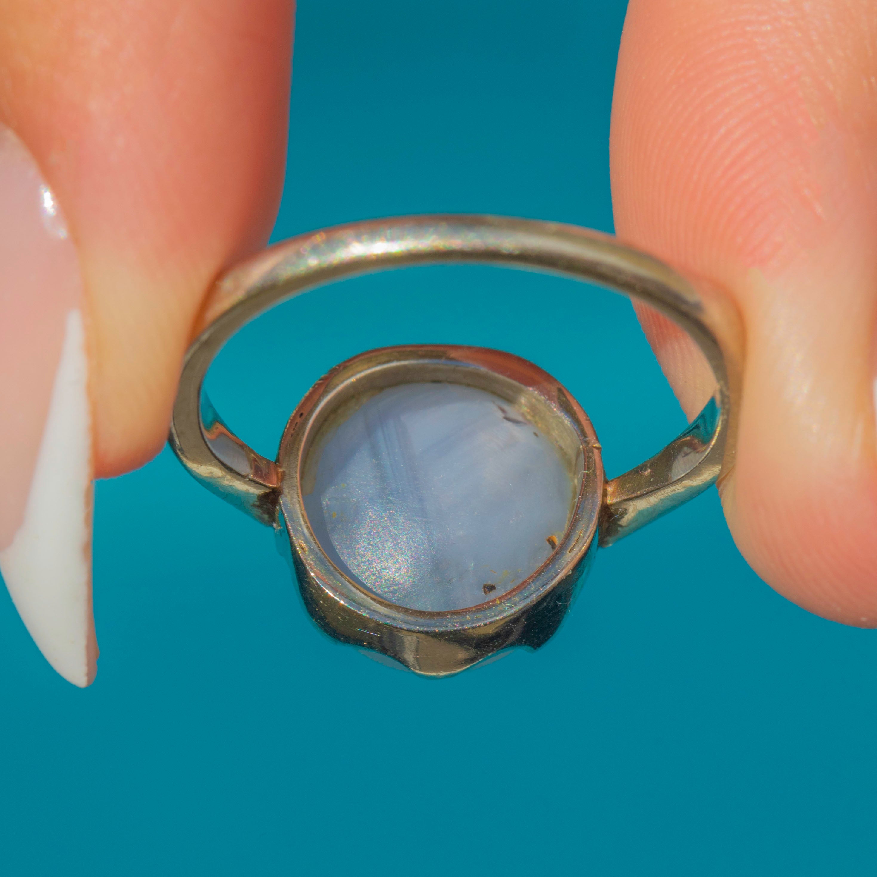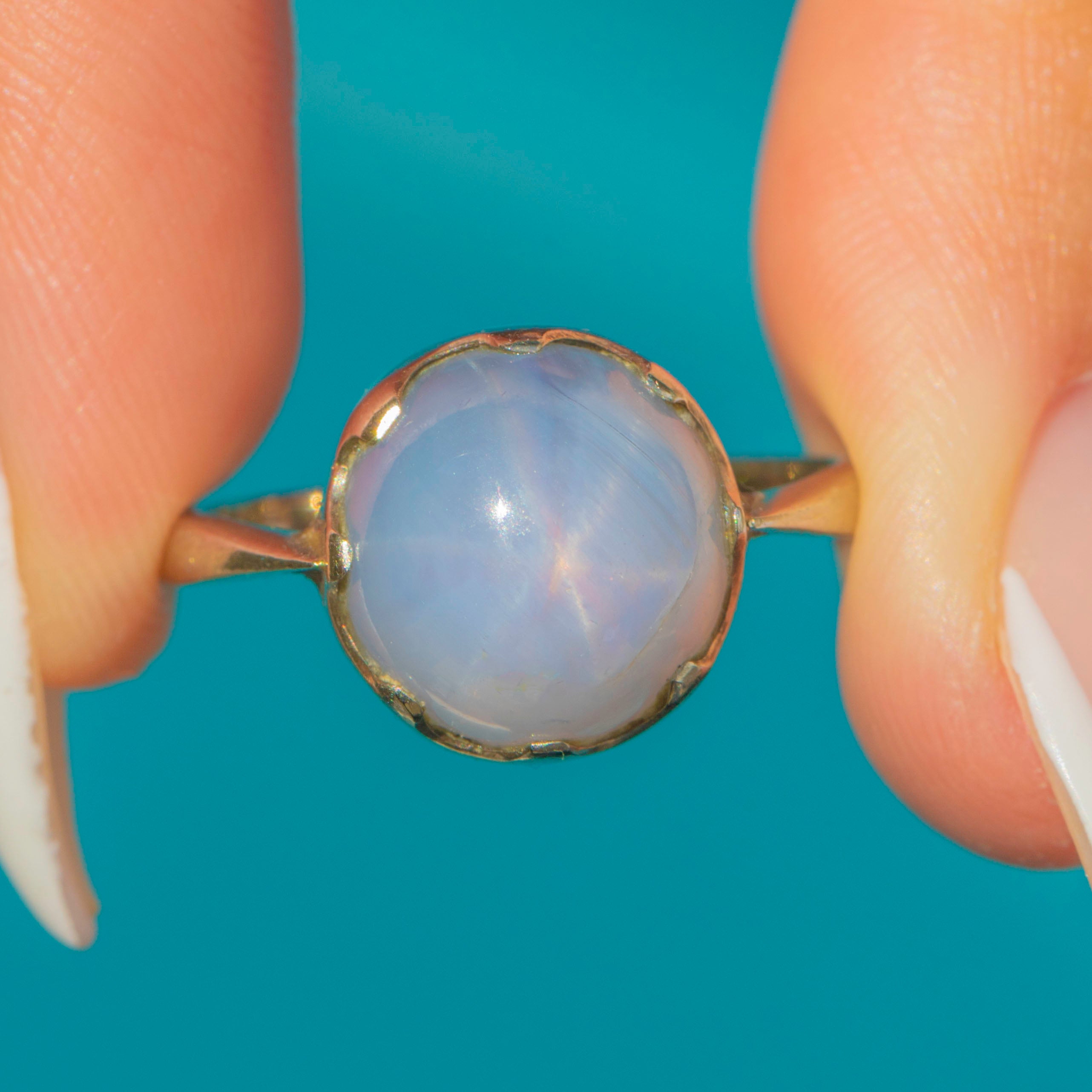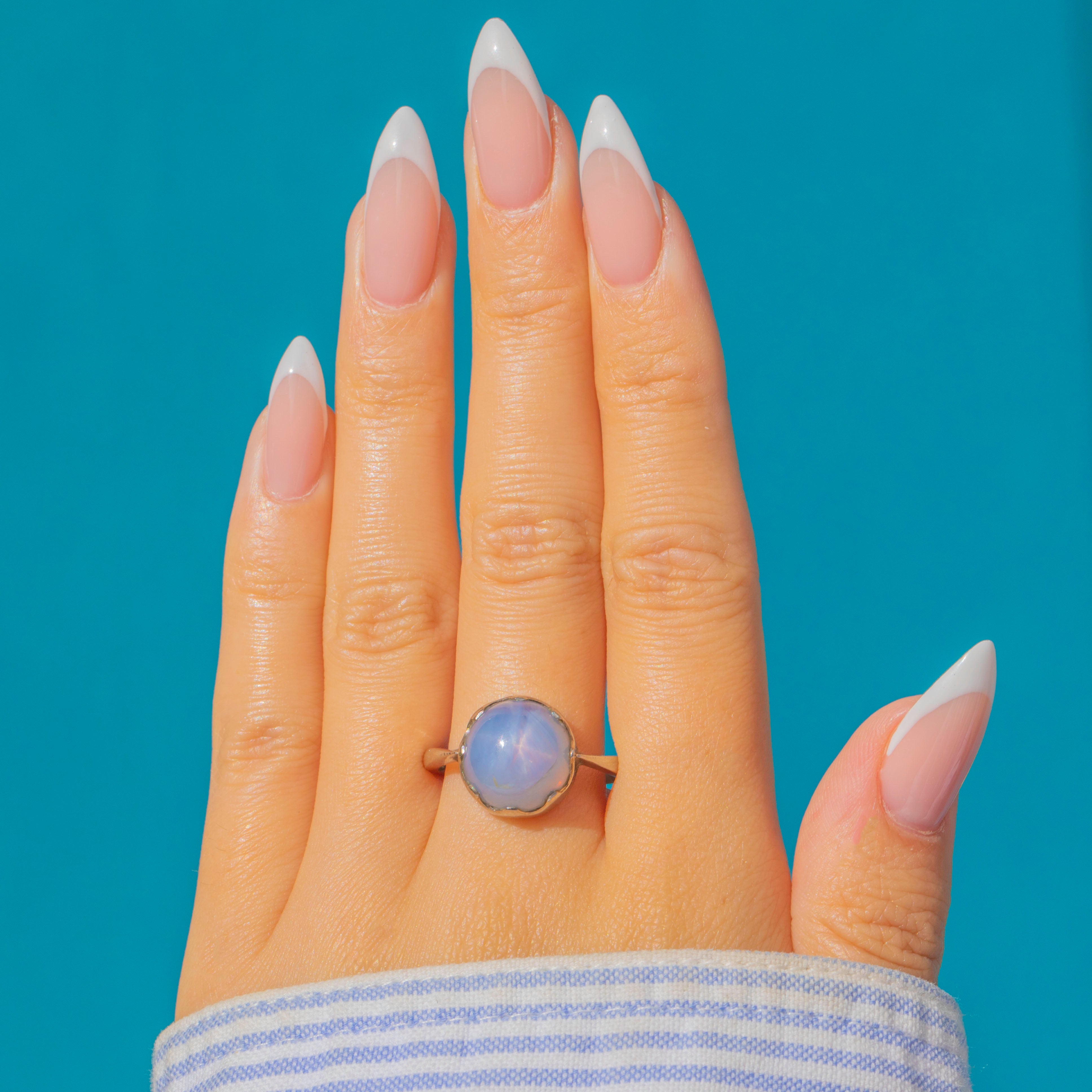 A glowing Vintage Star Sapphire ring in 14ct Gold. The high-domed cabochon shows a crisp six-rayed asterism that rolls beautifully across the stone in the light, framed by scalloped claws and a clean, minimal shank. Classic, wearable, and effortlessly striking.