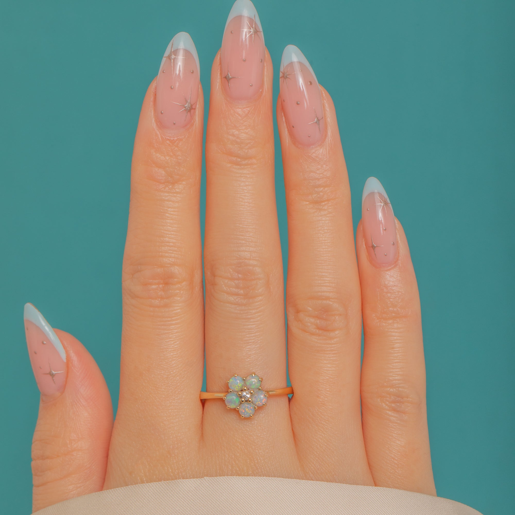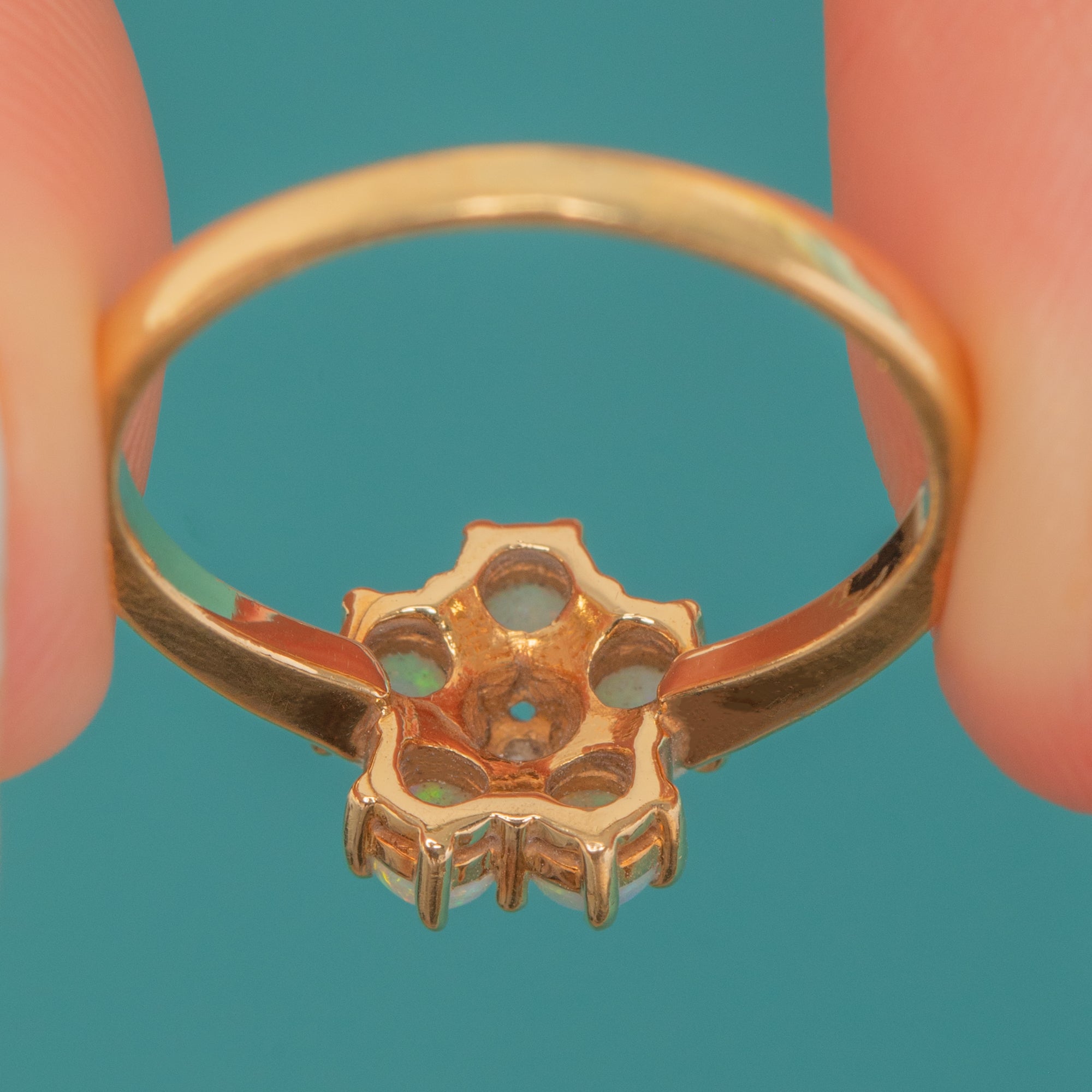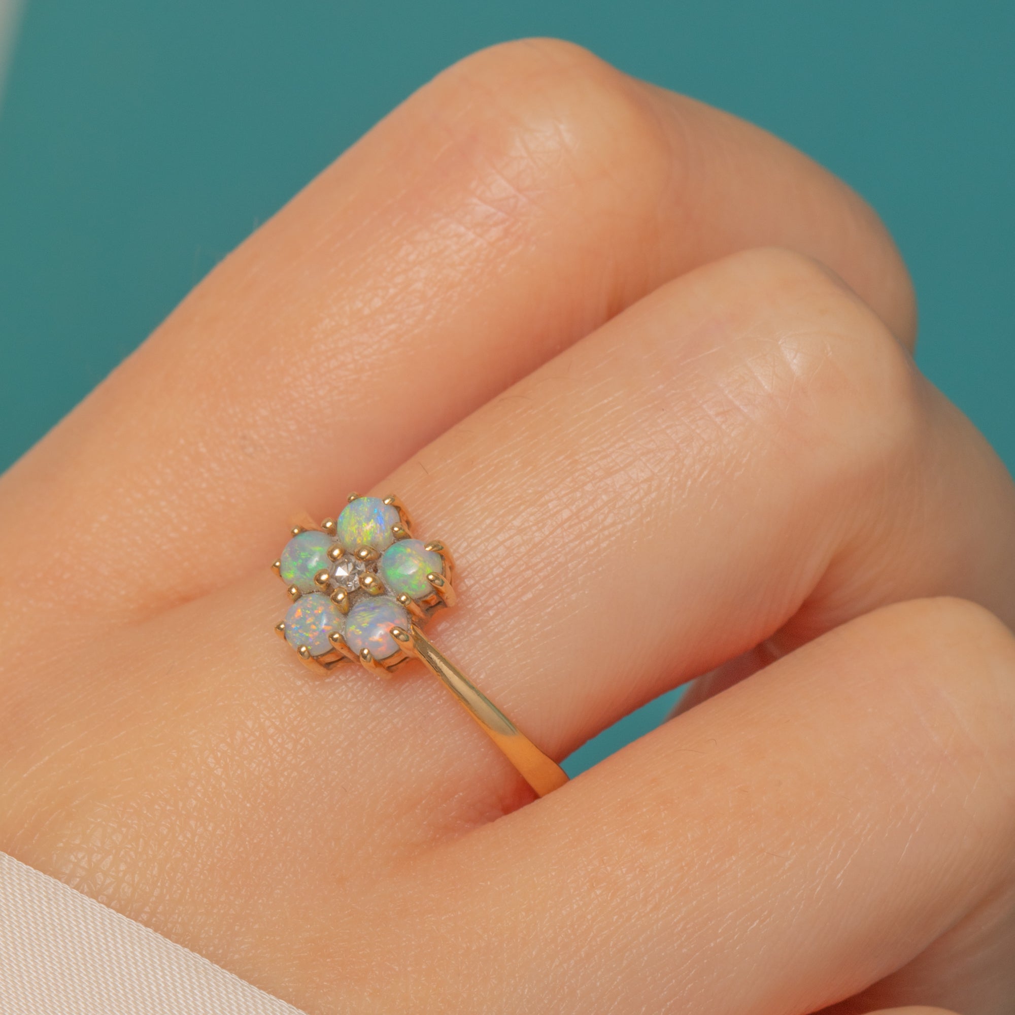 Pretty as a petal, this Vintage 18ct Gold flower cluster ring blooms with five luminous Opals encircling a twinkling rose-cut Diamond. The Opals display delicate flashes of green, blue and orange, their milky glow beautifully contrasted by the crisp sparkle of the Diamond at the heart of the cluster.