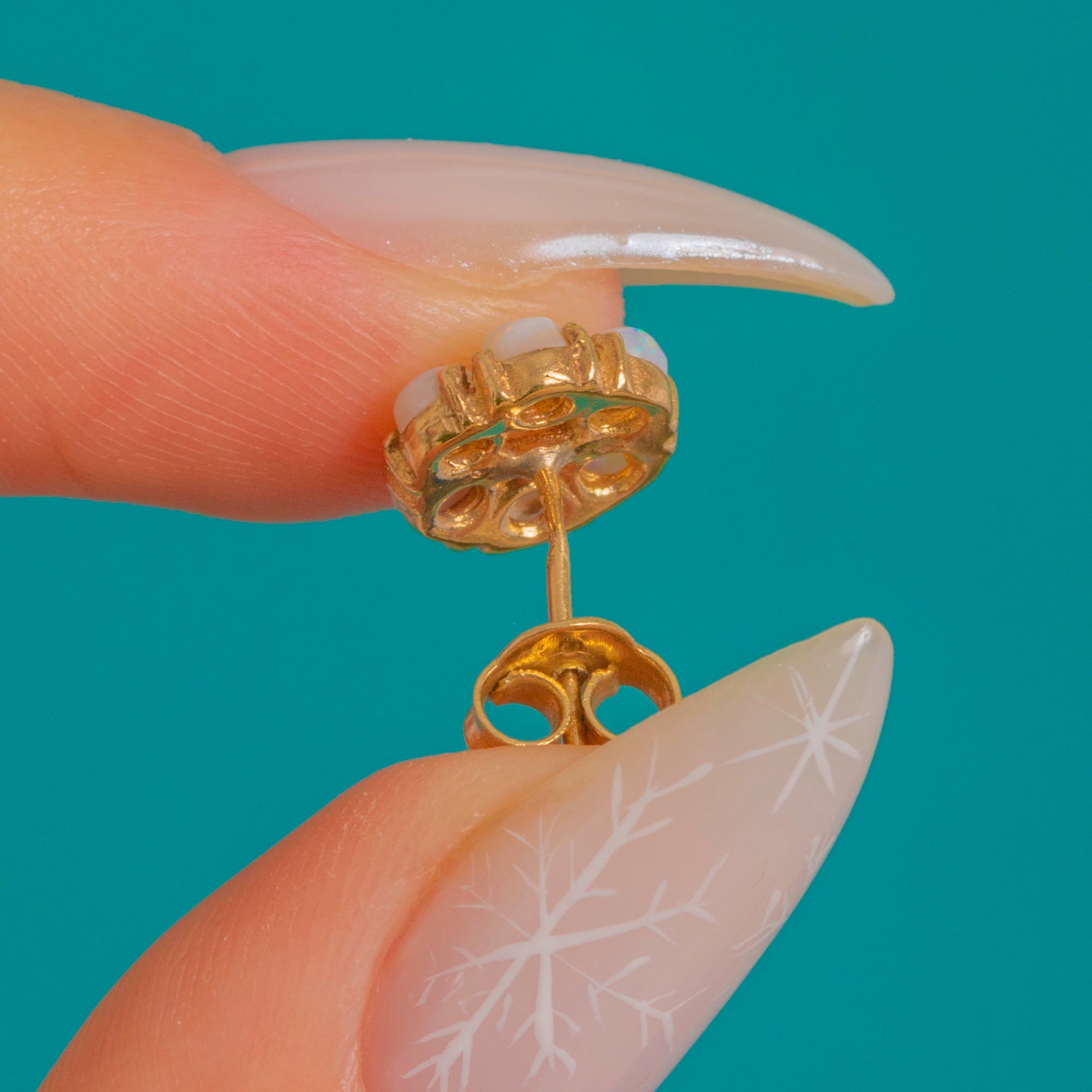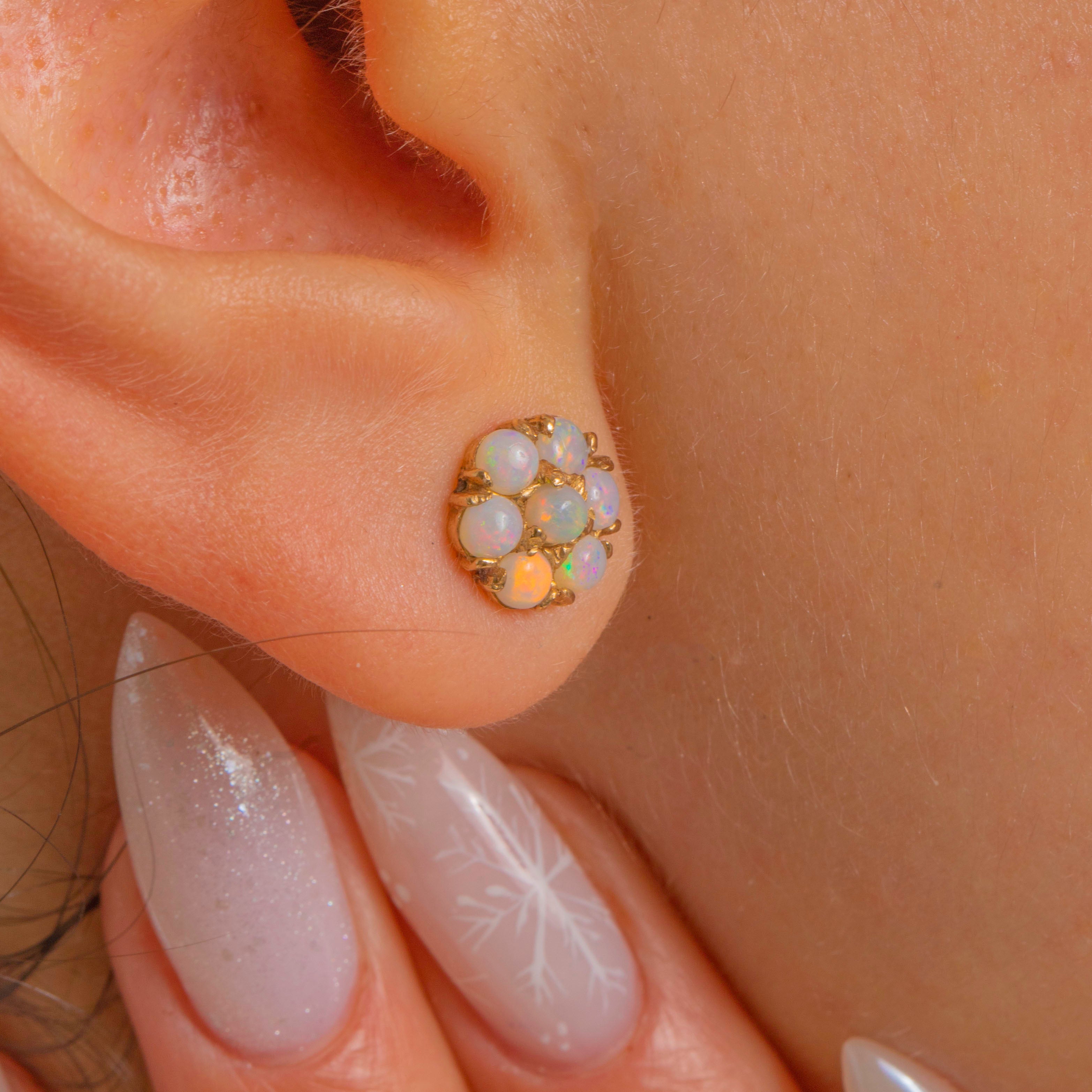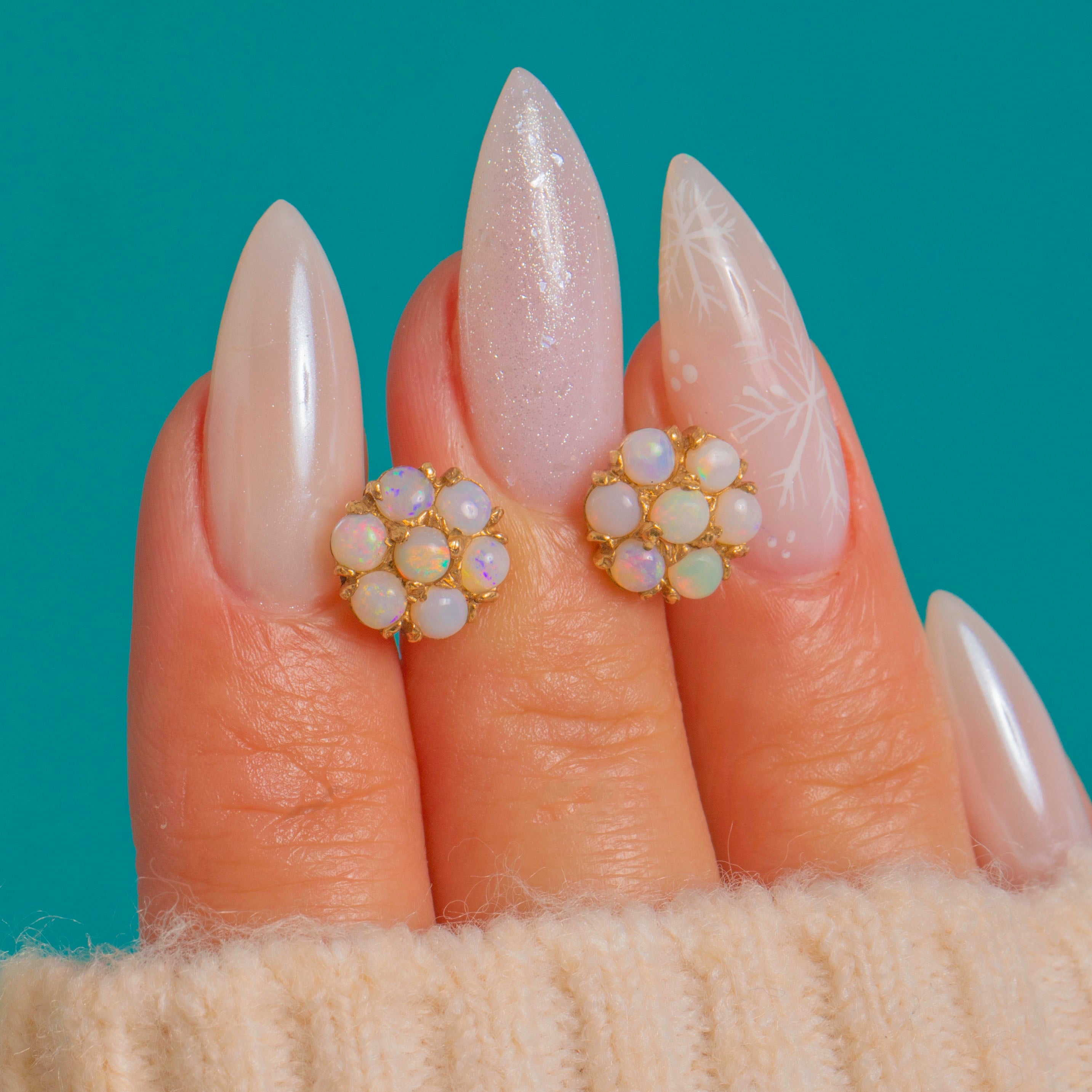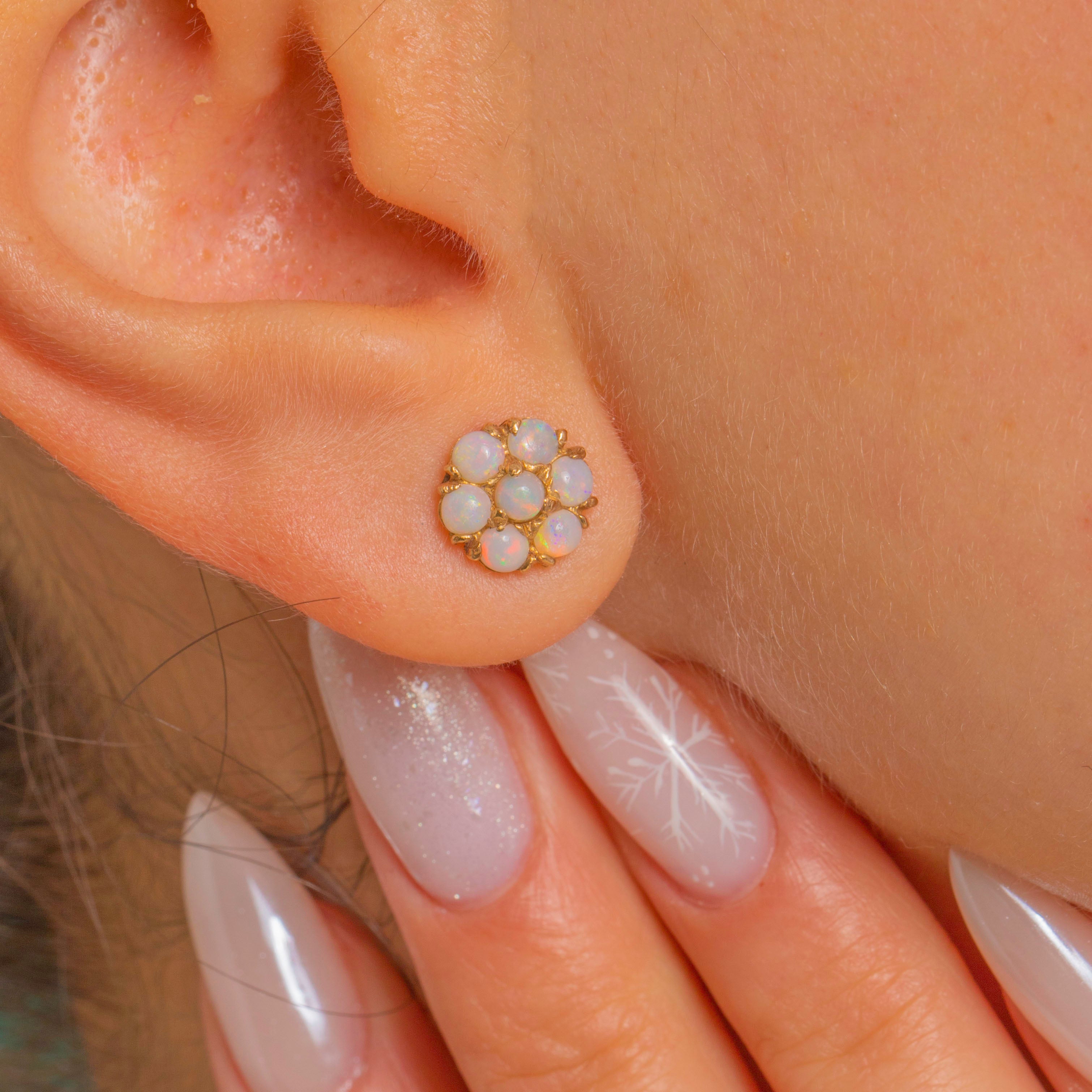 Petite and timeless, these Vintage Opal cluster studs bloom like tiny daisies in 9ct Gold. Each earring is formed as a seven-stone cluster with smooth, round Opal cabochons prong-set in a delicate scalloped gallery.