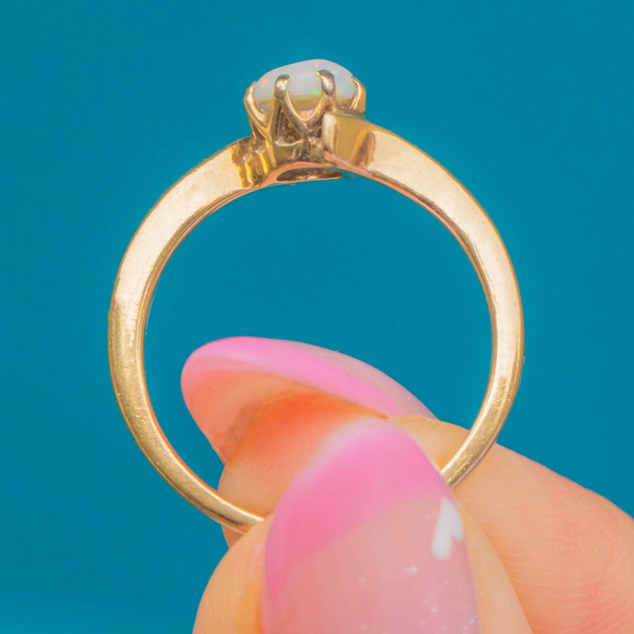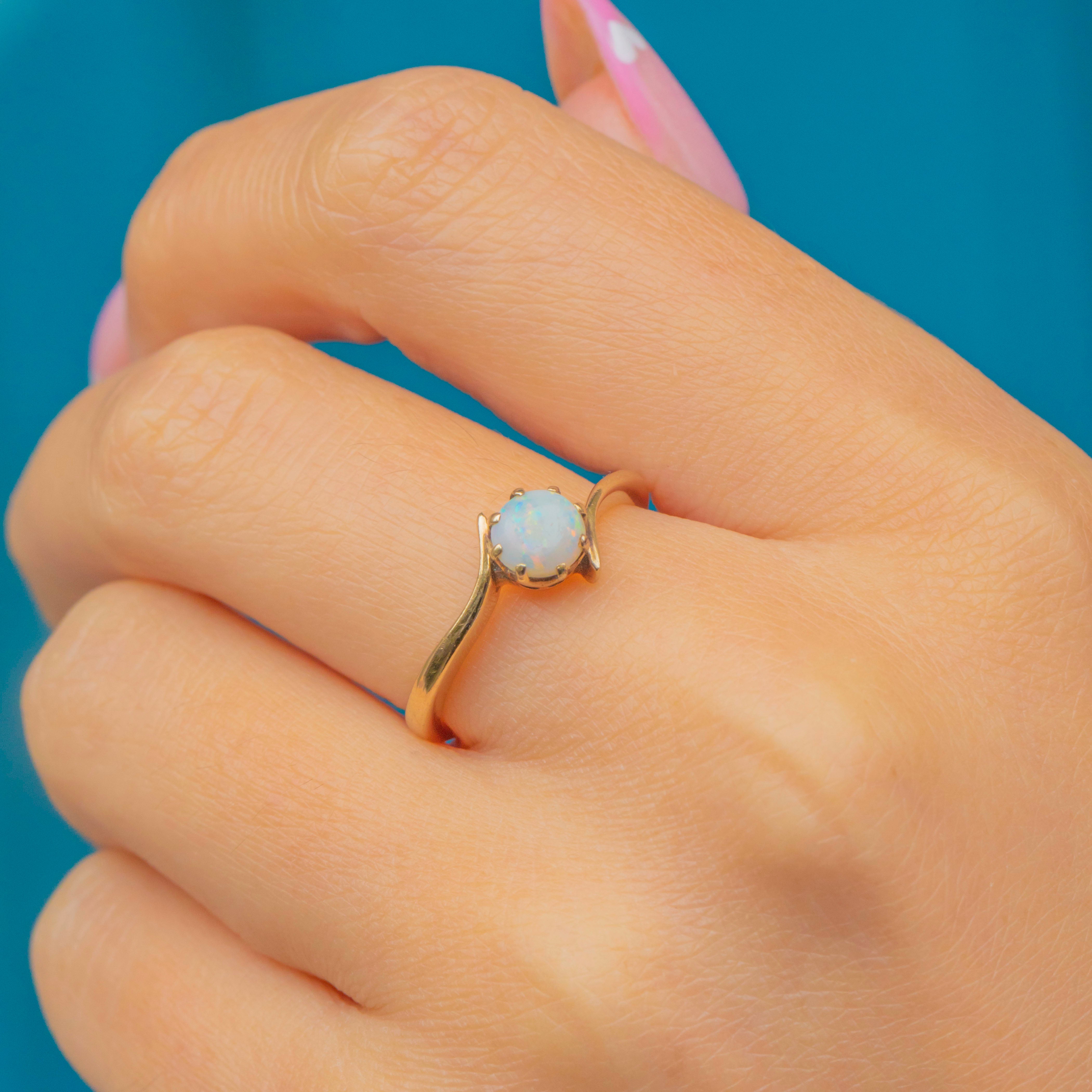 This charming Vintage Opal ring features a graceful crossover design, beautifully crafted in warm 9ct Gold. The natural solid Opal sits proudly at the centre, its milky body showing flashes of pink, green and blue as it catches the light.