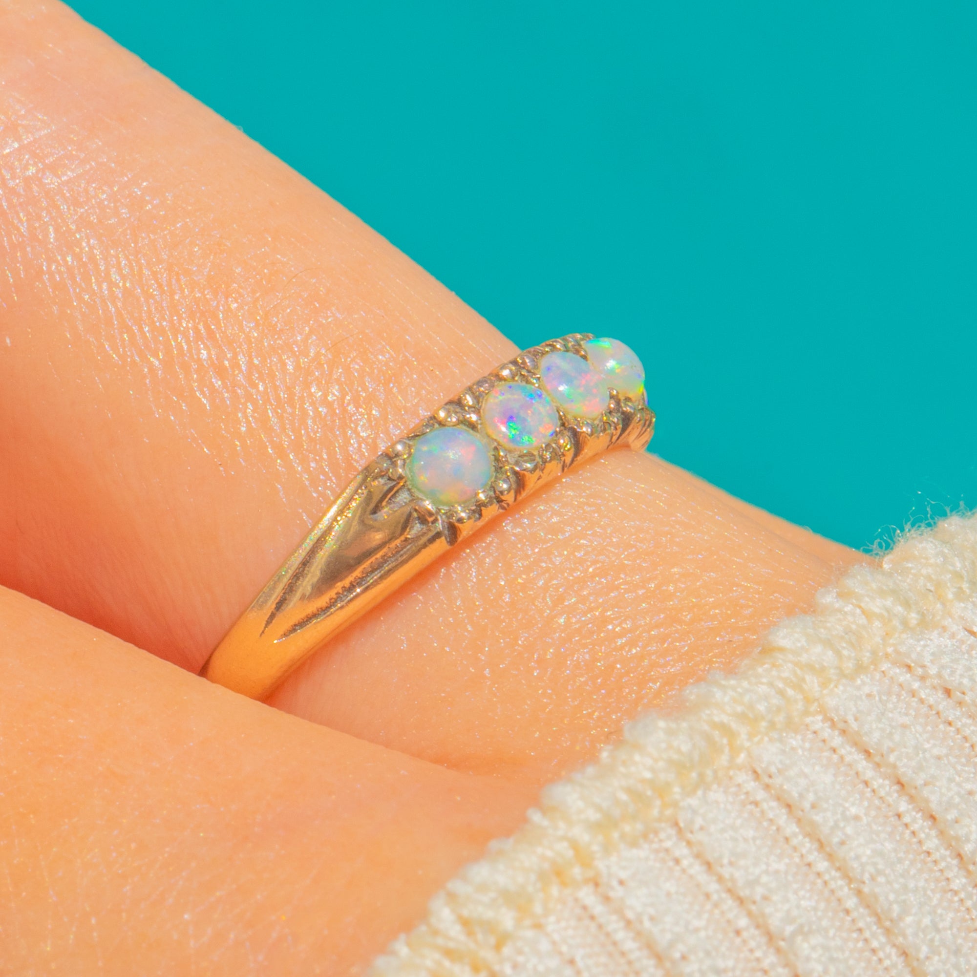 A charming mid-century Vintage five-stone ring in 9ct Gold, set with luminous Opal cabochons in a low, slim profile.