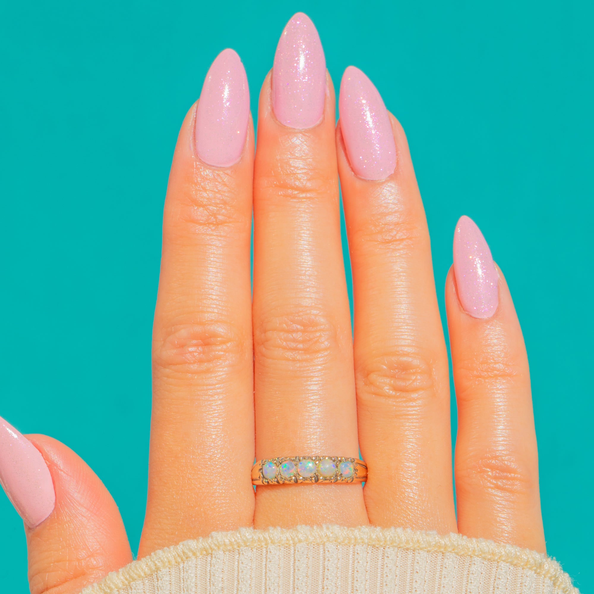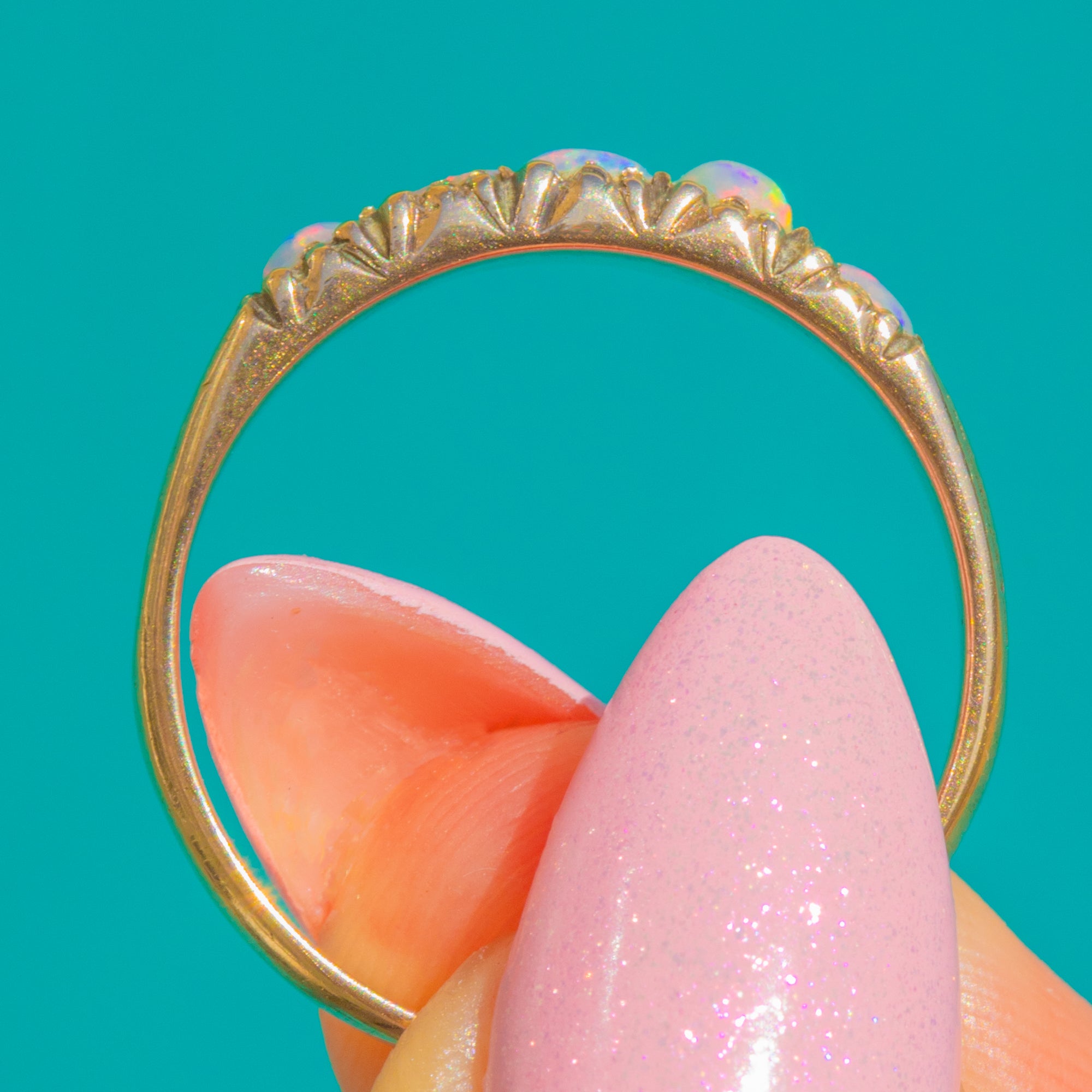 The Opals display a soft play of colour with flashes of blue, green and pink that glow against the warm Gold. Graceful tapered shoulders and the subtly ornate gallery keep the silhouette elegant yet easy to wear—perfect alone or stacked for everyday sparkle.