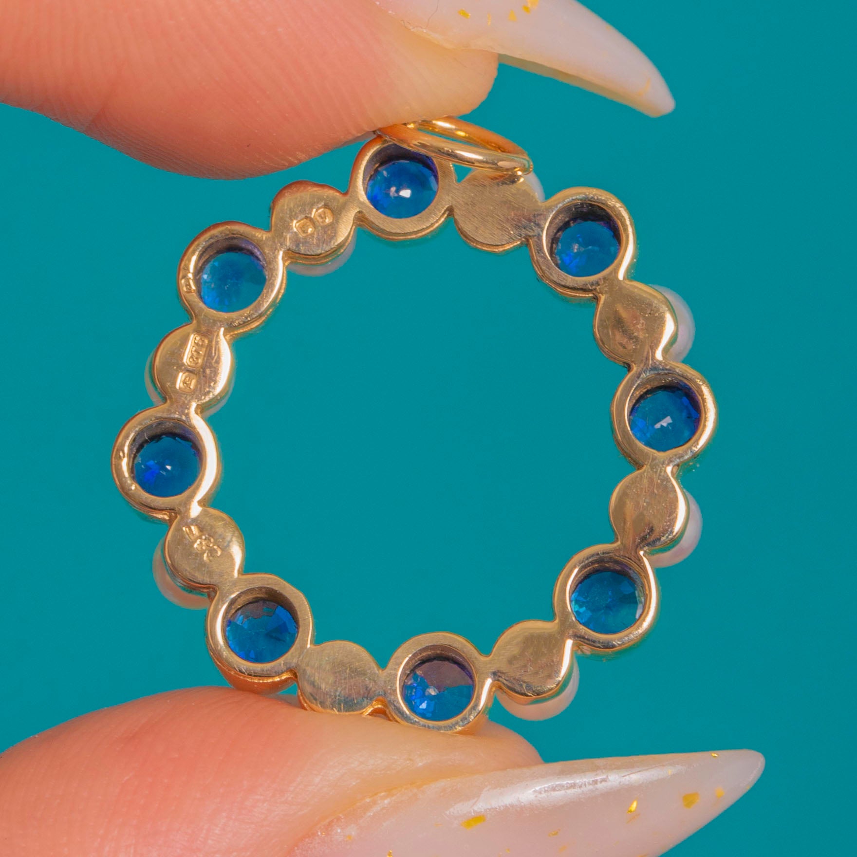 A chic Vintage wreath pendant in 9ct Gold, set with an elegant rhythm of round faceted Sapphires and luminous Pearls. The Sapphires are neatly embraced by smooth rub-over collets, creating a refined halo with a scalloped inner contour and a beautifully polished, golden glow.