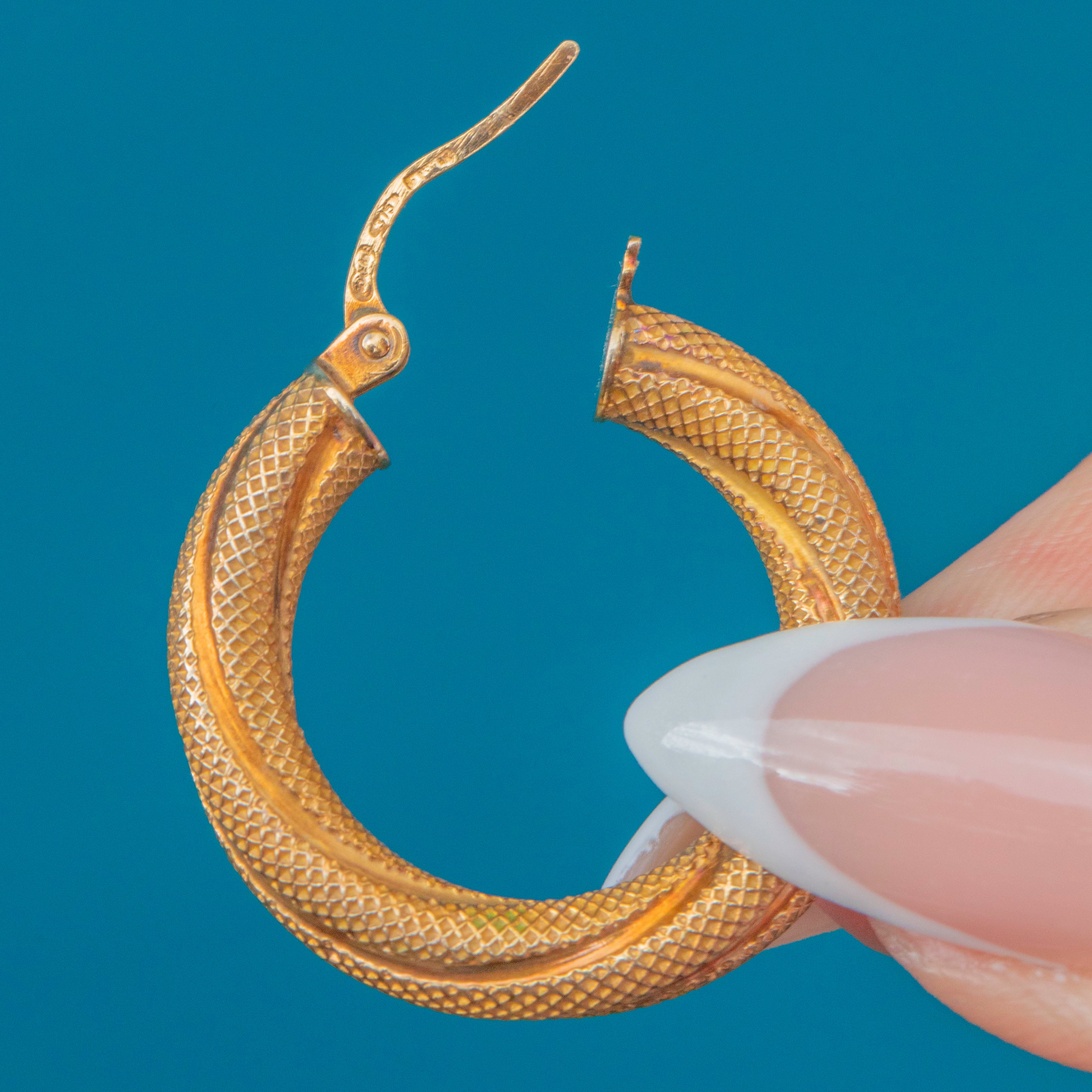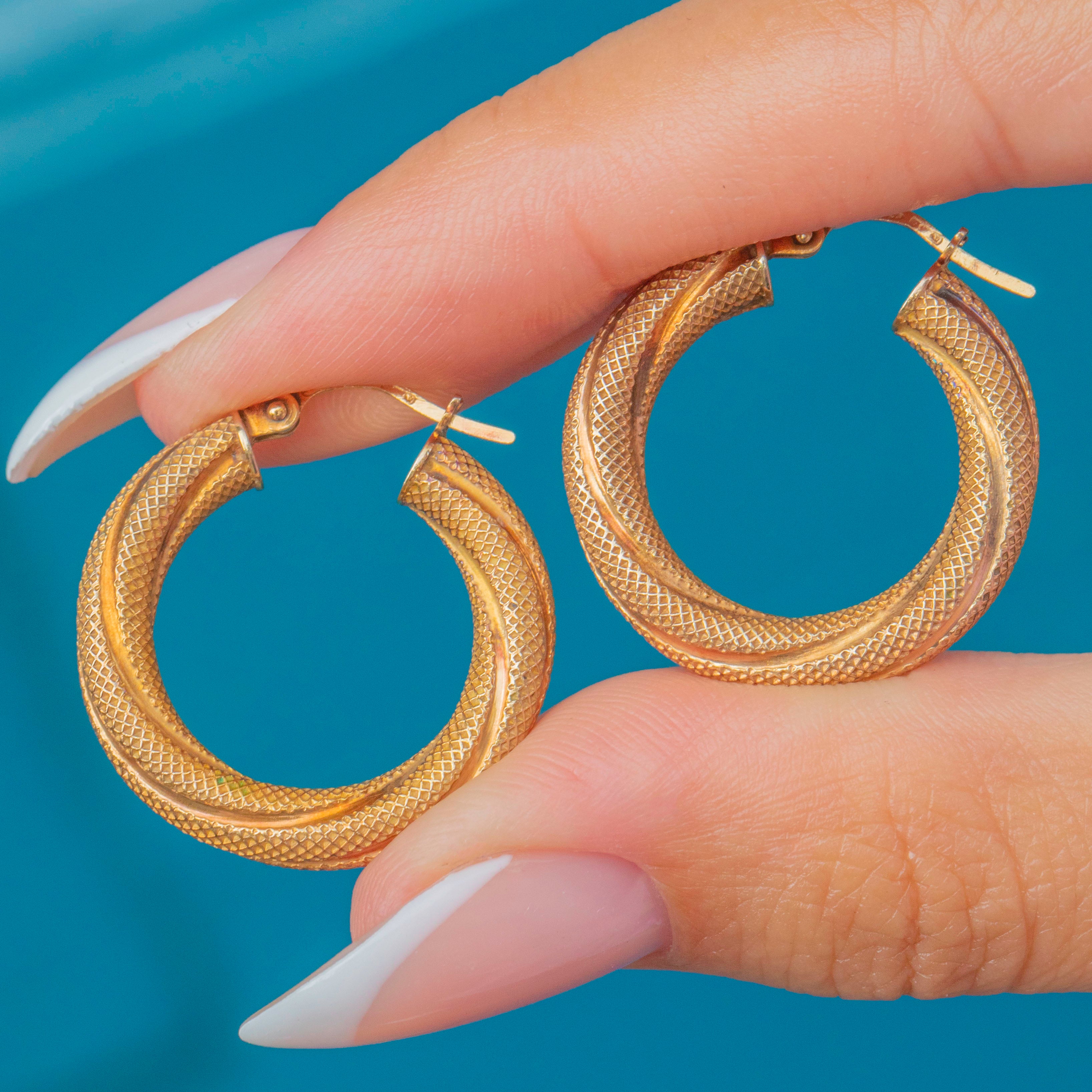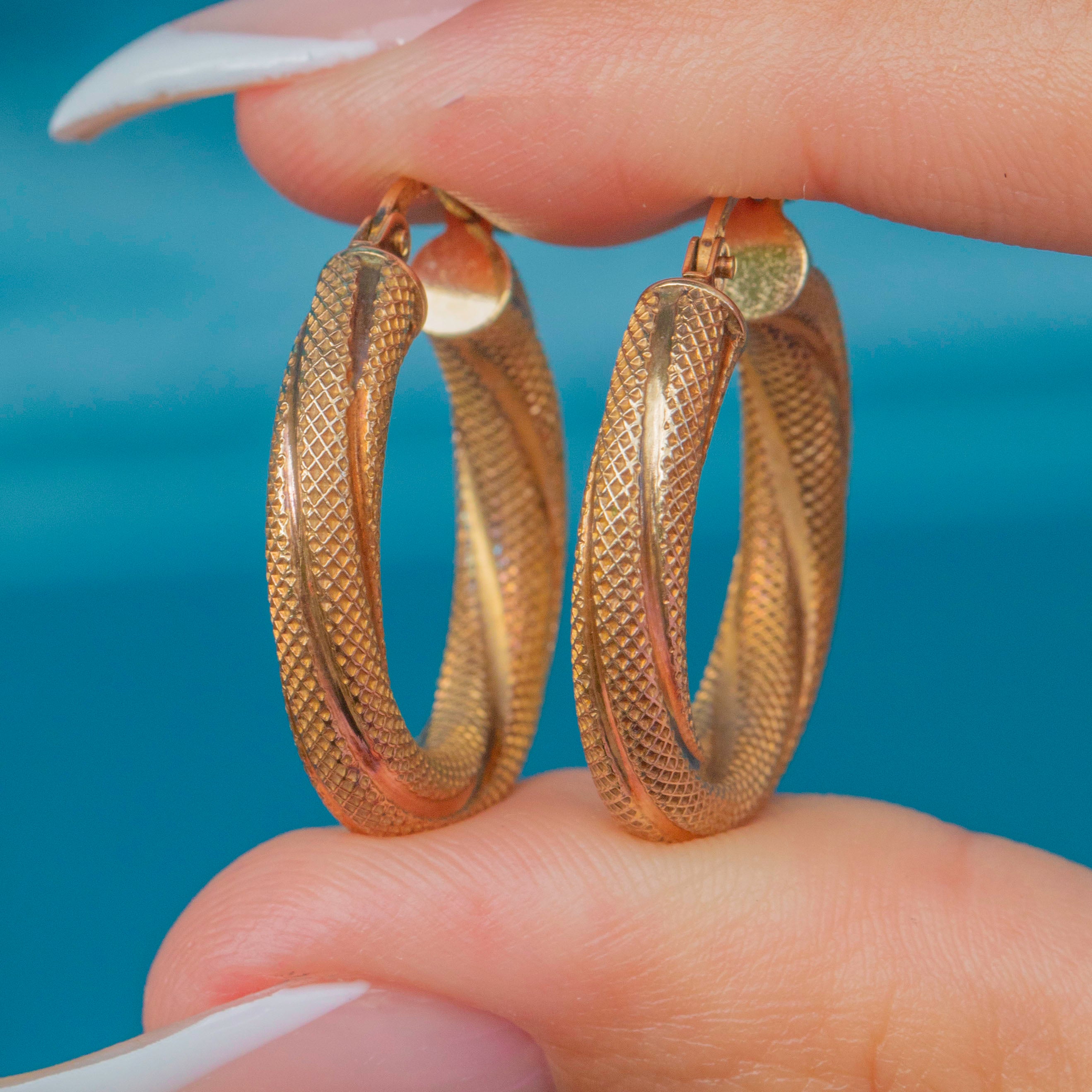 A chic pair of Vintage 9ct Gold twisted hoop earrings, crafted in Italy by the renowned maker UNOARRE. Their elegant spiral design and beautiful textured detailing catch the light with every movement, adding subtle sparkle and depth. Lightweight and easy to wear, these hoops are a perfect everyday staple with timeless appeal.