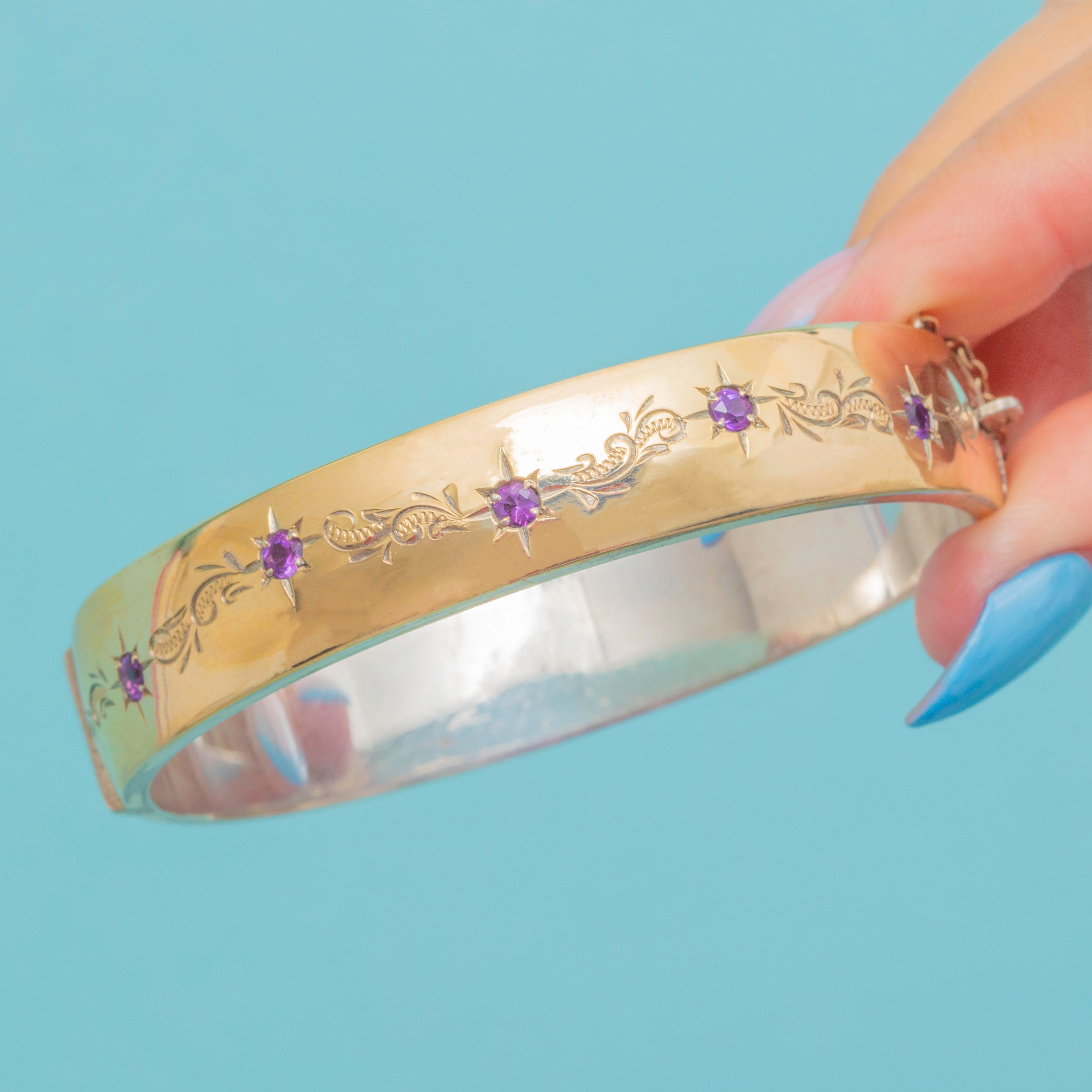 Adorned with five star-set Amethysts, each flanked by intricate engravings, it simply radiates vintage allure. Chunky yet lightweight, this ornate bangle is perfect for everyday wear.