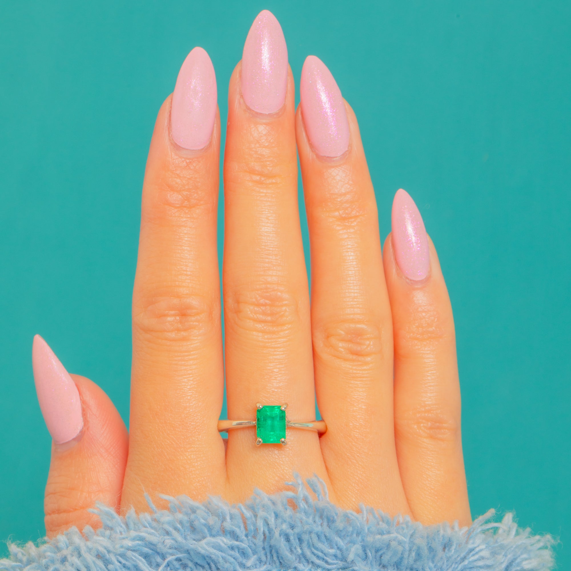 A timeless Emerald solitaire with crisp, architectural poise. The 1.02ct emerald-cut Emerald sits neatly in a four-claw basket with an open gallery, its step facets drawing the eye to that beautiful green glow. Sleek and minimalist, the clean lines let the gemstone take centre stage.