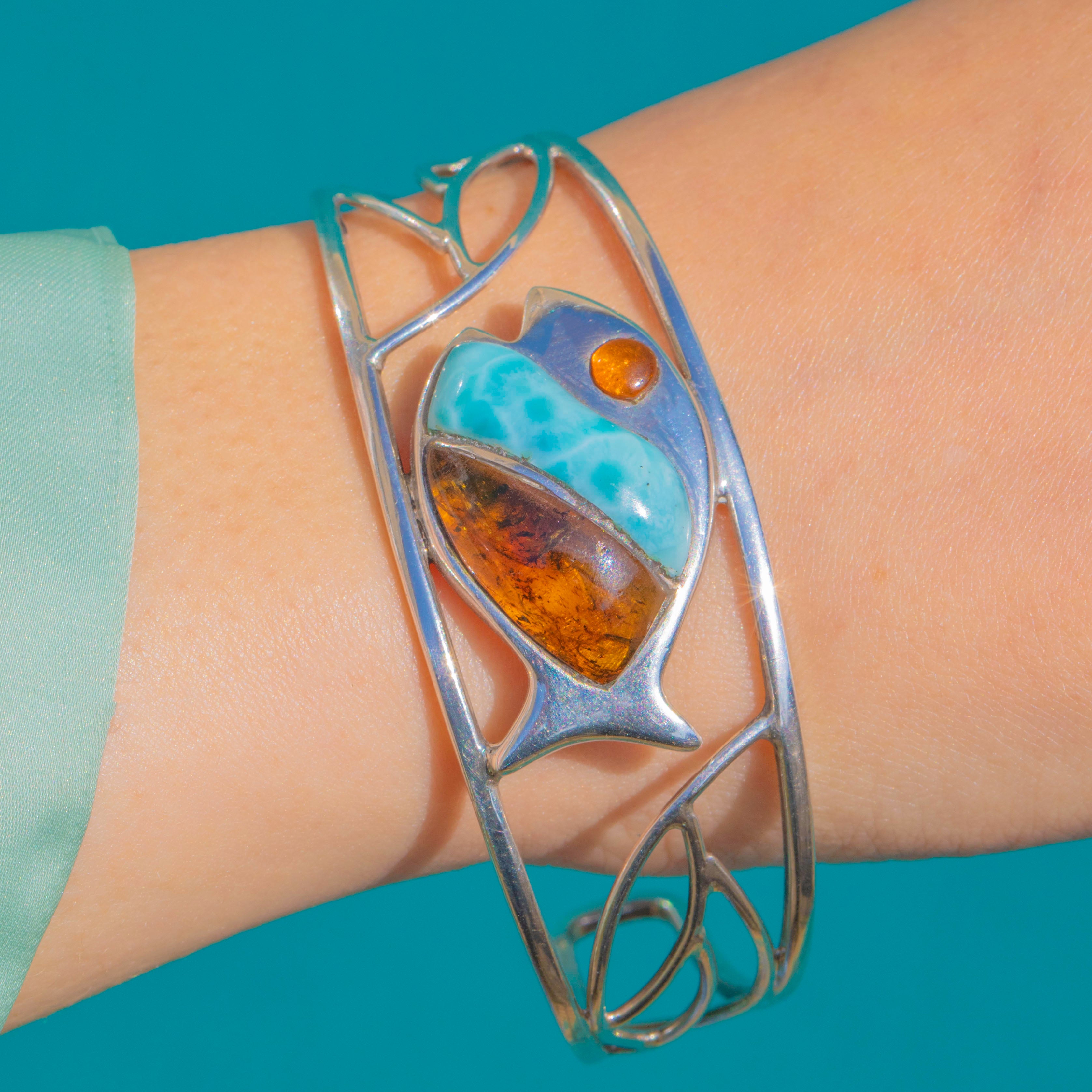 Bold, sculptural, and effortlessly wearable, this Vintage Sterling Silver fish bangle glides across the wrist with fluid openwork and a confident organic silhouette. An asymmetric cluster of smooth Amber and Howlite cabochons is cradled in sleek closed bezels, their textures and tones playing beautifully against the polished Silver framework.