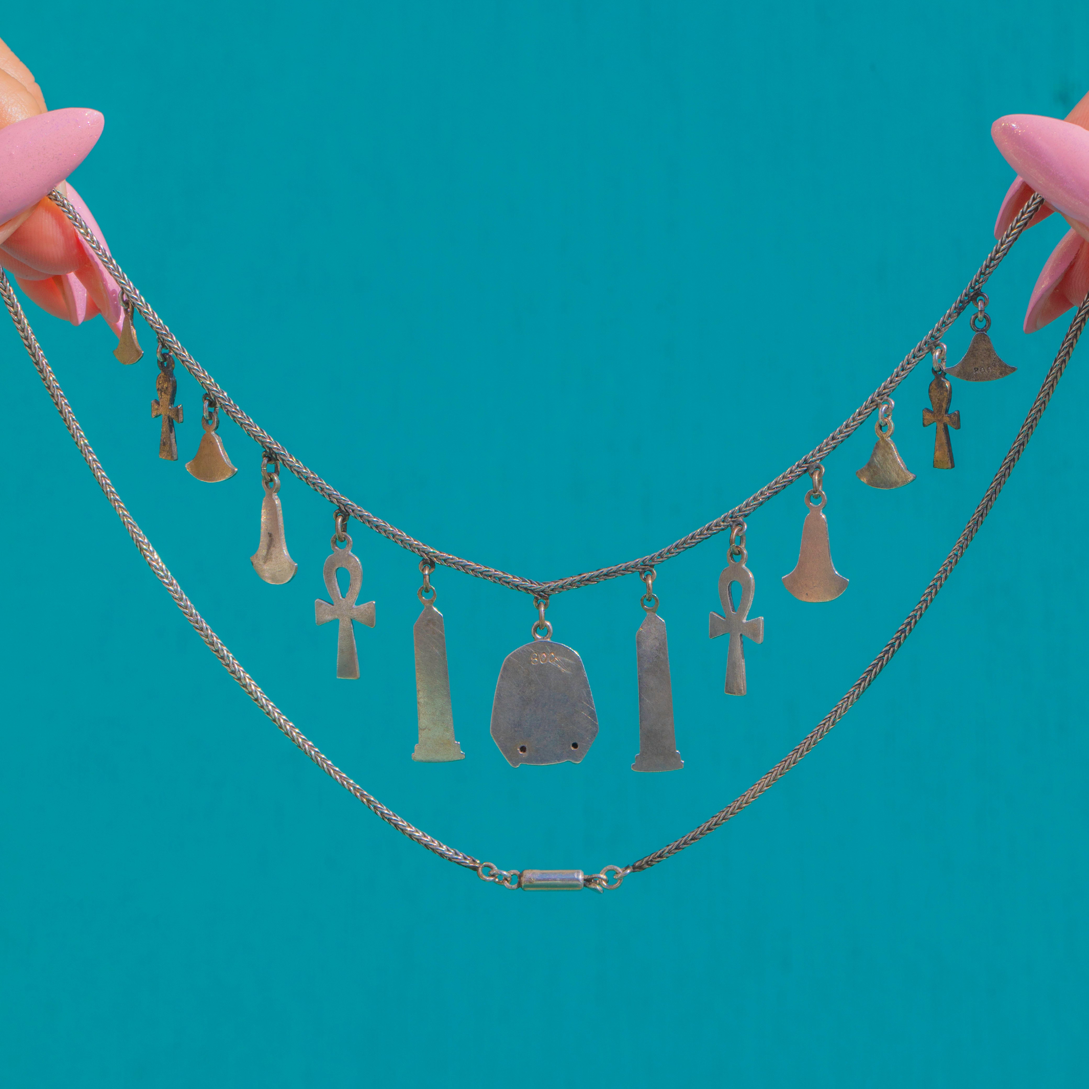 Stamped 800 to the reverse of the Tutankhamun head and testing as Silver, this piece captures the joy of mid-century Egyptian Revival design in a wearable, delicate scale. The Enamels read bright and graphic against the cool-toned metal—perfect worn solo or layered for a curated, eclectic look.