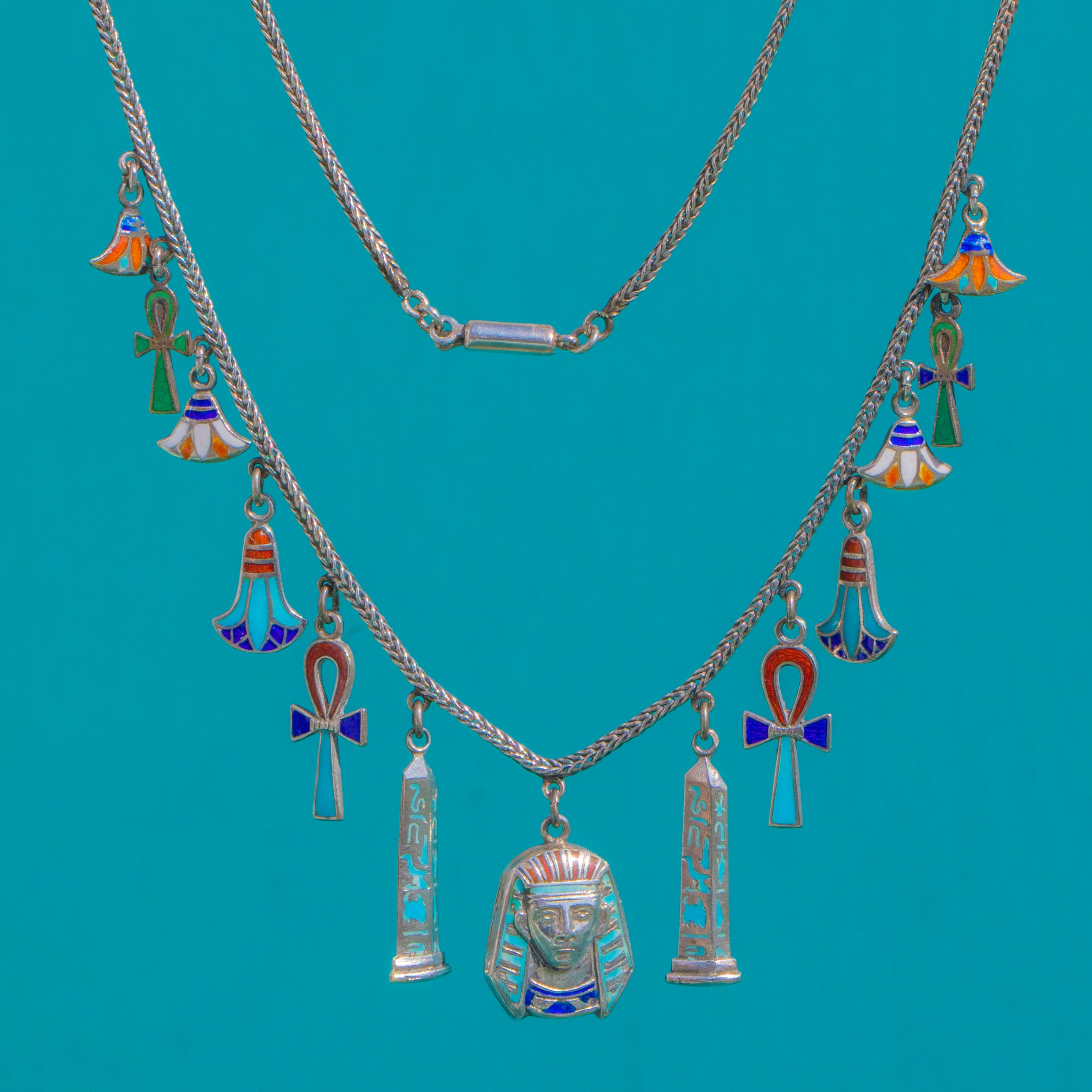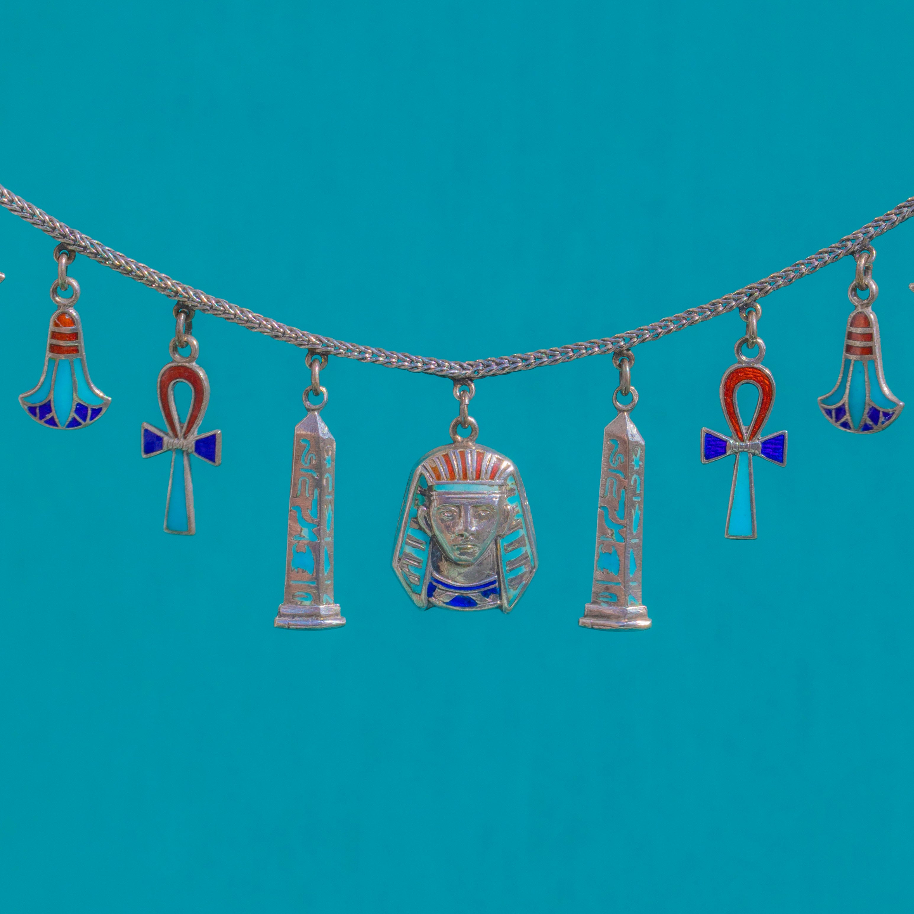 Vivid and full of movement, this Vintage Silver Egyptian Revival charm necklace brings together a rope chain with a parade of colourful Enamelled motifs. A bold Tutankhamun head sits among ankhs, cartouche and obelisk-style panels with hieroglyphic detailing, and lotus-like drops, each charm articulated on small jump rings for a playful, kinetic drape. The palette glows in turquoise, deep cobalt, green, orange-red and white, with a neat barrel clasp completing the collarbone-length silhouette.