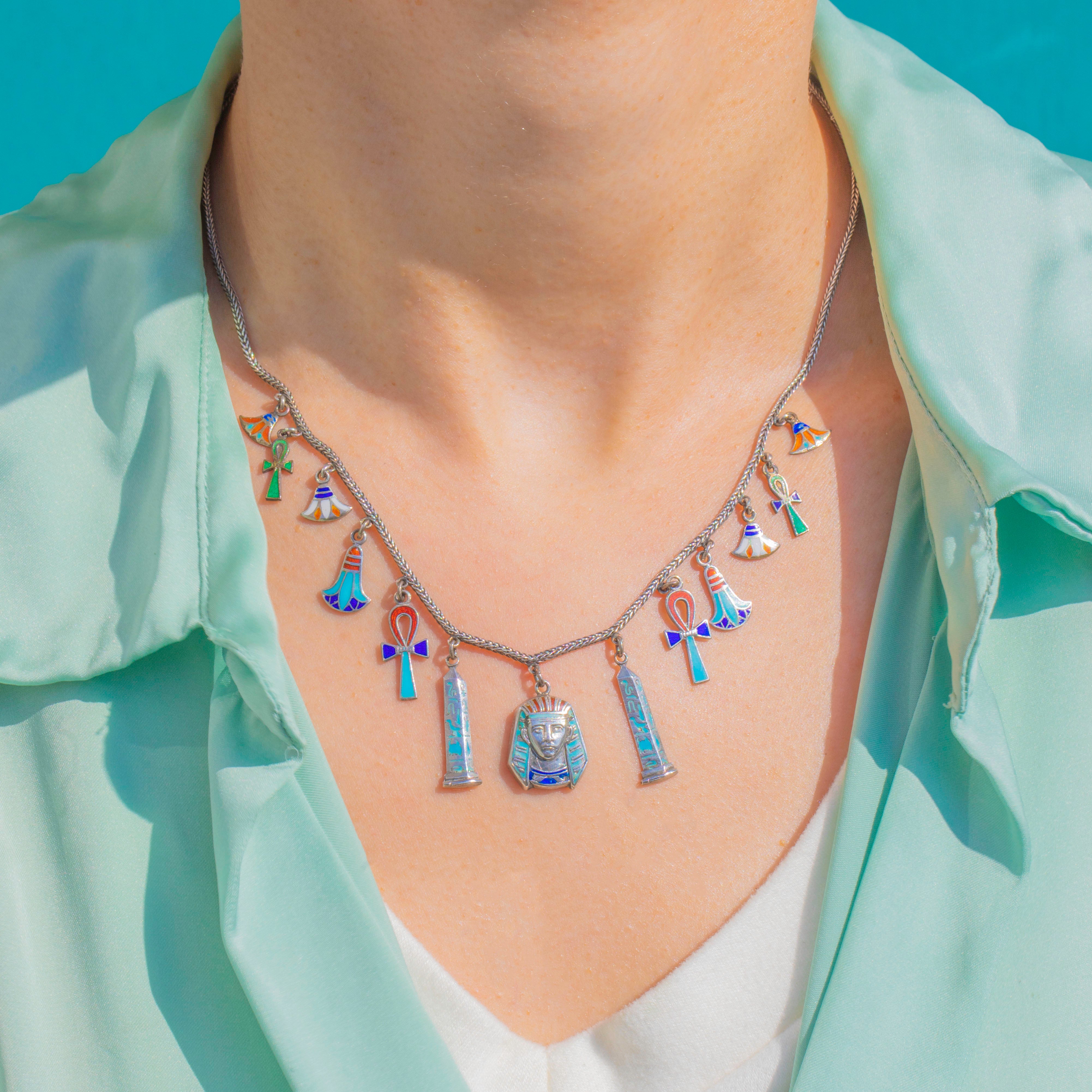 Art Deco Silver Egyptian Revival Enamel Necklace with Tutankhamen head