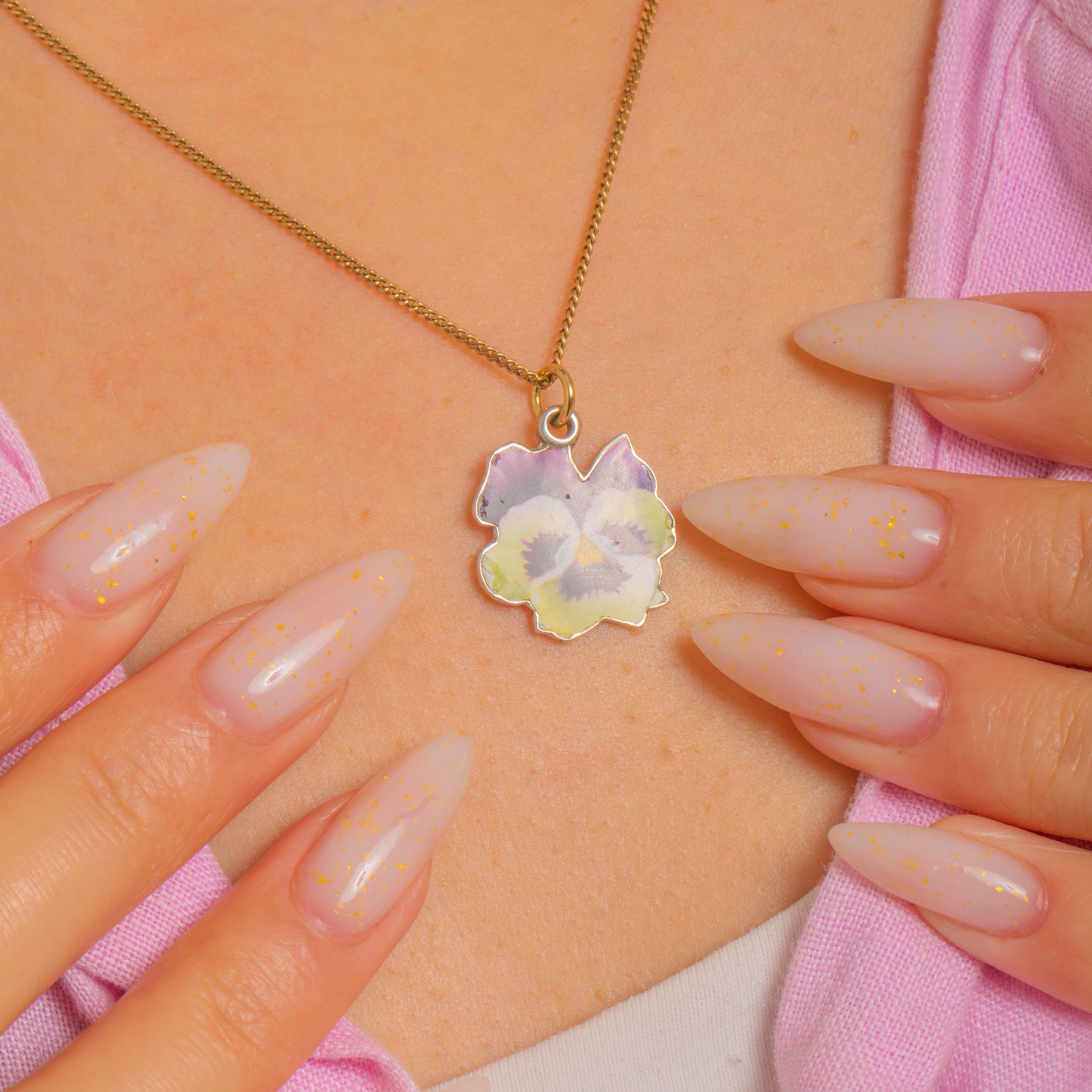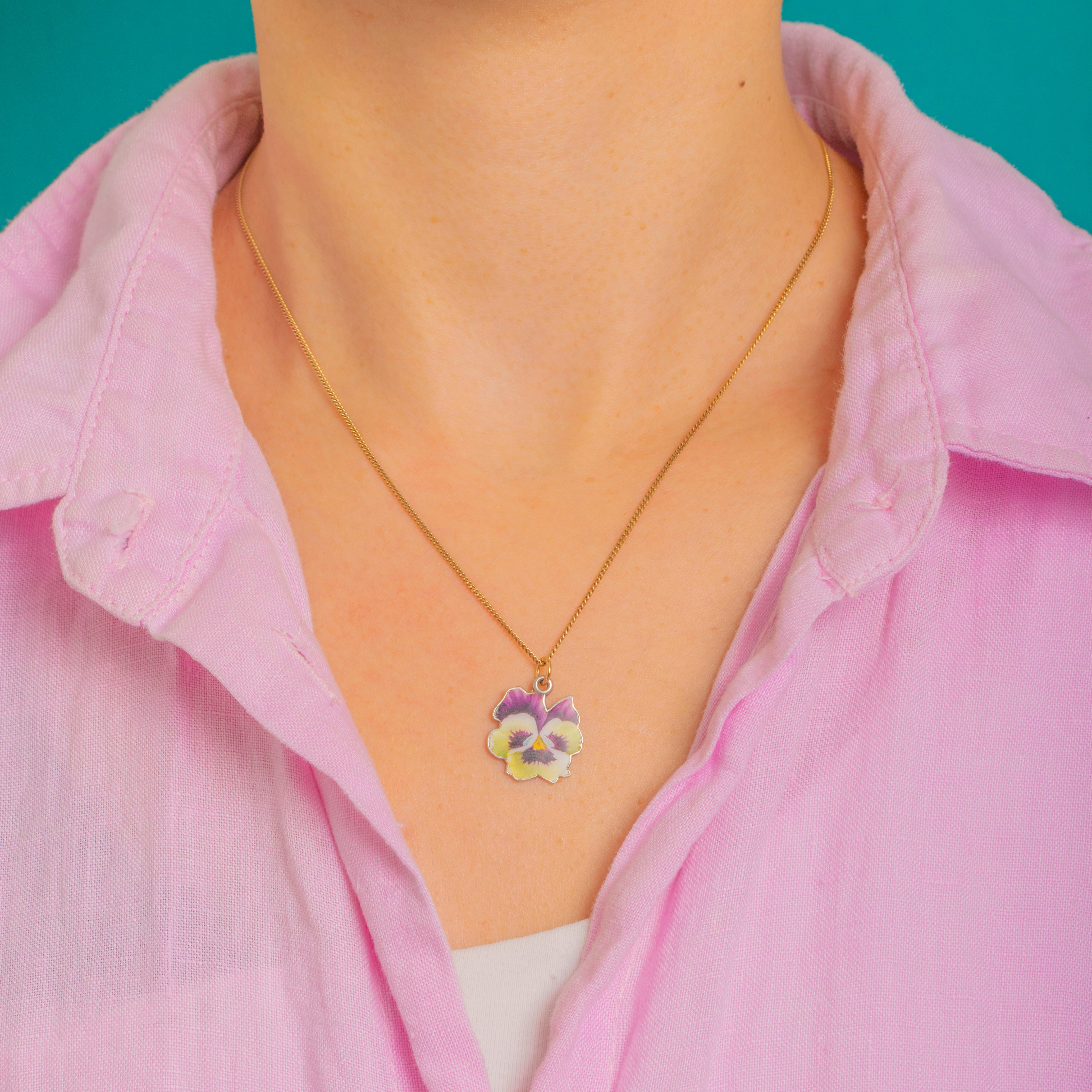 A dainty Vintage Silver enamel pansy charm, painted in romantic shades of violet, lilac, cream and pale yellow. The glossy petals are crisply defined and bordered by a fine Silver rim, capturing the timeless sentiment of the pansy in a petite, easy-to-wear form. A warm 9ct Gold jump ring offers a beautiful contrast to the cool Silvery tones.
