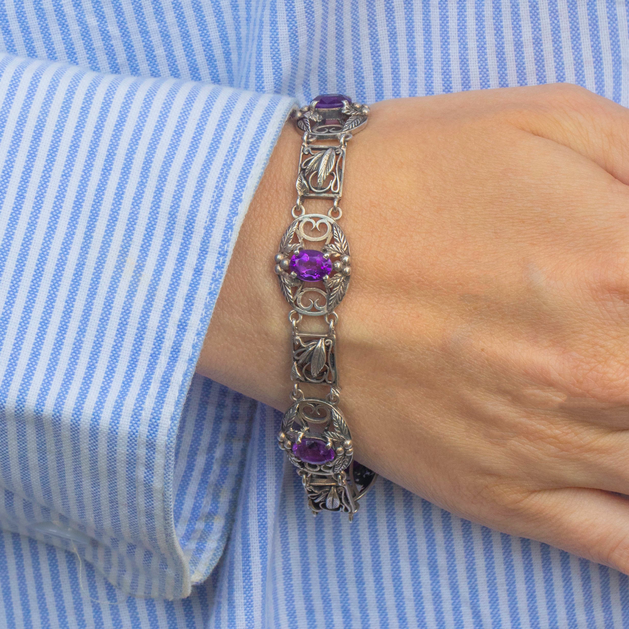 EXCELLENT. This Bernard Instone Style Silver openwork Amethyst bracelet is in excellent condition. The regal Amethysts are all present and in wonderful condition, with no scuffs or chips to note. Her gorgeous engraved Silver links have accrued a striking patina, and their bold detailing has remained crisp. All in all, this enchanting piece will make an outstanding addition to your jewellery collection!