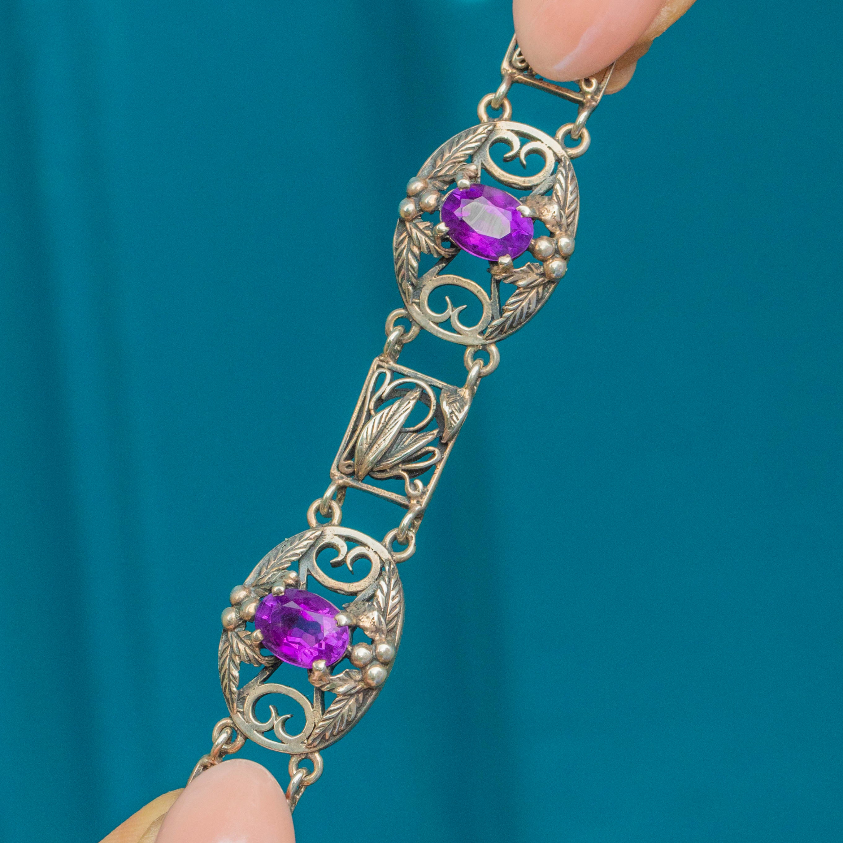 Make a statement in the most exquisite way with this phenomenal Bernard Instone Style Silver openwork Amethyst bracelet! Paying homage to the Arts and Crafts jeweller Bernard Instone, this vintage bracelet boasts intricately formed foliate details and curvaceous links framing vivid royal purple Amethysts.