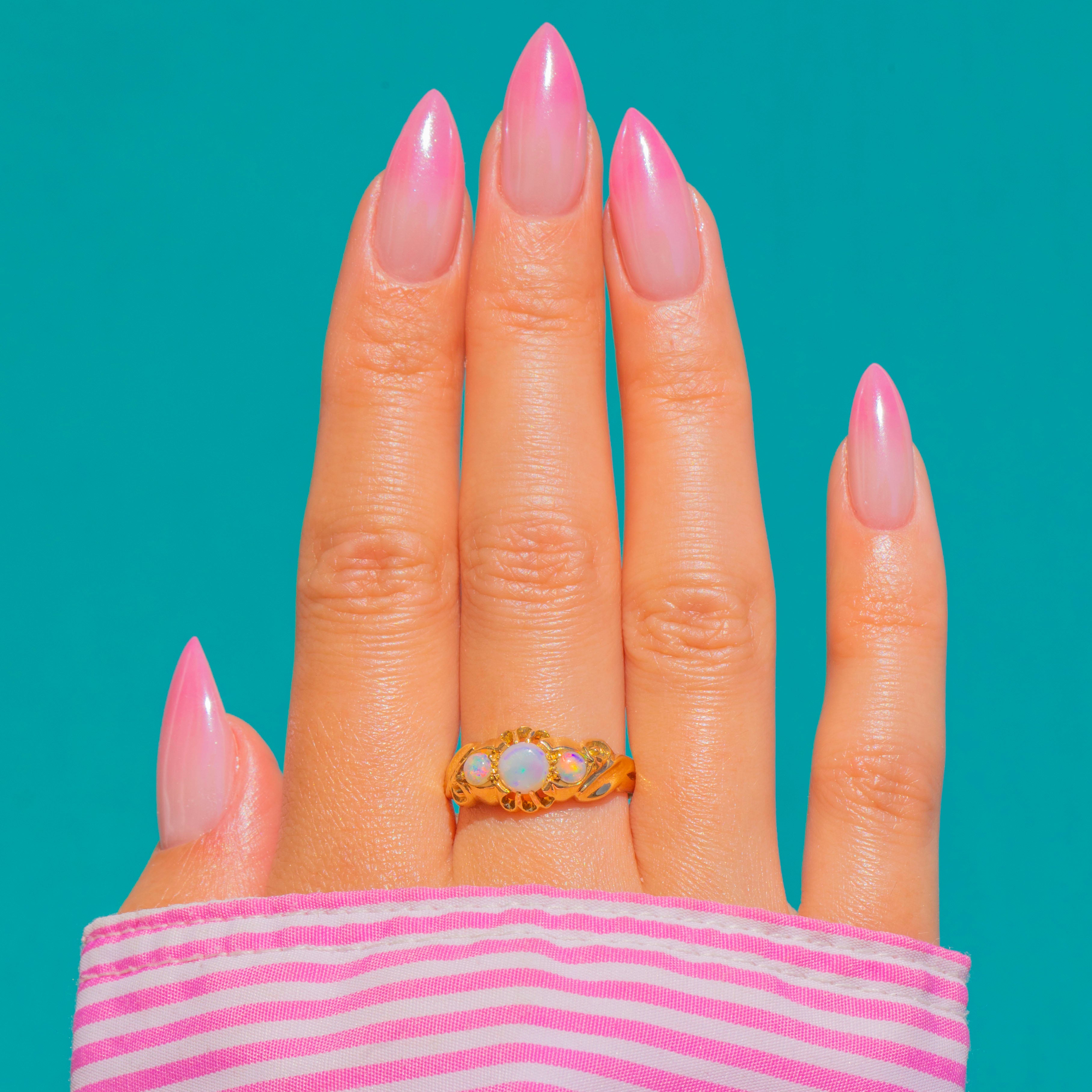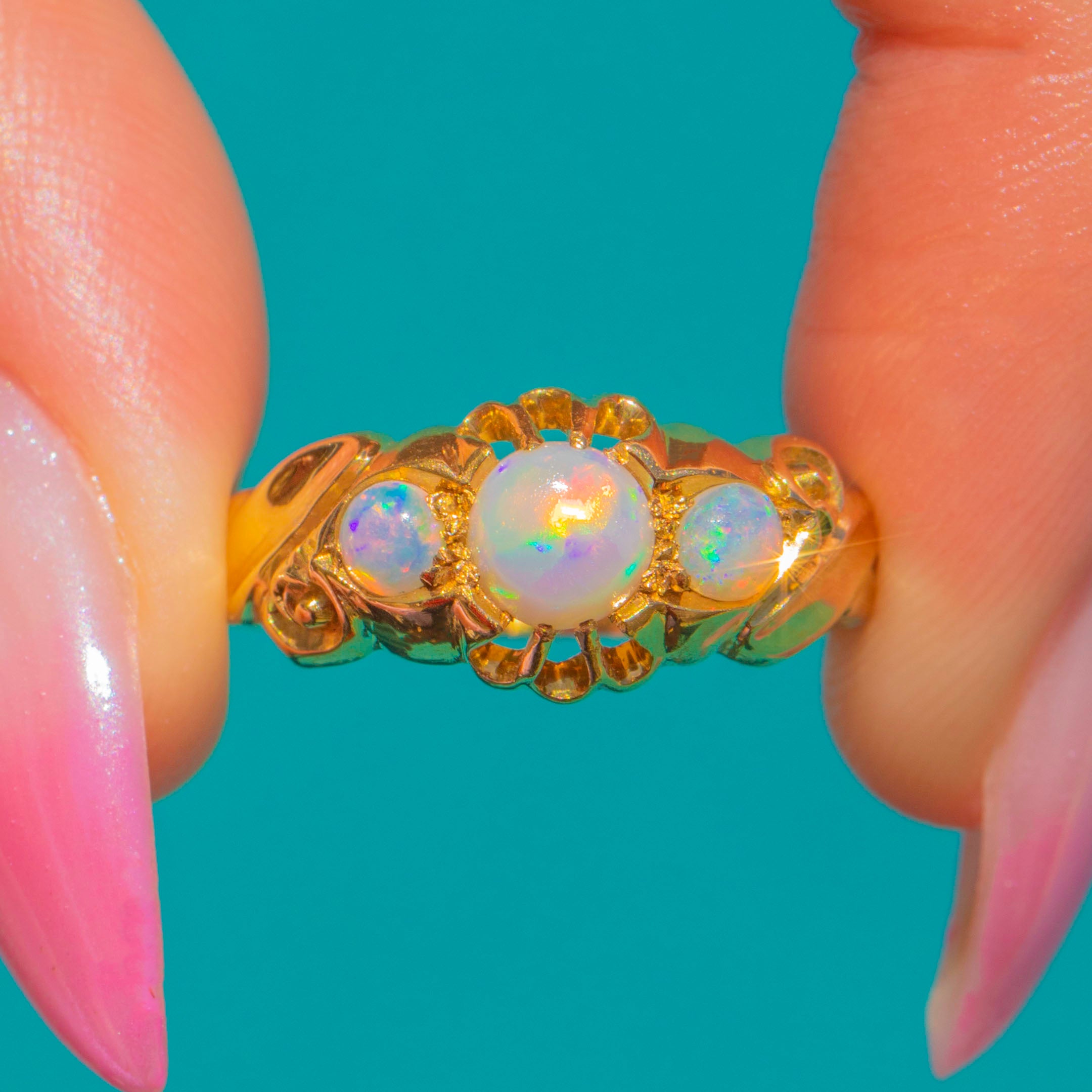 A luminous Edwardian three-stone Opal ring in rich 18ct Gold, hallmarked for Chester 1909. A larger domed Opal takes centre stage, flanked by two smaller cabochons that dance with vivid play-of-colour in blues, greens, pinks and warm ember flashes. Each Opal is cradled in scalloped collet settings above a delicately pierced under-gallery for a light, lacy presence on the finger.