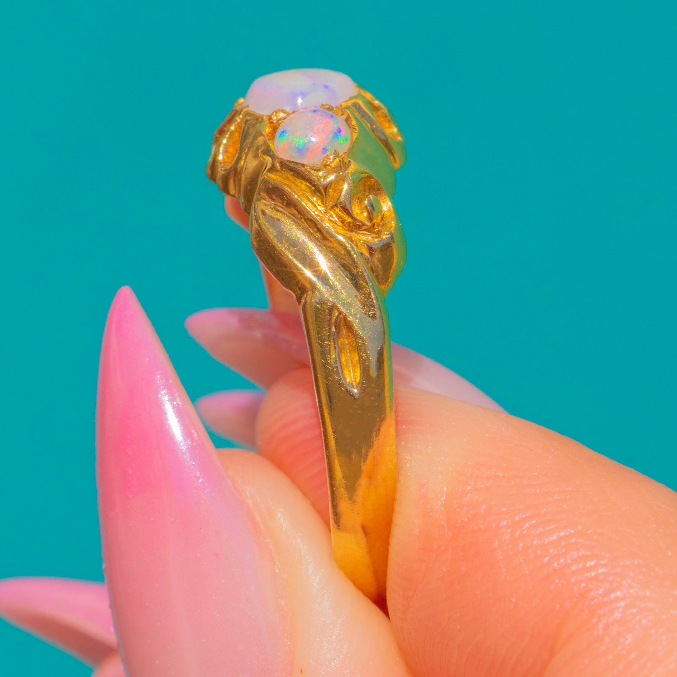 EXCELLENT: The Opal cabochons are bright and secure with no chips or abrasions visible, showing lively play-of-colour. The scalloped settings, shoulders and shank display only light surface wear and fine polishing marks, in line with age and careful wear. No evidence of later resizing or repair observed, with the ring presenting beautifully and ready to wear.